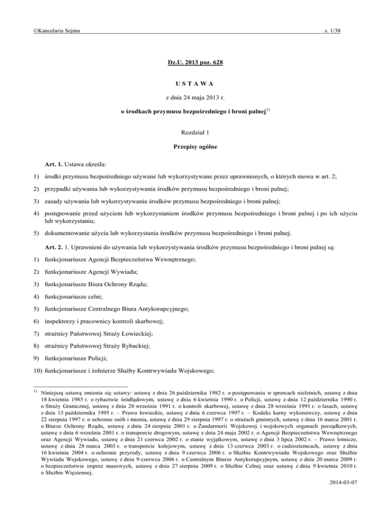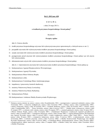 ©Kancelaria Sejmu s. 1/38 Dz.U. 2013 poz. 628 USTAWA z dnia 24 maja 2013 r. o środkach przymusu bezpośredniego i broni palnej1) Rozdział 1 Przepisy ogólne Art. 1. Ustawa określa: 1) środki przymusu bezpośredniego używane lub wykorzystywane przez uprawnionych, o których mowa w art. 2; 2) przypadki używania lub wykorzystywania środków przymusu bezpośredniego i broni palnej; 3) zasady używania lub wykorzystywania środków przymusu bezpośredniego i broni palnej; 4) postępowanie przed użyciem lub wykorzystaniem środków przymusu bezpośredniego i broni palnej i po ich użyciu lub wykorzystaniu; 5) dokumentowanie użycia lub wykorzystania środków przymusu bezpośredniego i broni palnej. Art. 2. 1. Uprawnieni do używania lub wykorzystywania środków przymusu bezpośredniego i broni palnej są: 1) funkcjonariusze Agencji Bezpieczeństwa Wewnętrznego; 2) funkcjonariusze Agencji Wywiadu; 3) funkcjonariusze Biura Ochrony Rządu; 4) funkcjonariusze celni; 5) funkcjonariusze Centralnego Biura Antykorupcyjnego; 6) inspektorzy i pracownicy kontroli skarbowej; 7) strażnicy Państwowej Straży Łowieckiej; 8) strażnicy Państwowej Straży Rybackiej; 9) funkcjonariusze Policji; 10) funkcjonariusze i żołnierze Służby Kontrwywiadu Wojskowego; 1) Niniejszą ustawą zmienia się ustawy: ustawę z dnia 26 października 1982 r. o postępowaniu w sprawach nieletnich, ustawę z dnia 18 kwietnia 1985 r. o rybactwie śródlądowym, ustawę z dnia 6 kwietnia 1990 r. o Policji, ustawę z dnia 12 października 1990 r. o Straży Granicznej, ustawę z dnia 28 września 1991 r. o kontroli skarbowej, ustawę z dnia 28 września 1991 r. o lasach, ustawę z dnia 13 października 1995 r. – Prawo łowieckie, ustawę z dnia 6 czerwca 1997 r. – Kodeks karny wykonawczy, ustawę z dnia 22 sierpnia 1997 r. o ochronie osób i mienia, ustawę z dnia 29 sierpnia 1997 r. o strażach gminnych, ustawę z dnia 16 marca 2001 r. o Biurze Ochrony Rządu, ustawę z dnia 24 sierpnia 2001 r. o Żandarmerii Wojskowej i wojskowych organach porządkowych, ustawę z dnia 6 września 2001 r. o transporcie drogowym, ustawę z dnia 24 maja 2002 r. o Agencji Bezpieczeństwa Wewnętrznego oraz Agencji Wywiadu, ustawę z dnia 21 czerwca 2002 r. o stanie wyjątkowym, ustawę z dnia 3 lipca 2002 r. – Prawo lotnicze, ustawę z dnia 28 marca 2003 r. o transporcie kolejowym, ustawę z dnia 13 czerwca 2003 r. o cudzoziemcach, ustawę z dnia 16 kwietnia 2004 r. o ochronie przyrody, ustawę z dnia 9 czerwca 2006 r. o Służbie Kontrwywiadu Wojskowego oraz Służbie Wywiadu Wojskowego, ustawę z dnia 9 czerwca 2006 r. o Centralnym Biurze Antykorupcyjnym, ustawę z dnia 20 marca 2009 r. o bezpieczeństwie imprez masowych, ustawę z dnia 27 sierpnia 2009 r. o Służbie Celnej oraz ustawę z dnia 9 kwietnia 2010 r. o Służbie Więziennej. 2014-03-07 ©Kancelaria Sejmu s. 2/38 11) funkcjonariusze Służby Więziennej; 12) funkcjonariusze i żołnierze Służby Wywiadu Wojskowego; 13) strażnicy straży gminnych (miejskich); 14) funkcjonariusze Straży Granicznej; 15) strażnicy Straży Leśnej; 16) strażnicy Straży Marszałkowskiej; 17) funkcjonariusze straży ochrony kolei; 18) funkcjonariusze Straży Parku; 19) żołnierze Żandarmerii Wojskowej lub wojskowych organów porządkowych; 20) pracownicy ochrony uprawnieni do użycia lub wykorzystania środków przymusu bezpośredniego lub broni palnej na podstawie przepisów ustawy z dnia 22 sierpnia 1997 r. o ochronie osób i mienia (Dz. U. z 2005 r. Nr 145, poz. 1221, z późn. zm.2)); 21) inspektorzy Inspekcji Transportu Drogowego. 2. Uprawnieni do używania lub wykorzystywania środków przymusu bezpośredniego są: 1) członkowie służby porządkowej, o których mowa w ustawie z dnia 20 marca 2009 r. o bezpieczeństwie imprez masowych (Dz. U. z 2013 r. poz. 611); 2) pracownicy zakładów poprawczych, schronisk dla nieletnich lub młodzieżowych ośrodków wychowawczych. Art. 3. Ustawy nie stosuje się do przymusu bezpośredniego lub zasad użycia lub wykorzystania broni palnej, o których mowa w: 1) ustawie z dnia 21 listopada 1967 r. o powszechnym obowiązku obrony Rzeczypospolitej Polskiej (Dz. U. z 2012 r. poz. 461, z późn. zm.3)); 2) ustawie z dnia 26 października 1982 r. o wychowaniu w trzeźwości i przeciwdziałaniu alkoholizmowi (Dz. U. z 2012 r. poz. 1356); 3) ustawie z dnia 12 października 1990 r. o Straży Granicznej (Dz. U. z 2011 r. Nr 116, poz. 675, z późn. zm.4)) oraz ustawie z dnia 12 października 1990 r. o ochronie granicy państwowej (Dz. U. z 2009 r. Nr 12, poz. 67, z późn. zm.5)) – w zakresie działań podejmowanych wobec statków morskich i powietrznych; 4) ustawie z dnia 19 sierpnia 1994 r. o ochronie zdrowia psychicznego (Dz. U. z 2011 r. Nr 231, poz. 1375); 5) ustawie z dnia 21 sierpnia 1997 r. o ochronie zwierząt (Dz. U. z 2003 r. Nr 106, poz. 1002, z późn. zm.6)); 6) ustawie z dnia 5 grudnia 2008 r. o zapobieganiu oraz zwalczaniu zakażeń i chorób zakaźnych u ludzi (Dz. U. Nr 234, poz. 1570, z późn. zm.7)). 2) 3) 4) 5) 6) 7) Zmiany tekstu jednolitego wymienionej ustawy zostały ogłoszone w Dz. U. z 2006 r. Nr 104, poz. 708, z 2008 r. Nr 171, poz. 1055 i Nr 180, poz. 1112, z 2009 r. Nr 98, poz. 817, z 2010 r. Nr 47, poz. 278, Nr 182, poz. 1228 i Nr 229, poz. 1496, z 2011 r. Nr 106, poz. 622, Nr 170, poz. 1015 i Nr 171, poz. 1016, z 2012 r. poz. 908 oraz z 2013 r. poz. 628. Zmiany tekstu jednolitego wymienionej ustawy zostały ogłoszone w Dz. U. z 2012 r. poz. 1101, 1407 i 1445. Zmiany tekstu jednolitego wymienionej ustawy zostały ogłoszone w Dz. U. z 2011 r. Nr 117, poz. 677, Nr 170, poz. 1015, Nr 171, poz. 1016 i Nr 230, poz. 1371 oraz z 2012 r. poz. 627, 664, 769 i 951. Zmiany tekstu jednolitego wymienionej ustawy zostały ogłoszone w Dz. U. z 2010 r. Nr 164, poz. 1108 oraz z 2011 r. Nr 50, poz. 255 i Nr 217, poz. 1280. Zmiany tekstu jednolitego wymienionej ustawy zostały ogłoszone w Dz. U. z 2004 r. Nr 69, poz. 625, Nr 9
