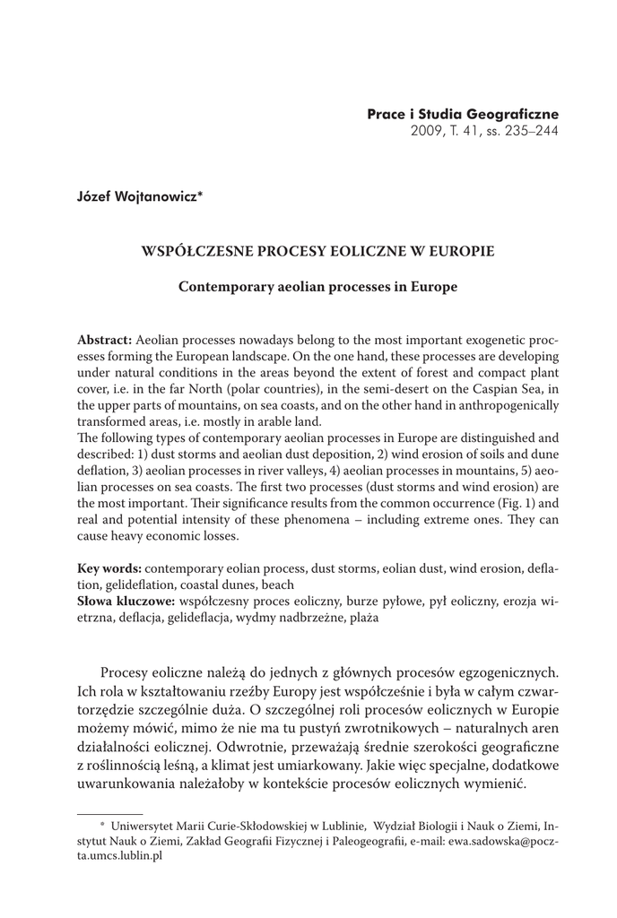 Prace i Studia Geograficzne 2009, T. 41, ss. 235–244 Józef Wojtanowicz* WSPÓŁCZESNE PROCESY EOLICZNE W EUROPIE Contemporary aeolian processes in Europe Abstract: Aeolian processes nowadays belong to the most important exogenetic processes forming the European landscape. On the one hand, these processes are developing under natural conditions in the areas beyond the extent of forest and compact plant cover, i.e. in the far North (polar countries), in the semi-desert on the Caspian Sea, in the upper parts of mountains, on sea coasts, and on the other hand in anthropogenically transformed areas, i.e. mostly in arable land. The following types of contemporary aeolian processes in Europe are distinguished and described: 1) dust storms and aeolian dust deposition, 2) wind erosion of soils and dune deflation, 3) aeolian processes in river valleys, 4) aeolian processes in mountains, 5) aeolian processes on sea coasts. The first two processes (dust storms and wind erosion) are the most important. Their significance results from the common occurrence (Fig. 1) and real and potential intensity of these phenomena – including extreme ones. They can cause heavy economic losses. Key words: contemporary eolian process, dust storms, eolian dust, wind erosion, deflation, gelideflation, coastal dunes, beach Słowa kluczowe: współczesny proces eoliczny, burze pyłowe, pył eoliczny, erozja wietrzna, deflacja, gelideflacja, wydmy nadbrzeżne, plaża Procesy eoliczne należą do jednych z głównych procesów egzogenicznych. Ich rola w kształtowaniu rzeźby Europy jest współcześnie i była w całym czwartorzędzie szczególnie duża. O szczególnej roli procesów eolicznych w Europie możemy mówić, mimo że nie ma tu pustyń zwrotnikowych – naturalnych aren działalności eolicznej. Odwrotnie, przeważają średnie szerokości geograficzne z roślinnością leśną, a klimat jest umiarkowany. Jakie więc specjalne, dodatkowe uwarunkowania należałoby w kontekście procesów eolicznych wymienić. * Uniwersytet Marii Curie-Skłodowskiej w Lublinie, Wydział Biologii i Nauk o Ziemi, Instytut Nauk o Ziemi, Zakład Geografii Fizycznej i Paleogeografii, e-mail: [email protected] 236 Józef Wojtanowicz Po pierwsze, Europa, mimo że jest małym kontynentem, jest bardzo zróżnicowana pod względem warunków przyrodniczych. Krańce północne Europy leżą poza zasięgiem geograficznej granicy lasów. Z kolei w Europie SE występuje południowa granica lasów a na południe od stepów mamy słone półpustynie. Także w wysokich górach Europy występuje górna granica lasu. Dogodną areną działalności eolicznej są także duże doliny rzeczne i wybrzeża morskie o wyjątkowo długiej linii. Po drugie, w czwartorzędzie zaistniały w Europie warunki niezwykle sprzyjające do rozwoju procesów eolicznych. Europa była wielokrotnie zlodowacona, a po zlodowaceniach tych pozostały miąższe pokrywy osadów luźnych, terrygenicznych, łatwo podlegających deflacji. Działalność eoliczna szczególnie silnie zaznaczyła się w strefach peryglacjalnych, związanych z poszczególnymi zlodowaceniami, które za każdym razem zajmowały rozległe obszary Europy. W efekcie powstały lessy, pokrywy pylaste i wydmy śródlądowe. W holocenie powstały wydmy nadbrzeżne. Po trzecie wreszcie, Europa ma krajobraz silnie przekształcony w wyniku gospodarczej działalności człowieka. Jest to krajobraz rolniczy, w którym grunty orne przeważają nad obszarami leśnymi. Ten czynnik zdecydowanie wpłynął na zwiększenie zasięgu przestrzennego oddziaływania współczesnych procesów eolicznych. W konsekwencji około 70% powierzchni Europy jest pod wpływem mniej lub bardziej efektywnej działalności eolicznej. Przedstawione powyżej uwarunkowania, zarówno te naturalne, jak i antropogeniczne, pozwalają wydzielić następujące typy współczesnych procesów eolicznych w Europie: 1. Burze pyłowe i opad pyłu eolicznego 2. Erozja wietrzna gleb i rozwiewanie wydm 3. Procesy eoliczne w dolinach rzecznych 4. Procesy eoliczne w górach 5. Procesy eoliczne na wybrzeżach morskich BURZE PYŁOWE I OPAD PYŁU EOLICZNEGO Burze pyłowe należą do ekstremalnych procesów eolicznych. Powstają przy silnych wiatrach – powyżej 10 m/s i wywołują zjawisko głębokiej masowej deflacji oraz daleki najczęściej transport materii skalnej frakcji pylastej (Nalivkin 1969; Wojtanowicz 1972, 1976, 2007). Europa w znacznym stopniu objęta jest działaniem burz pyłowych, co dokumentuje przedstawiona mapa (ryc. 1). Wydzielają się dwa różne genetycznie obszary burzowe. Pierwszy z nich wiąże się z burzami występującymi w Europie południowo-wschodniej, na stepach Ukrainy i Rosji. To rodzimy, europejski, Współczesne procesy eoliczne w Europie 237 Ryc. 1. Burze pyłowe i opad pyłu eolicznego w Europie 1 – obszar występowania burz pyłowych, 2 – obszar opadu pyłu pochodzenia europejskiego, 3 – obszar opadu pyłu pochodzenia afrykańskiego, 4 – kierunki nawiewania pyłu eolicznego. Fig. 1. Dust storms and aeolian dust deposition in Europe 1 – area of dust storm occurrence, 2 – deposition area of dust of European origin, 3 – deposition area of dust of African origin, 4 – directions of aeolian dust blowing. autochtoniczny obszar burz pyłowych. Tu rodzą się burze, a w ich efekcie wynoszone są pyły eoliczne, głównie do Europy środkowej, m.in. do Polski i do Skandynawii. Burze pyłowe tego pierwszego typu mają w jakimś stopniu podłoże antropogeniczne, powstają bowiem na obszarze gruntów ornych. Podobny typ mają burze pyłowe na preriach Ameryki Północnej. Europejskie burze pyłowe występują corocznie, a szczególnie silne burze powtarzają się średnio co 10 lat (Vasiliev i in. 1988). Drugi typ obszarów burzowych w Europie to obszar opadu pyłu eolicznego pochodzenia afrykańskiego. Obejmuje on głównie Europę Południową i Europę Zachodnią (Rapp, Nihlén 1991; Littmann 1991). Są to p