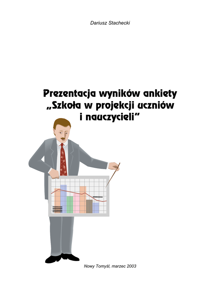 Dariusz Stachecki Prezentacja wyników ankiety „Szkoła w projekcji uczniów i nauczycieli” Nowy Tomyśl, marzec 2003 Dariusz Stachecki PREZENTACJA WYNIKÓW ANKIETY „ SZKOŁA W PROJEKCJI UCZNIÓW I NAUCZYCIELI” Wstęp Badaniami została objęta grupa uczniów i nauczycieli Gimnazjum w Nowym Tomyślu. Badanie polegało na wypełnieniu anonimowo ankiety przygotowanej przez Wydział Studiów Edukacyjnych Uniwersytetu im. Adama Mickiewicza w Poznaniu. Ankietę wypełniło 153 uczniów klasy trzeciej gimnazjum – 78 chłopców i 75 dziewcząt oraz 31 nauczycieli – 19 kobiet i 12 mężczyzn. Wszyscy badani – zarówno uczniowie jak i nauczyciele zostali zapoznani ze sposobem wypełnienia ankiety. Wszyscy otrzymali informację, iż ankieta zawiera pewne sytuacje, które w niektórych szkołach są sytuacjami bądź zjawiskami typowymi, a zadaniem ankietowanego jest wskazanie czy zjawisko to występuje w jego szkole i z jaka częstotliwością. Druga część ankiety dotyczyła pewnych wzorcowych, hipotetycznych wzorów zachowań, odczuć oraz różnych okoliczności, które można spotkać w praktyce oświatowej. Zadaniem ankietowanego było zaznaczenie w odpowiedniej rubryce swojego stosunku do nich, poprzez wybranie jednej spośród następujących odpowiedzi: tak, raczej tak, raczej nie i nie. Wyniki ankiety prezentuję na następnych stronach niniejszego opracowania posługując się ilustracja tabelaryczna i graficzną. Wszystkie wyniki są również podane w postaci ilościowej i procentowej z rozróżnieniem na płeć ankietowanych osób. strona 2 Dariusz Stachecki PREZENTACJA WYNIKÓW ANKIETY „ SZKOŁA W PROJEKCJI UCZNIÓW I NAUCZYCIELI” Wyniki ankiety – uczniowie. Uczniowie mieli określić częstotliwość występowania pewnych sytuacji, które zostały przedstawione jako zdarzające się w pewnej szkole, w swojej szkole. Sytuacja 1. W jednej ze szkół stale giną pomoce naukowe, niszczy się książki z biblioteki szkolnej, rysuje po ścianach, psuje ławki i dewastuje toalety. Nr odp. 1 2 3 4 5 6 Liczba uczniów 17 37 41 21 32 5 Odpowiedź zdarza się to prawie codziennie kilka razy w tygodniu kilka razy w miesiącu raz na 2, 3 miesiące rzadziej wcale 45 40 35 30 25 20 15 10 5 0 1 2 3 4 5 Procent 11,11% 24,18% 26,80% 13,73% 20,92% 3,27% 6 Sytuacja 2. W szkole panuje swobodna atmosfera: uczniowie często spóźniają się na lekcje, opuszczają poszczególne godziny, nie przynoszą zeszytów i zadań domowych, wychodzą na przerwach poza obręb szkoły itd. Nr odp. 1 2 3 4 5 6 Odpowiedź zdarza się to prawie codziennie kilka razy w tygodniu kilka razy w miesiącu raz na 2, 3 miesiące rzadziej wcale strona 3 Liczba uczniów 73 38 13 8 17 4 Procent 47,71 % 24,84 % 8,50 % 5,23 % 11,11 % 2,61 % Dariusz Stachecki PREZENTACJA WYNIKÓW ANKIETY „ SZKOŁA W PROJEKCJI UCZNIÓW I NAUCZYCIELI” 80 70 60 50 40 30 20 10 0 1 2 3 4 5 6 Sytuacja 3. Część uczniów bardzo ordynarnie odnosi się do nauczycieli, widać też lekceważenie i pogardę. Nr odp. 1 2 3 4 5 6 Liczba uczniów 55 35 30 9 15 8 Odpowiedź zdarza się to prawie codziennie kilka razy w tygodniu kilka razy w miesiącu raz na 2, 3 miesiące rzadziej wcale Procent 36,18 % 23,03 % 19,74 % 5, 92 % 9,87 % 5,26 % 60 50 40 30 20 10 0 1 2 3 4 5 6 Sytuacja 4. Na szkolnych przerwach starsi uczniowie dręczą uczniów słabszych i z młodszych klas, np. zabierają pieniądze. Nr odp. 1 2 3 4 5 6 Odpowiedź zdarza się to prawie codziennie kilka razy w tygodniu kilka razy w miesiącu raz na 2, 3 miesiące rzadziej wcale strona 4 Liczba uczniów 12 18 14 22 63 23 Procent 7,89 % 11,84 % 9,21 % 14,47 % 41,45 % 15,13 % Dariusz Stachecki PREZENTACJA WYNIKÓW ANKIETY „ SZKOŁA W PROJEKCJI UCZNIÓW I NAUCZYCIELI” 70 60 50 40 30 20 10 0 1 2 3 4 5 6 Sytuacja 5. Wiadomo, że na dyskotekach organizowanych przez szkołę, a czasem na wycieczkach, ukradkiem pije się piwo, a bywa, że i wino. Nr odp. 1 2 3 4 Odpowiedź praktycznie na każdej imprezie prawie na każdej sporadycznie wcale Liczba uczniów 36 46 48 23 Procent 23,53 % 30,07 % 31,37 % 15,03 % 50 40 30 20 10 0 1 2 3 4 Sytuacja 6. Niektórzy uczniowie palą papierosy i robia to także w szkole. Wszyscy znają miejsca, które służą za „palarnię”.. Nr odp. 1 2 3 4 Odpowiedź praktycznie na każdej przerwie prawie na każdej sporadycznie wcale strona 5 Liczba uczniów 92 40 13 8 Procent 60,13 % 26,14 % 8,50 % 5,23 % Dariusz Stachecki PREZENTACJA WYNIKÓW ANKIETY „ SZKOŁA W PROJEKCJI UCZNIÓW I NAUCZYCIELI” 100 80 60 40 20 0 1 2 3 4 Sytuacja 7. W szkole giną uczniom różne przedmioty, kradnie się wartościowe wyposażenie szkoły, a także kurtki, czapki uczniów. Nr odp. 1 2 3 4 Liczba uczniów 23 55 57 18 Odpowiedź zdarza się to często zdarza się to niekiedy zdarza się to sporadycznie wcale Procent 15,03 % 35,95 % 37,25 % 11,76 60 50 40 30 20 10 0 1 2 3 4 W drugiej części ankiety uczniowie analizowali rozmaite stany i uczucia, które wiążą się z chodzeniem do szkoły. W tabeli zaznaczali na ile zgadzają się ze stwierdzeniami, które zostały zaproponowane przez autorów. stwierdzenie 1. Bardzo męczący jest dla mnie tłok. odpowiedź tak raczej tak raczej nie nie uczniowie liczba procent 22 14,38 % 32 20,92 % 57 37,25 % 42 27,45 % dziewczęta liczba procent 7 9,33 % 12 16,00 % 33 44,00 % 23 21,33 % strona 6 chłopcy liczba procent 17 21,52 % 20 25,32 % 23 29,11 % 19 24,05 % Dariusz Stachecki PREZENTACJA WYNIKÓW ANKIETY „ SZKOŁA W PROJEKCJI UCZNIÓW I NAUCZYCIELI” 60 50 40 chłopcy 30 dziewczęta 20 10 0 TAK R. TAK R. NIE NIE stwierdzenie 2. Bardzo męczący jest dla mnie hałas. odpowiedź tak raczej tak raczej nie nie uczniowie liczba procent 24 15,89 % 32 21,19 % 53 35,10 % 42 27,81 % dziewczęta liczba procent 11 14,67 % 14 18,67 % 34 45,33 % 16 21,33 % chłopcy liczba procent 13 16,88 % 19 24,68 % 19 24,68 % 26 33,77 % 60 50 40 chłopcy 30 dziewczęta 20 10 0 TAK R. TAK R. NIE NIE stwierdzenie 3. Bardzo męczące jest ciągłe czek