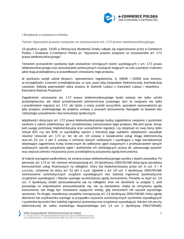 I Śniadanie e-Commerce Polska. Temat: Wyzwania prawne związane ze stosowaniem art. 172 prawa telekomunikacyjnego 10 grudnia o godz. 10:00 w Restauracji Akademia Smaku odbyło się organizowane przez e-Commerce Polska, I Śniadanie e-Commerce Polska pt. "Wyzwania prawne związane ze stosowaniem art. 172 prawa telekomunikacyjnego". Tematem przewodnim spotkania było omówienie istniejących barier wynikających z art. 172 prawa telekomunikacyjnego oraz poszukiwanie potencjalnych rozwiązań mających na celu usunięcie trudności jakie mają przedsiębiorcy w prawidłowym stosowaniu tego przepisu. W spotkaniu wzięli udział eksperci, reprezentanci regulatorów, tj. UOKIK i GIODO oraz biznesu, w szczególności zrzeszeń przedsiębiorców, w tym, poza Izbą Gospodarki Elektronicznej, Konfederacja Lewiatan. Debatę poprowadził radca prawny dr Dominik Lubasz z Kancelarii Lubasz i Wspólnicy Kancelaria Radców Prawnych. Zagadnienie stosowania art. 172 prawa telekomunikacyjnego budzi emocje nie tylko wśród przedsiębiorców, ale także przedstawicieli piśmiennictwa prawnego. Jest to związane nie tylko z przedmiotem regulacji art. 172, ale także, a może przede wszystkim, sposobem wprowadzenia go jako przepisu zmieniającego do projektu ustawy o prawach konsumenta. Nastąpiło to bowiem bez należytego uzasadnienia i bez konsultacji społecznych. Wątpliwości dotyczące art. 172 prawa telekomunikacyjnego budzą zagadnienia związane z pytaniami zarówno o zakres podmiotowy, jak i przedmiotowy zastosowania tego przepisu. Nie jest jasne, biorąc pod uwagę podstawę implementacyjną oraz uzasadnienie regulacji, czy obejmuje on swą mocą tylko relacje B2C czy też B2B, co wynikałoby wprost z literalnej jego wykładni. Wątpliwości wywołuje również stosunek art. 172 pr. tel. do art. 10 ustawy o świadczeniu usług drogą elektroniczną oraz art. 23 ust. 1 pkt 5 ustawy o ochronie danych osobowych i wynikające z tego konsekwencje obejmujące zagadnienia liczby koniecznych do odebrania zgód związanych z przetwarzaniem danych osobowych, sposób pozyskania zgód i podmiotów ich udzielających, prawa do „pierwszego pytania” oraz dopuszczalności inicjowania przez przedsiębiorcę pozyskania zgody konsumenta. W trakcie wystąpień podkreślano, że zmiana prawa telekomunikacyjnego wynika z dwóch powodów. Po pierwsze, art. 172 pr. tel. stanowi retranspozycję art. 10 dyrektywy 2002/65/WE dotyczącej sprzedaży konsumentom usług finansowych na odległość, który był implementowany przez art. 6 ust. 3 i 4 u.o.n.p.k., uchylonej na mocy art. 52 pkt 1 u.p.k. Zgodnie z art. 10 ust. 1 dyrektywy 2002/65/WE zastosowanie automatycznych urządzeń wywołujących bez ludzkiej ingerencji (automatyczne urządzenia wywołujące) i faksów wymaga wcześniejszej zgody konsumenta. Ponadto w myśl art. 10 ust. 2 dyrektywy środki porozumiewania się na odległość inne niż określone w ustępie 1, jeśli pozwalają na indywidualne porozumiewanie się, nie są dozwolone, chyba że otrzymano zgodę konsumenta, lub mogą być stosowane wyłącznie wtedy, gdy konsument nie wyraził wyraźnego sprzeciwu. Po drugie, nowelizacja uzupełnia transpozycję art. 13 dyrektywy 2002/58/WE, który zgody abonenta lub użytkownika wymaga w przypadku używania automatycznych systemów wywołujących i systemów łączności bez ludzkiej ingerencji (automatyczne urządzenia wywołujące), faksów lub poczty elektronicznej do celów marketingu bezpośredniego (art. 13 ust. 1 dyrektywy 2002/58/WE). Izba Gospodarki Elektronicznej (e-Izba) T + 48 500 390 172 E [email protected] I WWW.ECOMMERCEPOLSKA.PL A UL. MOKOTOWSKA 1, 00-640 WARSZAWA NIP 701-039—19-22 KRS 0000474028 1 Wybierając sposób regulacji dozwolony na podstawie art. 10 ust. 2 dyrektywy 2002/65/WE i art. 13 ust. 3 dyrektywy 2002/58/WE, ustawodawca polski zdecydował się na wdrożenie modelu opt-in, zgodnie z którym wymagana jest wyraźna zgoda, a nie modelu opt-out, w którym wystarczający jest brak wyrażenia przez konsumenta wyraźnego sprzeciwu, odpowiednio, w stosunku do innych środków porozumiewania się na odległość, jeśli pozwalają na indywidualne porozumiewanie się oraz w przypadku innych niezamówionych komunikatów do celów marketingu bezpośredniego. Wskazywano jednocześnie, że novum wynikającym z nowelizacji dokonywanej art. 48 u.p.k. jest konieczność uzyskiwania uprzedniej zgody abonenta lub użytkownika końcowego na używanie do celów marketingu bezpośredniego telekomunikacyjnych urządzeń końcowych. Telekomunikacyjnym urządzenie końcowym jest, zgodnie z art. 2 pkt 43 pr. telekom., urządzenie telekomunikacyjne przeznaczone do podłączenia bezpośrednio lub pośrednio do zakończeń sieci, a więc zatem np. telefon analogowy, cyfrowy, telefonii stacjonarnej lub mobilnej, telefaks, tablet czy wreszcie inne urządzenia lub ich części przeznaczone do podłączenia bezpośrednio lub pośrednio do zakończeń sieci, jak routery, modemy czy odpowiednio wyposażone komputery. Wprowadzona modyfikacja miała być uzasadniana uchyleniem przez ustawę o prawach konsumenta ustawy o ochronie niektórych praw konsumentów i odpowiedzialności za szkodę wyrządzoną przez produkt niebezpieczny, a w szczególności jej art. 6 ust. 3, który stanowił, że uprzedniej zgody konsumenta wymaga posłużenie się telefonem, wizjofonem, telefaksem, pocztą elektroniczną, automatycznym urządzeniem wywołującym lub innym środkiem komunikacji elektronicznej w celu złożenia propozycji zawarcia umowy. Zakres zastosowania art. 172 pr. tel. jest jednak istotnie szerszy niż dotychczasowego art. 6 ust. 3 ustawy o ochronie niektórych praw konsumentów, zarówno pod względem podmiotowym, jak i przedmiotowym ingerując istotnie w działalność podmiotów zajmujących się marketingiem bezpośrednim. Jednocześnie przedstawiciel UOKIK p. Łukasz Wroński podkreślał, że przepis ar. 172 pr. tel. Wypełnia lukę legislacyjną i lepiej za