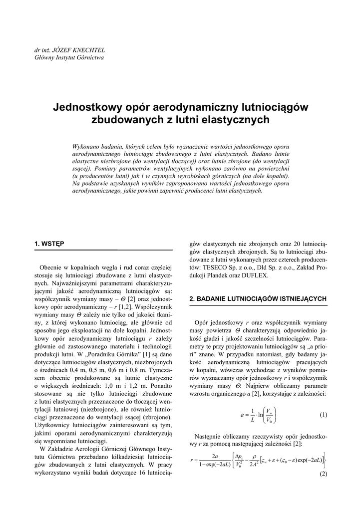 dr inż. JÓZEF KNECHTEL Główny Instytut Górnictwa Jednostkowy opór aerodynamiczny lutniociągów zbudowanych z lutni elastycznych Wykonano badania, których celem było wyznaczenie wartości jednostkowego oporu aerodynamicznego lutniociągu zbudowanego z lutni elastycznych. Badano lutnie elastyczne niezbrojone (do wentylacji tłoczącej) oraz lutnie zbrojone (do wentylacji ssącej). Pomiary parametrów wentylacyjnych wykonano zarówno na powierzchni (u producentów lutni) jak i w czynnych wyrobiskach górniczych (na dole kopalni). Na podstawie uzyskanych wyników zaproponowano wartości jednostkowego oporu aerodynamicznego, jakie powinni zapewnić producenci lutni elastycznych. 1. WSTĘP Obecnie w kopalniach węgla i rud coraz częściej stosuje się lutniociągi zbudowane z lutni elastycznych. Najważniejszymi parametrami charakteryzującymi jakość aerodynamiczną lutniociągów są: współczynnik wymiany masy – Θ [2] oraz jednostkowy opór aerodynamiczny – r [1,2]. Współczynnik wymiany masy Θ zależy nie tylko od jakości tkaniny, z której wykonano lutniociąg, ale głównie od sposobu jego eksploatacji na dole kopalni. Jednostkowy opór aerodynamiczny lutniociągu r zależy głównie od zastosowanego materiału i technologii produkcji lutni. W „Poradniku Górnika” [1] są dane dotyczące lutniociągów elastycznych, niezbrojonych o średnicach 0,4 m, 0,5 m, 0,6 m i 0,8 m. Tymczasem obecnie produkowane są lutnie elastyczne o większych średnicach: 1,0 m i 1,2 m. Ponadto stosowane są nie tylko lutniociągi zbudowane z lutni elastycznych przeznaczone do tłoczącej wentylacji lutniowej (niezbrojone), ale również lutniociągi przeznaczone do wentylacji ssącej (zbrojone). Użytkownicy lutniociągów zainteresowani są tym, jakimi oporami aerodynamicznymi charakteryzują się wspomniane lutniociągi. W Zakładzie Aerologii Górniczej Głównego Instytutu Górnictwa przebadano kilkadziesiąt lutniociągów zbudowanych z lutni elastycznych. W pracy wykorzystano wyniki badań dotyczące 16 lutniocią- gów elastycznych nie zbrojonych oraz 20 lutniociągów elastycznych zbrojonych. Są to lutniociągi zbudowane z lutni wykonanych przez czterech producentów: TESECO Sp. z o.o., Dld Sp. z o.o., Zakład Produkcji Plandek oraz DUFLEX. 2. BADANIE LUTNIOCIĄGÓW ISTNIEJĄCYCH Opór jednostkowy r oraz współczynnik wymiany masy powietrza charakteryzują odpowiednio jakość gładzi i jakość szczelności lutniociągów. Parametry te przy projektowaniu lutniociągów są „a priori” znane. W przypadku natomiast, gdy badamy jakość aerodynamiczną lutniociągów pracujących w kopalni, wówczas wychodząc z wyników pomiarów wyznaczamy opór jednostkowy r i współczynnik wymiany masy . Najpierw obliczamy parametr wzrostu organicznego a [2], korzystając z zależności: a 1 Vw ln L V0 (1) Następnie obliczamy rzeczywisty opór jednostkowy r za pomocą następującej zależności [2]: r pc 2a 2 2 w ( 0 ) exp( 2aL) 1 exp( 2aL) V0 2A (2) Nr 2(480) LUTY 2011 19 oraz współczynnik wymiany masy, korzystając z wzoru [2]: Θ 106 aA 2a (3) rA2 2a w których: a – parametr wzrostu organicznego, m-1; L – długość lutniociągu, m; V0 – strumień objętości powietrza w przekroju dopływowym, m3/s; Vw – strumień objętości powietrza w przekroju wypływowym, m3/s; Δpc – spiętrzenie całkowite wentylatora lutniowego, Pa; ρ – gęstość powietrza, kg/m3; A – pole powierzchni przekroju poprzecznego lutniociągu, m2; ε – symbol oznaczający rodzaj wentylacji lutniowej, przy czym: dla wentylacji ssącej ε = 1, a dla wentylacji tłoczącej ε = -1; ςw = bezwymiarowy współczynnik oporu początku lutniociągu równy 1 dla wentylacji ssącej oraz 0,6 dla wentylacji tłoczącej; ς0 = bezwymiarowy współczynnik oporu końca lutniociągu równy 0,6 dla wentylacji ssącej oraz 1 dla wentylacji tłoczącej. Dla wyznaczenia wartości jednostkowego oporu aerodynamicznego lutniociągu r wykonano pomiary wentylacyjne na stanowiskach badawczych producentów lutni, w Kopalni Doświadczalnej „Barbara” oraz na dole w kopalniach węgla kamiennego. 3. POMIARY NA STANOWISKACH POMIAROWYCH NA POWIERZCHNI ORAZ NA DOLE KOPALNI Kierując się zasadami podanymi w pracy [14], wykonano 16 serii pomiarów w lutniociągach tłoczących o średnicy 0,4 m [9, 10, 11], 0,6 m [9, 11], 0,8 m [8, 9, 11], 1,0 m [5, 6, 7, 8] i 1,2 m [5, 6, 7, 8] oraz 20 serii pomiarów w lutniociągach ssących o średnicach 0,2 m [13], 0,3 m [13], 0,5 m [13], 0,8 m [3, 12] i 1,0 m [4, 13]. Lutniociągi te miały długości od 40 m do 624 m. Z każdym z lutniociągów współpracował wentylator. W każdej z wymienionych serii pomiarowych w przekrojach dopływu powietrza i jego wypływu mierzono ciśnienie statyczne i dynamiczne, przy czym ciśnienie dynamiczne mierzono wzdłuż osi leżącej w płaszczyźnie przekroju poprzecznego lutniociągu w 9 punktach, w przypadku lutniociągu o średnicy 0,4 m, w 11 punktach w przypadku lutniociągu o średnicy 0,5 m, w 13 punktach w przypadku lutniociągu o średnicy 0,6 m, w 17 punktach w przypadku lutniociągu o średnicy 0,8 m, w 21 punktach w przypadku lutniociągu o średnicy 1,0 m oraz w 25 punktach w przypadku lutniociągu o średnicy 1,2 m. Odległość punktów jednego od drugiego wynosiła 5 cm. W przypadku lutniociągu o średnicy 0,2 m analogiczne pomiary wykonano w 11 punktach, zaś w przypadku lutniociągu o średnicy 0,3 m w 16 punktach. W odniesieniu do lutniociągów o mniejszej średnicy odległość punktów jednego od drugiego wynosiła 2 cm. Ponadto, z uwagi na większe zawirowania przepływu powietrza, w przypadku lutniociągów o średnicach; 0,2 m, 0,3 m i 0,5 m, pomiary wykonano w dwóch, wzajemnie prostopadłych osiach. Wymienione ciśnienie mierzono przy pomocy sondy pomiarowej Prandtla połączonej wężami z mikromanometrem pochyłym, o dokładności dziesiątych części paskala. Również przy pomocy sondy Prandtla połączonej wężem 
