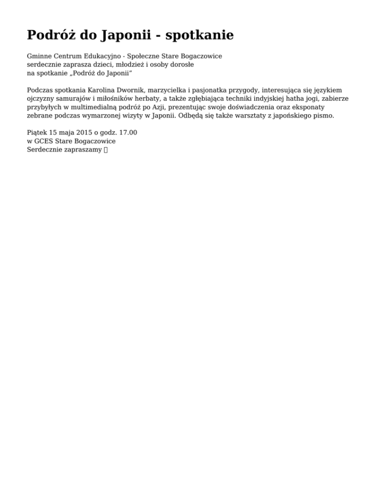 Podróż do Japonii - spotkanie Gminne Centrum Edukacyjno - Społeczne Stare Bogaczowice serdecznie zaprasza dzieci, młodzież i osoby dorosłe na spotkanie „Podróż do Japonii” Podczas spotkania Karolina Dwornik, marzycielka i pasjonatka przygody, interesująca się językiem ojczyzny samurajów i miłośników herbaty, a także zgłębiająca techniki indyjskiej hatha jogi, zabierze przybyłych w multimedialną podróż po Azji, prezentując swoje doświadczenia oraz eksponaty zebrane podczas wymarzonej wizyty w Japonii. Odbędą się także warsztaty z japońskiego pismo. Piątek 15 maja 2015 o godz. 17.00 w GCES Stare Bogaczowice Serdecznie zapraszamy