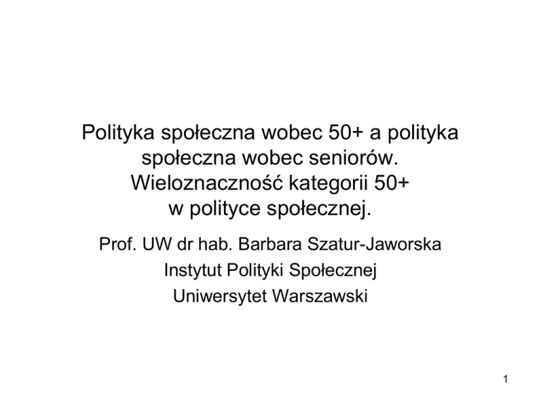 Polityka społeczna wobec 50+ a polityka społeczna wobec seniorów. Wieloznaczność kategorii 50+ w polityce społecznej. Prof. UW dr hab. Barbara Szatur-Jaworska Instytut Polityki Społecznej Uniwersytet Warszawski 1 55-64 lata powyżej 50 roku życia po 45 roku życia 2 Późna dojrzałość Wczesna starość Wczesna starość 60-74 Późna starość 75-89 Starość sędziwa (długowieczność) 90+ 3 4 Stan zdrowia ludności Polski w 2009 r.; GUS 2011 Z poważnymi ograniczeniami: 40-49: 4,5%; 50-59: 9%; 60-69 lat: 15%; 70-79 lat: 26%; 80 lat i więcej: 40% 5 Kiedy zaczyna się wiek dojrzały, kiedy zaczyna się starość? 6 CBOS 94/2012 Jaka polityka społeczna w warunkach starzenia się ludności? Różne perspektywy 7 Trzy aspekty polityki społecznej w starzejącym się społeczeństwie • • • Polityka wobec starzenia się ludności. W związku z tym, że proces starzenia się ludności ma kilka przyczyn i wywołuje bardzo różnorodne skutki, działania składające się na tę politykę dotyczą wielu tzw. polityk szczegółowych: gospodarczej, kształtowania przestrzeni, społecznej (z różnymi jej dziedzinami, np. rodzinną, rynku pracy, edukacyjną), migracyjnej itd. Polityka wobec starości. Ma ona na celu wspomaganie jednostek w radzeniu sobie z życiowymi kryzysami, które są typowe dla tej fazy życia (choć podlegają modyfikacjom zależnie od warunków historycznych); zapewnienie starości pozycji równoprawnej z innymi fazami życia oraz kształtowanie jej pozytywnego społecznego wizerunku, a także przygotowanie młodszych osób do czekającej ich starości. Adresatami polityki wobec starości są nie tylko ludzie starzy, ale i młodsze pokolenia przygotowywane do spotkania ze starością i do życia w społeczeństwie otwartym dla wszystkich grup wieku, respektującym specyfikę wszystkich faz życia. Polityka wobec ludzi starych. Polityka zorientowana na interesy i potrzeby konkretnej zbiorowości, żyjącej w danym czasie, na danym obszarze. Polityka wobec ludzi starych jest zatem, lub powinna być, oparta na rozpoznaniu sytuacji aktualnego starszego pokolenia, ewentualnie na prognozowaniu potrzeb starych ludzi w kilku- lub kilkunastoletniej perspektywie. 8 Obraz demograficzny 50+ niejednorodna populacja 10 NSP 2011 12 Żonaci 45-49:76% 50-54:77% 55-59:79% 60-64:82% 65-69: 82% Zamężne 45-49: 77% 50-54:75% 55-59: 70% 60-64: 63% 65-69: 54% 13 Wykształcenie gimnazjalne i niższe: 45-49: 9%; 50-54: 12%; 55-59: 18%; 60-64: 24%; 65 i więcej: 51% 14 Praca najemna jako główne źródło utrzymania: 45-49: 54%; 50-54: 48%; 55-59: 32%; 60-64: 10%; 65 i więcej: 1% Praca na własny rachunek jako główne źródło utrzymania 45-49: 16%; 50-54: 15%; 55-59: 10%; 60-64: 4%; 65 i więcej: 0,6% 15 50+ na rynku pracy zróżnicowanie sytuacji 16 Wybrane kohorty a „historia” rynku pracy Wiek w 1990 r. Wiek w 2003 r. (stopa bezrobocia ok. 19%) Wskaźnik zatrudnienia i stopa bezrobocia w 2003 r. w wybranych grupach wieku* 1967 23 lata 36 lat 35-44 lata – 73,5% 35-44 lata – 16,3% 50 lat 1962 28 lat 41 lat 35-44 lata – 73,5% 35-44 lata – 16,3% 55 lat 1957 33 lata 46 lat 45-54 lata – 62,4% 45 lat i więcej – 13,7% 60 lat 1952 38 lat 51 lat 45-54 lata – 62,4% 45 lat i więcej – 13,7% 65 lat 1947 43 lata 56 lat 55-59/64 lata – 33,1% 45 lat i więcej – 13,7% Wiek w 2012 r. Rok urodzenia 45 lat Liczba urodzeń w kohorcie 17 18 * BAEL IV kw. 2011 Współczynnik aktywności zawodowej w 2011 r. Grupa wieku ogółem miasta wieś mężczyźni kobiety 45-49 84,8 85,5 83,8 87,9 81,7 50-54 75,3 75,5 74,8 79,0 71,7 55-59 54,9 55,5 53,9 66,9 44,1 60-64 23,3 24,1 21,7 34,1 14,1 65 i więcej 5,0 4,4 6,2 8,0 3,2 * BAEL IV kw. 2011; obliczenia własne 19 20 NSP 2011 % pracowników najemnych wśród pracujących 45-54 lata – 74% 55-59 lat – 74% 60-64 lata – 63% 65 lat i więcej – 38% * BAEL IV kw. 2011; obliczenia własne 22 Pracujący w pełnym wymiarze czasu pracy 45-54 lata – 94% 55 lat i więcej – 81% * BAEL IV kw. 2011; obliczenia własne 23 * BAEL IV kw. 2011 24 * BAEL IV kw. 2011 26