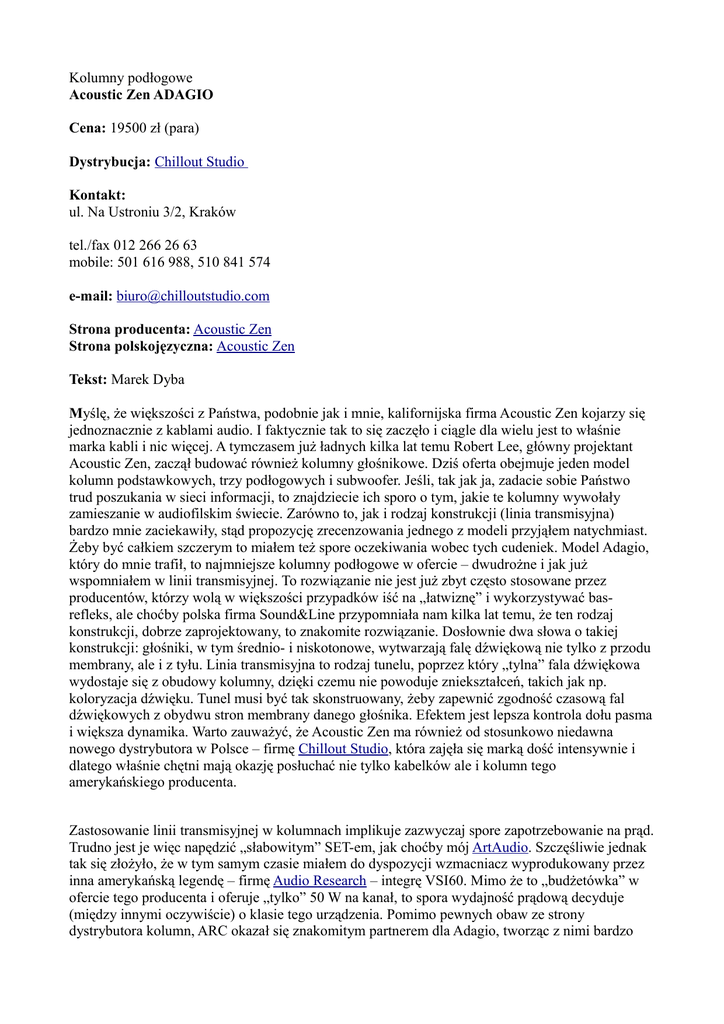 Kolumny podłogowe Acoustic Zen ADAGIO Cena: 19500 zł (para) Dystrybucja: Chillout Studio Kontakt: ul. Na Ustroniu 3/2, Kraków tel./fax 012 266 26 63 mobile: 501 616 988, 510 841 574 e-mail: [email protected] Strona producenta: Acoustic Zen Strona polskojęzyczna: Acoustic Zen Tekst: Marek Dyba Myślę, że większości z Państwa, podobnie jak i mnie, kalifornijska firma Acoustic Zen kojarzy się jednoznacznie z kablami audio. I faktycznie tak to się zaczęło i ciągle dla wielu jest to właśnie marka kabli i nic więcej. A tymczasem już ładnych kilka lat temu Robert Lee, główny projektant Acoustic Zen, zaczął budować również kolumny głośnikowe. Dziś oferta obejmuje jeden model kolumn podstawkowych, trzy podłogowych i subwoofer. Jeśli, tak jak ja, zadacie sobie Państwo trud poszukania w sieci informacji, to znajdziecie ich sporo o tym, jakie te kolumny wywołały zamieszanie w audiofilskim świecie. Zarówno to, jak i rodzaj konstrukcji (linia transmisyjna) bardzo mnie zaciekawiły, stąd propozycję zrecenzowania jednego z modeli przyjąłem natychmiast. Żeby być całkiem szczerym to miałem też spore oczekiwania wobec tych cudeniek. Model Adagio, który do mnie trafił, to najmniejsze kolumny podłogowe w ofercie – dwudrożne i jak już wspomniałem w linii transmisyjnej. To rozwiązanie nie jest już zbyt często stosowane przez producentów, którzy wolą w większości przypadków iść na „łatwiznę” i wykorzystywać basrefleks, ale choćby polska firma Sound&Line przypomniała nam kilka lat temu, że ten rodzaj konstrukcji, dobrze zaprojektowany, to znakomite rozwiązanie. Dosłownie dwa słowa o takiej konstrukcji: głośniki, w tym średnio- i niskotonowe, wytwarzają falę dźwiękową nie tylko z przodu membrany, ale i z tyłu. Linia transmisyjna to rodzaj tunelu, poprzez który „tylna” fala dźwiękowa wydostaje się z obudowy kolumny, dzięki czemu nie powoduje zniekształceń, takich jak np. koloryzacja dźwięku. Tunel musi być tak skonstruowany, żeby zapewnić zgodność czasową fal dźwiękowych z obydwu stron membrany danego głośnika. Efektem jest lepsza kontrola dołu pasma i większa dynamika. Warto zauważyć, że Acoustic Zen ma również od stosunkowo niedawna nowego dystrybutora w Polsce – firmę Chillout Studio, która zajęła się marką dość intensywnie i dlatego właśnie chętni mają okazję posłuchać nie tylko kabelków ale i kolumn tego amerykańskiego producenta. Zastosowanie linii transmisyjnej w kolumnach implikuje zazwyczaj spore zapotrzebowanie na prąd. Trudno jest je więc napędzić „słabowitym” SET-em, jak choćby mój ArtAudio. Szczęśliwie jednak tak się złożyło, że w tym samym czasie miałem do dyspozycji wzmacniacz wyprodukowany przez inna amerykańską legendę – firmę Audio Research – integrę VSI60. Mimo że to „budżetówka” w ofercie tego producenta i oferuje „tylko” 50 W na kanał, to spora wydajność prądową decyduje (między innymi oczywiście) o klasie tego urządzenia. Pomimo pewnych obaw ze strony dystrybutora kolumn, ARC okazał się znakomitym partnerem dla Adagio, tworząc z nimi bardzo zgraną parę, a w zasadzie to trio. Pewny utrudnieniem dla mnie był również fakt, że odsłuchy odbywały się w okresie zmian w moim systemie – nie miałem w tym momencie własnego odtwarzacza CD, a w gramofonie również testowałem nowe ramię (które zresztą chyba u mnie zostanie). Z pomocą przyszedł mi będący także w teście CD5 ARC – bez wątpienia najlepszy odtwarzacz CD jaki do tej pory u mnie grał, prezentujący muzykę w niezwykle neutralny i naturalny sposób, dzięki czemu mogłem mieć pewność, że nie jest wąskim gardłem systemu. Patrząc po raz pierwszy na Adagio można się spodziewać, że jest to układ 2,5 drożny z dwoma 6,5 calowymi wooferami i głośnikiem wysokotonowym umieszczonym między nimi. Ale pan Lee zastosował klasyczny układ D'Appolito, w którym obydwa nisko-średniotonowe głośniki pracują równolegle, by razem obsłużyć zakres od 30 Hz aż do 3 kHz. Według niego pozwala to na niższe zejście basu, oraz szerszy tzw. „sweet spot”, czyli optymalne miejsce odsłuchowe. Kolumny są dość wysokie i mają charakterystyczny kształt obudowy, zwężającej się z tyłu, co ma zapobiegać powstawaniu odbić i fal stojących w (stosunkowo niewielkich) komorach głośników. Po rozpakowaniu do kolumn trzeba przykręcić śrubami cokoły z regulowanymi kolcami. Adagio wyposażono w jeden komplet gniazd głośnikowych, co wyklucza próby bi-wiringu, czy też biampingu, choć teoretycznie aż by się prosiło by napędzić tweeter SET-em, a dwa woofery mocnym wzmacniaczem, który zapewniłby pełną kontrolę. Zdaniem Roberta Lee kolumny zostały tak dobrze zestrojone i okablowane wewnętrznie tak dobrym kablem (Acoustic Zen Santori, wykonanym z monokrystalicznej miedzi), że jakiekolwiek próby podłączania kabli w bi-wiringu (w wielu przypadkach gorszych niż AZ Santori) mogłyby negatywnie wpłynąć na owo strojenie. Cóż – każdy konstruktor ma swoją filozofię i za jakąkolwiek krytykę można się brać dopiero, jeśli ta filozofia się nie sprawdzi. Aaa... jeszcze jedno – już co prawda widzę miny wielu czytelników, jak tylko zobaczą: „moja żona”, ale co mi tam. A o żonie nie będzie bynajmniej w kontekście dźwięku, ale owego słynnego WAF, czyli tego, czy „klocek” spodoba się lepszej połowie i pozwoli go postawić w salonie. Otóż moja Żona kilka razy w czasie pobytu Adagio u mnie powtarzała: „one są ładne, naprawdę ładne”. A że bynajmniej nie jest bezkrytyczna świadczy najlepiej jej stosunek do Prince’ów V2 Hansen Audio, za które ja dałbym się pokroić (ze względu na oferowany dźwięk), a ona stwierdziła: „paskudne jak Cylony” (niewtajemniczonym wyjaśniam, że Cylony to stworzone przez człowieka humanoidalne roboty, które niemal całkowicie zniszczyły ludzkoś