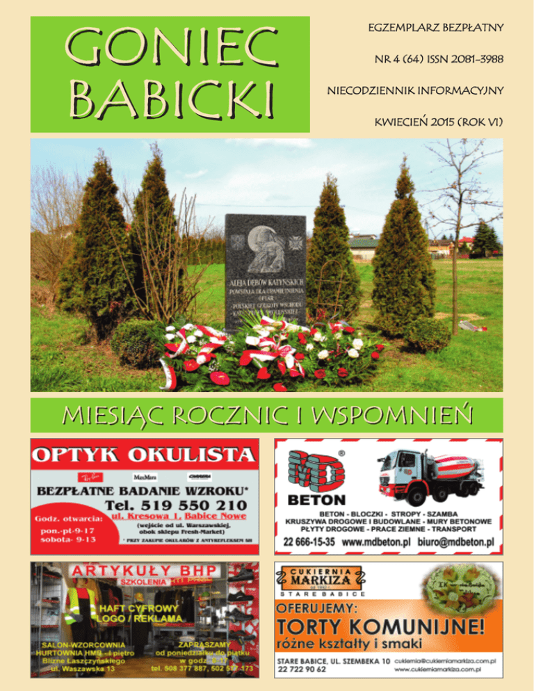 Adres wydawcy (redakcji): PUNKT REDAKCYJNY: Księgarnia "VERBUM" - Stare Babice, ul. Rynek 17 Redaguje Zespół w składzie: Michał Starnowski Dariusz Smoliński,Tomasz Szuba Piotr Dąbrowski Autor zdjęcia na okładce: Michał Starnowski ZGŁOSZENIA REKLAMOWE I OGŁOSZENIOWE: tel. 796-920-796; 796-020;796 lub [email protected] lub [email protected] Skład: ; Konto: mbank Druk: SEZON NA KLESZCZA Uwaga!!! Inwazja KLESZCZY w naszych okolicach. Jeśli zauważysz apatię, brak apetytu i osowiałość swojego psa koniecznie sprawdź czy ma kleszcze!!! Jeśli tak, to jak najszybciej udaj się do weterynarza, bo objawy te, to najprawdopodobniej Babeszjoza (piroplazmoza) choroba przenoszona przez kleszcze u zwierząt - informują internauci na facebooku. Kleszcz przyssany do zwierzęcia Babeszjoza jest chorobą o bardzo gwałtownym przebiegu, Terenami o szczególnym zagrożeniu są lasy, łąki, parki i ogrody, zwłaszcza jeżeli są porośnięte wysoką trawą. wczesną wiosną oraz latem i wczesną jesienią. Chorobie przenoszonej przez kleszcze można też zapobiegać. Do objawów choroby, które mogą się pojawić w czasie od kilku dni do nawet kilku tygodni, należą: Michał Starnowski - fot. facebook; na podstawie: www.wikipedia.org KONKURS NASZEGO NIECODZIENNIKA Uwaga, uwaga!!! Kolejna odsłona Naszego konkursu. KSIĘGARNIA "VERBUM" POLECA... TYM RAZEM COŚ DLA DZIECI I MŁODZIEŻY Do wakacji zostały jeszcze dwa miesiące, ale uznaliśmy, że bakcyla podróżniczego można zasiać nieco wcześniej. "Nela i tajemnice świata" "Nazywam się Nela i mam dziewięć lat. A to jest już moja trzecia książka! Gdy miałam pięć lat, zaczęłam podróżować po świecie i nagrywać filmy. Moim idolem jest Steve Irwin i pragnę zostać prezenterką podróżniczką. Byłam w wielu ciekawych krajach na różnych kontynentach. Na przykład w Afryce zwiedziłam Etiopię, Zanzibar, Tanzanię, Kenię i Mauritius. W Azji Tajlandię, Kambodżę, Malezję, Indonezję, Filipiny, Wietnam, a ostatnio też Sri Lankę. W Ameryce Południowej - Peru, Boliwię, Chile, a ostatnio również Kostarykę i Panamę. Zapraszam Cię w niezapomnianą podróż. Opowiem o pięknych miejscach, które poznałam, i o fascynujących zwierzętach, które zobaczyłam. Świat jest cudowny i oczami wyobraźni możesz podróżować ze mną oraz przeżywać wspaniałe przygody! Możesz przeczytać też moją pierwszą książkę pt. 10 niesamowitych przygód Neli oraz drugą książkę pt. Nela na 3 kontynentach. Podróże w nieznane." Młodzieży natomiast, polecamy powieść wznowioną w 2015 r. pt. "Sekretne życie pszczół" autorstwa Sue Monk Kidd. "Może to i prawda, że nie ma książek idealnych, ale tę zamknęłam z wrażeniem, że właśnie znalazłam ideał." W wiosennej ofercie VERBUM zaproszenia i pamiątki na Chrzest i Pierwszą Komunię Świętą, szatki, świece, profitki, różańce i obrazki pamiątkowe. "CREDO - Podstawowe prawdy wiary" JUŻ DZIAŁA!!! CompNET pod nr. tel. 602-799-668, Dariusz Smoliński WEŹ SPRAWY W SWOJE RĘCE BABICKI BUDŻET PARTYCYPACYJNY Rusza pierwszy babicki budżet partycypacyjny (inaczej budżet obywatelski) - głoszą informatory dystrybuowane przez Urząd Gmi ny Stare Babice. My również zachęcamy Państwa do zapoznania się z zasadami rozdziału takich środków, bo są to środki o których przeznaczeniu możemy sami decydować. Na 2016 rok Radni większością głosów niestety znów nie wyodrębnili Funduszy Sołeckich, za to (można też napisać, że w zamian) Wójt zgodnie z wcześniejszymi deklaracjami przygotował nasze babickie nowum, które z powo dzeniem realizowane jest od lat w innych miastach i gminach, w tym w Warszawie, czy pobliskim Błoniu. nych. wyodrębnienie kwoty 650 000 zł, mieszkańcy współtworzą budżet gminy Stare Babice, współdecydując o dystrybucji określonej puli środków publicz- zgłaszanie propozycji projektów, wraz z podpisanymi listami poparcia (30 podpisów) upływa w dniu 19 maja 2015 r. Wszystko na ten temat znajdziecie na stronie: Redakcja POLAKU, GŁOSUJ ZA POLSKĄ Wszyscy rodzimy się wolni i mamy jednakie prawo do godnego życia. Nie wolno zniewalać ludzi, siać nienawiść i pogardę, czy pasożytować na innych. Nawet Pan Bóg nie zmusza człowieka do miłości, a cierpliwie oczekuje i daje szansę aż do śmierci na sprawiedliwość i niebo. Polska żyć będzie, obroni się od zła i obcych. Życie jest darem Bożym, Prawo ludzkie winno być w zgodzie z Prawem Bożym, Jeżeli jesteś dorosły i to nie tylko wiekiem, ale rozumem i sumieniem głosuj za Polską. BÓG, HONOR, OJCZYZNA. Wszyscy jako naród i jako każdy z osobna jesteśmy odpowiedzialni za Polskę i Jej władze. Jam Jest drogą, prawdą i życiem. Gdy władza w Polsce będzie z wolnej woli narodu, to Tak jest w samorządności, czyli w demokracji, że wybiera się większością głosów, ale tylko osób głosujących, a nie "martwych dusz", czyli nieobecnych na wyborach. Gdy nie głosują wszyscy, to nie naród decyduje, a tylko jego część. Kto nie głosuje, nie postępuje według prawa, nie ma prawa narzekać, swoim lenistwem czy ciemnotą szkodzi sobie i innym. To Ci co nie głosują, teraz praktycznie decydują o tym, kto wygra. Gdy głosuje połowa Polaków, to wystarczy większość z połowy, czyli ćwierć głosów aby wygrać. Tak można przegłosować, aby większość wymordowała mniejszość. Polak głosuje na Polaka, katolik na katolika i wynik był oczywisty, dobry. Teraz wybierz prezydenta dla Rzeczypospolitej Polskiej, wybierz kandydata prawego, daj szansę istnienia i rozwoju Polsce, Polakom i jej prawom, jej dobru. POLSKA TO NASZ DOM OJCZYSTY. POLAKU GŁOSUJ ZA POLSKĄ!!! Stanisław Fijałkowski STAWKI ZA WODĘ I ŚCIEKI WZROSNĄ DEBATA W GPK EKO-BABICE NA KUTRZEBY Pierwszą moją kadencję w radzie gminy w latach 2006-2010 zdominowała dyskusja na temat formy realizacji wielkiego zadania, jakim było uruchomienie projektu skanalizowania g