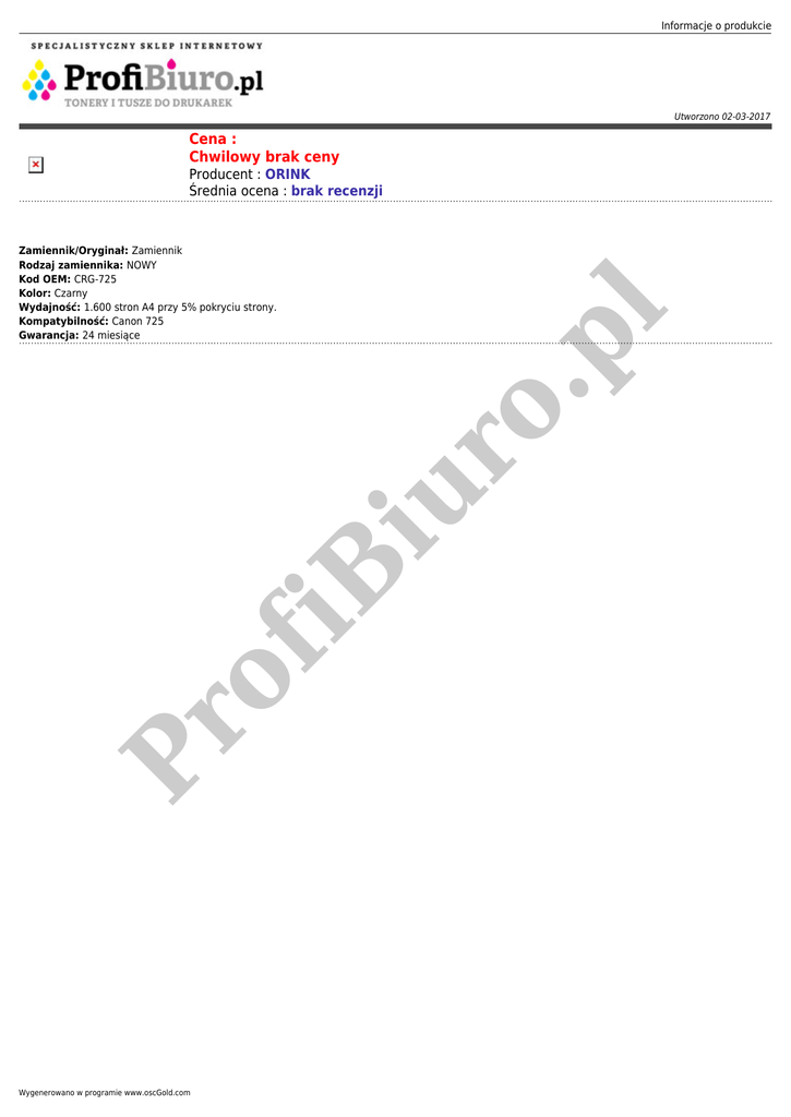 Informacje o produkcie Utworzono 02-03-2017 Cena : Chwilowy brak ceny Producent : ORINK Średnia ocena : brak recenzji Pr of iB iu r o. pl Zamiennik/Oryginał: Zamiennik Rodzaj zamiennika: NOWY Kod OEM: CRG-725 Kolor: Czarny Wydajność: 1.600 stron A4 przy 5% pokryciu strony. Kompatybilność: Canon 725 Gwarancja: 24 miesiące Wygenerowano w programie www.oscGold.com