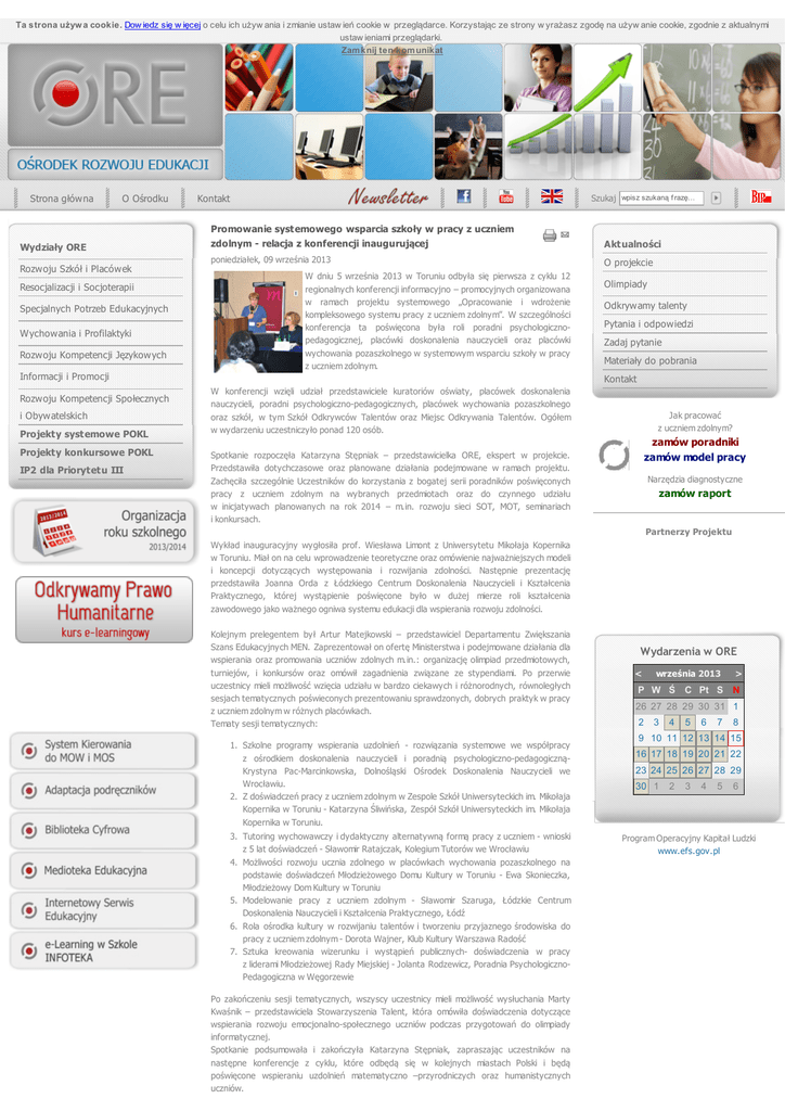 Ta strona używ a cookie. Dow iedz się w ięcej o celu ich używ ania i zmianie ustaw ień cookie w przeglądarce. Korzystając ze strony w yrażasz zgodę na używ anie cookie, zgodnie z aktualnymi ustaw ieniami przeglądarki. Zam knij ten kom unikat Strona główna O Ośrodku Wydziały ORE Rozwoju Szkół i Placówek Resocjalizacji i Socjoterapii Specjalnych Potrzeb Edukacyjnych Wychowania i Profilaktyki Rozwoju Kompetencji Językowych Informacji i Promocji Rozwoju Kompetencji Społecznych i Obywatelskich Projekty systemowe POKL Projekty konkursowe POKL IP2 dla Priorytetu III Kontakt Szukaj wpisz szukaną f razę... Promowanie systemowego wsparcia szkoły w pracy z uczniem zdolnym - relacja z konferencji inaugurującej Aktualności poniedziałek, 09 września 2013 O projekcie W dniu 5 września 2013 w Toruniu odbyła się pierwsza z cyklu 12 regionalnych konferencji informacyjno – promocyjnych organizowana w ramach projektu systemowego „Opracowanie i wdrożenie kompleksowego systemu pracy z uczniem zdolnym”. W szczególności konferencja ta poświęcona była roli poradni psychologicznopedagogicznej, placówki doskonalenia nauczycieli oraz placówki wychowania pozaszkolnego w systemowym wsparciu szkoły w pracy z uczniem zdolnym. Olimpiady Odkrywamy talenty Pytania i odpowiedzi Zadaj pytanie Materiały do pobrania Kontakt W konferencji wzięli udział przedstawiciele kuratoriów oświaty, placówek doskonalenia nauczycieli, poradni psychologiczno-pedagogicznych, placówek wychowania pozaszkolnego oraz szkół, w tym Szkół Odkrywców Talentów oraz Miejsc Odkrywania Talentów. Ogółem w wydarzeniu uczestniczyło ponad 120 osób. Jak pracować z uczniem zdolnym? zamów poradniki zamów model pracy Spotkanie rozpoczęła Katarzyna Stępniak – przedstawicielka ORE, ekspert w projekcie. Przedstawiła dotychczasowe oraz planowane działania podejmowane w ramach projektu. Zachęciła szczególnie Uczestników do korzystania z bogatej serii poradników poświęconych pracy z uczniem zdolnym na wybranych przedmiotach oraz do czynnego udziału w inicjatywach planowanych na rok 2014 – m.in. rozwoju sieci SOT, MOT, seminariach i konkursach. Narzędzia diagnostyczne zamów raport Partnerzy Projektu Wykład inauguracyjny wygłosiła prof. Wiesława Limont z Uniwersytetu Mikołaja Kopernika w Toruniu. Miał on na celu wprowadzenie teoretyczne oraz omówienie najważniejszych modeli i koncepcji dotyczących występowania i rozwijania zdolności. Następnie prezentację przedstawiła Joanna Orda z Łódzkiego Centrum Doskonalenia Nauczycieli i Kształcenia Praktycznego, której wystąpienie poświęcone było w dużej mierze roli kształcenia zawodowego jako ważnego ogniwa systemu edukacji dla wspierania rozwoju zdolności. Kolejnym prelegentem był Artur Matejkowski – przedstawiciel Departamentu Zwiększania Szans Edukacyjnych MEN. Zaprezentował on ofertę Ministerstwa i podejmowane działania dla wspierania oraz promowania uczniów zdolnych m.in.: organizację olimpiad przedmiotowych, turniejów, i konkursów oraz omówił zagadnienia związane ze stypendiami. Po przerwie uczestnicy mieli możliwość wzięcia udziału w bardzo ciekawych i różnorodnych, równoległych sesjach tematycznych poświeconych prezentowaniu sprawdzonych, dobrych praktyk w pracy z uczniem zdolnym w różnych placówkach. Tematy sesji tematycznych: 1. Szkolne programy wspierania uzdolnień - rozwiązania systemowe we współpracy z ośrodkiem doskonalenia nauczycieli i poradnią psychologiczno-pedagogicznąKrystyna Pac-Marcinkowska, Dolnośląski Ośrodek Doskonalenia Nauczycieli we Wrocławiu. 2. Z doświadczeń pracy z uczniem zdolnym w Zespole Szkół Uniwersyteckich im. Mikołaja Kopernika w Toruniu - Katarzyna Śliwińska, Zespół Szkół Uniwersyteckich im. Mikołaja Kopernika w Toruniu. 3. Tutoring wychowawczy i dydaktyczny alternatywną formą pracy z uczniem - wnioski z 5 lat doświadczeń - Sławomir Ratajczak, Kolegium Tutorów we Wrocławiu 4. Możliwości rozwoju ucznia zdolnego w placówkach wychowania pozaszkolnego na podstawie doświadczeń Młodzieżowego Domu Kultury w Toruniu - Ewa Skonieczka, Młodzieżowy Dom Kultury w Toruniu 5. Modelowanie pracy z uczniem zdolnym - Sławomir Szaruga, Łódzkie Centrum Doskonalenia Nauczycieli i Kształcenia Praktycznego, Łódź 6. Rola ośrodka kultury w rozwijaniu talentów i tworzeniu przyjaznego środowiska do pracy z uczniem zdolnym - Dorota Wajner, Klub Kultury Warszawa Radość 7. Sztuka kreowania wizerunku i wystąpień publicznych- doświadczenia w pracy z liderami Młodzieżowej Rady Miejskiej - Jolanta Rodzewicz, Poradnia PsychologicznoPedagogiczna w Węgorzewie Po zakończeniu sesji tematycznych, wszyscy uczestnicy mieli możliwość wysłuchania Marty Kwaśnik – przedstawiciela Stowarzyszenia Talent, która omówiła doświadczenia dotyczące wspierania rozwoju emocjonalno-społecznego uczniów podczas przygotowań do olimpiady informatycznej. Spotkanie podsumowała i zakończyła Katarzyna Stępniak, zapraszając uczestników na następne konferencje z cyklu, które odbędą się w kolejnych miastach Polski i będą poświęcone wspieraniu uzdolnień matematyczno –przyrodniczych oraz humanistycznych uczniów. Wydarzenia w ORE < września 2013 > P W Ś C Pt S N 26 27 28 29 30 31 1 2 3 4 5 6 7 8 9 10 11 12 13 14 15 16 17 18 19 20 21 22 23 24 25 26 27 28 29 30 1 2 3 4 5 6 Program Operacyjny Kapitał Ludzki www.efs.gov.pl uczniów. Serdecznie dziękujemy wszystkim Prelegentom, Gościom i Uczestnikom za liczne przybycie, aktywny udział i cenne dyskusje! Opracowanie: K. Stępniak Powrót Share © Ośrodek Rozwoju Edukacji | Kontakt | Praca | Skróć adres on-line: 121 1 Kanał RSS ORE