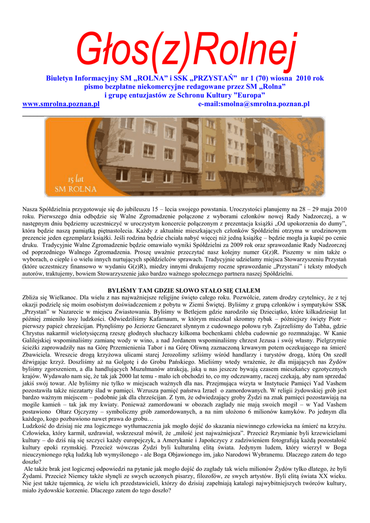 Głos(z)Rolnej Biuletyn Informacyjny SM „ROLNA” i SSK „PRZYSTAŃ” nr 1 (70) wiosna 2010 rok pismo bezpłatne niekomercyjne redagowane przez SM „Rolna” i grupę entuzjastów ze Schronu Kultury ”Europa” www.smrolna.poznan.pl e-mail:[email protected] ___________________________________________________________________________ Nasza Spółdzielnia przygotowuje się do jubileuszu 15 – lecia swojego powstania. Uroczystości planujemy na 28 – 29 maja 2010 roku. Pierwszego dnia odbędzie się Walne Zgromadzenie połączone z wyborami członków nowej Rady Nadzorczej, a w następnym dniu będziemy uczestniczyć w uroczystym koncercie połączonym z prezentacja książki „Od upokorzenia do dumy”, która będzie naszą pamiątką piętnastolecia. Każdy z aktualnie mieszkających członków Spółdzielni otrzyma w urodzinowym prezencie jeden egzemplarz książki. Jeśli rodzina będzie chciała nabyć więcej niż jedną książkę – będzie mogła ja kupić po cenie druku. Tradycyjnie Walne Zgromadzenie będzie omawiało wyniki Spółdzielni za 2009 rok oraz sprawozdanie Rady Nadzorczej od poprzedniego Walnego Zgromadzenia. Proszę uważnie przeczytać nasz kolejny numer G(z)R. Piszemy w nim także o wyborach, o cieple i o wielu innych nurtujących spółdzielców sprawach. Tradycyjnie udzielamy miejsca Stowarzyszeniu Przystań (które uczestniczy finansowo w wydaniu G(z)R), miedzy innymi drukujemy roczne sprawozdanie „Przystani” i teksty młodych autorów, traktujemy, bowiem Stowarzyszenie jako bardzo ważnego społecznego partnera naszej Spółdzielni. BYLIŚMY TAM GDZIE SŁOWO STAŁO SIĘ CIAŁEM Zbliża się Wielkanoc. Dla wielu z nas najważniejsze religijne święto całego roku. Pozwólcie, zatem drodzy czytelnicy, że z tej okazji podzielę się moim osobistym doświadczeniem z pobytu w Ziemi Świętej. Byliśmy z grupą członków i sympatyków SSK „Przystań” w Nazarecie w miejscu Zwiastowania. Byliśmy w Betlejem gdzie narodziło się Dzieciątko, które kilkadziesiąt lat później zmieniło losy ludzkości. Odwiedziliśmy Kafarnaum, w którym mieszkał skromny rybak – późniejszy święty Piotr – pierwszy papież chrześcijan. Płynęliśmy po Jeziorze Genezaret słynnym z cudownego połowu ryb. Zajrzeliśmy do Tabha, gdzie Chrystus nakarmił wielotysięczną rzeszę głodnych słuchaczy kilkoma bochenkami chleba cudownie go rozmnażając. W Kanie Galilejskiej wspominaliśmy zamianę wody w wino, a nad Jordanem wspominaliśmy chrzest Jezusa i swój własny. Pielgrzymie ścieżki zaprowadziły nas na Górę Przemienienia Tabor i na Górę Oliwną zaznaczoną krwawym potem oczekującego na śmierć Zbawiciela. Wreszcie drogą krzyżowa ulicami starej Jerozolimy szliśmy wśród handlarzy i turystów drogą, którą On szedł dźwigając krzyż. Doszliśmy aż na Golgotę i do Grobu Pańskiego. Mieliśmy wtedy wrażenie, że dla mijających nas Żydów byliśmy zgorszeniem, a dla handlujących Muzułmanów atrakcją, jaką u nas jeszcze bywają czasem mieszkańcy egzotycznych krajów. Wydawało nam się, że tak jak 2000 lat temu - mało ich obchodzi to, co my odczuwamy, raczej czekają, aby nam sprzedać jakiś swój towar. Ale byliśmy nie tylko w miejscach ważnych dla nas. Przejmująca wizyta w Instytucie Pamięci Yad Vashem pozostawiła także niezatarty ślad w pamięci. Wzrusza pamięć państwa Izrael o zamordowanych. W religii żydowskiej grób jest bardzo ważnym miejscem – podobnie jak dla chrześcijan. Z tym, że odwiedzający groby Żydzi na znak pamięci pozostawiają na mogile kamień – tak jak my kwiaty. Ponieważ zamordowani w obozach zagłady nie mają swoich mogił – w Yad Vashem postawiono Ołtarz Ojczyzny – symboliczny grób zamordowanych, a na nim ułożono 6 milionów kamyków. Po jednym dla każdego, kogo pozbawiono nawet prawa do grobu… Ludzkość do dzisiaj nie zna logicznego wytłumaczenia jak mogło dojść do skazania niewinnego człowieka na śmierć na krzyżu. Człowieka, który karmił, uzdrawiał, wskrzeszał mówił, że „miłość jest najważniejsza”. Przecież Rzymianie byli krzewicielami kultury – do dziś nią się szczyci każdy europejczyk, a Amerykanie i Japończycy z zadziwieniem fotografują każdą pozostałość kultury epoki rzymskiej. Przecież wówczas Żydzi byli kulturalną elitą świata. Jedynym ludem, który wierzył w Boga nieuczynionego ręką ludzką lub wymyślonego - ale Boga Objawionego im, jako Narodowi Wybranemu. Dlaczego zatem do tego doszło? Ale także brak jest logicznej odpowiedzi na pytanie jak mogło dojść do zagłady tak wielu milionów Żydów tylko dlatego, że byli Żydami. Przecież Niemcy także słynęli ze swych uczonych pisarzy, filozofów, ze swych artystów. Byli elitą świata XX wieku. Nie jest także tajemnicą, że wielu ich przedstawicieli, którzy do dzisiaj zapełniają katalogi najwybitniejszych twórców kultury, miało żydowskie korzenie. Dlaczego zatem do tego doszło? Uliczka w Nazarecie słynna „Ściana Płaczu” w Jerozolimie ulica w Jerozolimie Wejście do Grobu Pańskiego Święta Zmartwychwstania Pańskiego są świętami radości. Nie zapominamy jednak, że ta radość zapoczątkowana została męczeństwem i śmiercią. Może, zatem kiedy usiądziemy do stołu, podzielimy się jajkiem – symbolem nowego życia, postanówmy sobie, że jeśli tylko to będzie w naszej mocy, niedopuścimy do tego, aby nienawiść i niezrozumienie drugiego człowieka ogarnęła nas do tego stopnia, abyśmy musieli kiedykolwiek w przyszłości postawić sobie to pytanie - dlaczego do tego doszło? Życzę Państwu w imieniu własnym, całego Zarządu, Rady Nadzorczej, Pracowników SM „Rolna” i Zarządu, SSK „Przystań” wesołych, choć refleksyjnych Świąt. Świąt miłości, pokoju – nowej nadziei szczególnie tym Rodzinom, którym aktualnie jest ciężko. A jeśli kiedykolwiek będziecie mogli udać się do Ziemi Świętej polecam - bo wa