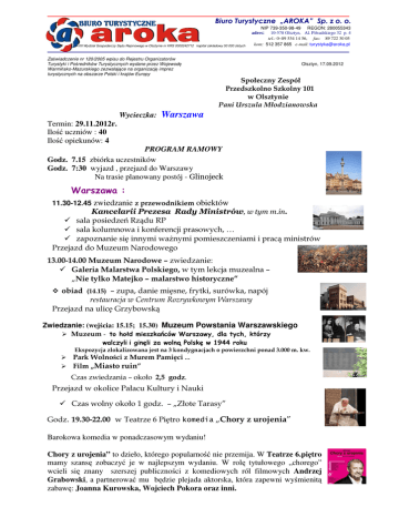 Biuro Turystyczne „AROKA” Sp. z o. o. VIII Wydział Gospodarczy Sądu Rejonowego w Olsztynie nr KRS 0000242712 kapitał zakładowy 50 000 złotych NIP 739-350-98-49 REGON: 280055343 adres: 10-578 Olsztyn, Al. Piłsudskiego 32 p. 4 tel.: 0~89 534 14 56, fax: 89 722 30 05 kom: 512 357 865 e-mail: [email protected] Zaświadczenie nr 120/2005 wpisu do Rejestru Organizatorów Turystyki i Pośredników Turystycznych wydane przez Wojewodę Warmińsko-Mazurskiego zezwalające na organizację imprez turystycznych na obszarze Polski i krajów Europy Olsztyn, 17.09.2012 Społeczny Zespół Przedszkolno Szkolny 101 w Olsztynie Pani Urszula Młodzianowska Wycieczka: Warszawa Termin: 29.11.2012r. Ilość uczniów : 40 Ilość opiekunów: 4 PROGRAM RAMOWY Godz. 7.15 zbiórka uczestników Godz. 7:30 wyjazd , przejazd do Warszawy Na trasie planowany postój - Glinojeck Warszawa : 11.30-12.45 zwiedzanie z przewodnikiem obiektów Kancelarii Prezesa Rady Ministrów, w tym m.in. sala posiedzeń Rządu RP sala kolumnowa i konferencji prasowych, … zapoznanie się innymi ważnymi pomieszczeniami i pracą ministrów Przejazd do Muzeum Narodowego 13.00-14.00 Muzeum Narodowe – zwiedzanie: Galeria Malarstwa Polskiego, w tym lekcja muzealna – „Nie tylko Matejko – malarstwo historyczne” obiad (14.15) – zupa, danie mięsne, frytki, surówka, napój restauracja w Centrum Rozrywkowym Warszawy Przejazd na ulicę Grzybowską Zwiedzanie: (wejścia: 15.15; 15.30) Muzeum Powstania Warszawskiego Muzeum - to hołd mieszkańców Warszawy, dla tych, którzy walczyli i ginęli za wolną Polskę w 1944 roku Ekspozycja zlokalizowana jest na 3 kondygnacjach o powierzchni ponad 3.000 m. kw. Park Wolności z Murem Pamięci … Film „Miasto ruin” Czas zwiedzania – około 2,5 godz. Przejazd w okolice Pałacu Kultury i Nauki Czas wolny około 1 godz. – „Złote Tarasy” Godz. 19.30-22.00 w Teatrze 6 Piętro komedia „Chory z urojenia” Barokowa komedia w ponadczasowym wydaniu! Chory z urojenia” to dzieło, którego popularność nie przemija. W Teatrze 6.piętro mamy szansę zobaczyć je w najlepszym wydaniu. W rolę tytułowego „chorego” wcieli się znany szerszej publiczności z komediowych ról filmowych Andrzej Grabowski, a partnerować mu będzie plejada aktorska, która zapewni wyśmienitą zabawę: Joanna Kurowska, Wojciech Pokora oraz inni. Uciekając się do absurdu, Molier pokazuje nam, współczesnym, „chorobę” jako metaforę samotności, wyobcowania i potrzeby zwrócenia na siebie uwagi otoczenia. Z pozoru lekka komedia odkrywa przed widzem słabości człowieka i bezradność medycyny wobec cierpienia duszy, niemierzalnego i niewidocznego dla „szkiełka i oka”. Wszystko jednak kończy się szczęśliwie, jak na komedię Moliera przystało. Około godz. 22-ej wyjazd z Warszawy Przyjazd do Olsztyna około godz. 1-ej w nocy CENA: 200 PLN/ucz. Cena zawiera: przewóz autokarem klasy turystycznej, pilota na trasie bilety wstępu: MN, MPW, teatr 6 Piętro obiad: zupa, danie mięsne, frytki, surówka, napój ubezpieczenie NNW 4 opiekunów Uwagi: 1/ możliwość zmian w programie na Państwa życzenie kom. 512 357 865 Z życzeniami miłych wrażeń! Stanisław Lipka