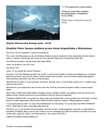 <<< Po tragicznych wydarzeniach Niebo po katastrofie samolotu prezydenckiego w Smoleńsku 10. 04. 2010r. (Widać Ojciec Niebieski przyjął ich ofiarę). Wigilia Miłosierdzia Bożego godz. 15:30 Orędzie Pana Jezusa podane przez Annę Argasińską z Warszawy Pan Jezus: Nie ma wypadków w całym Wszechświecie. Pisz, Anno: Sam Bóg dopuszcza zło, aby dotknąć ludzkość poprzez cierpienie (wtedy najczęściej człowiek nabiera pokory i schodzi ze złej drogi), lub czyniąc zło, sam człowiek zabija brata, tak jak Kain zabił Abla. Potrzeba było tej ofiary, tak jak trzeba było Mojej Ofiary. Anna: Jeżeli ofiara to musi być i kat? Pan Jezus: Tak; Anna: A w tej tragedii dla Narodu Polskiego? Pan Jezus: Jest i kat. Dlatego potrzeba, aby narody w całym świecie padały na kolana przed Bogiem, bo w każdym państwie jest Kain i Abel; jest zło i dobro. Polskę kocham nade wszystko. Jest mi Izraelem, dlatego Bóg dopuścił śmiercionośną, rękę Kaina, aby ofiara została przyjęta. Mówiłem już do ciebie, że to jest początek „katastrof” (przypis Anny: czytaj uważnie orędzia z IV cz. książki, która niebawem się ukaże). Mówiłem też, że przyjdą jeszcze inne na cały świat, aby świat się zatrzymał, bo pędzi na oślep w samą przepaść piekła. Ojciec Mój, z miłości ojcowskiej dopuści następne i jeszcze następne, dopóty wasz pędzący świat nie zatrzyma się. Dopiero wtedy zostanie uratowana ta część ludzkości, która by poszła na potępienie. Cierpliwość MEGO OJCA wyczerpała się. Dzieci, które nie słuchają OJCA muszą ponieść karę. Za bardzo i za dużo liczycie na Moje Miłosierdzie, lekceważycie MOJE SŁOWO, żyjąc po swojemu - dlatego będziecie cierpieć. A to jest początek kar, które wy nazywacie kataklizmami. Ja wam mówię: Nic się nie dzieje bez WOLI MOJEGO OJCA. Ginąć będą te ofiary, które Bóg sobie upatrzył. Mówię do was, a i tak niewielu tym się przejmie, niewielu zawróci z drogi potępienia. Człowiek w swojej słabości, kruchości jest lękliwy. Bóg o tym wie, ale i szatan o tym wie. Dokonuje się walka zła z dobrem. Tej bitwy nie wygra naród, który rządzi się swoim, a nie Moim prawem. Przeczytajcie PSALM 22. CHRYSTUS KRÓL WSZECHŚWIATA Wydruk: www.prorocykatolik.pl