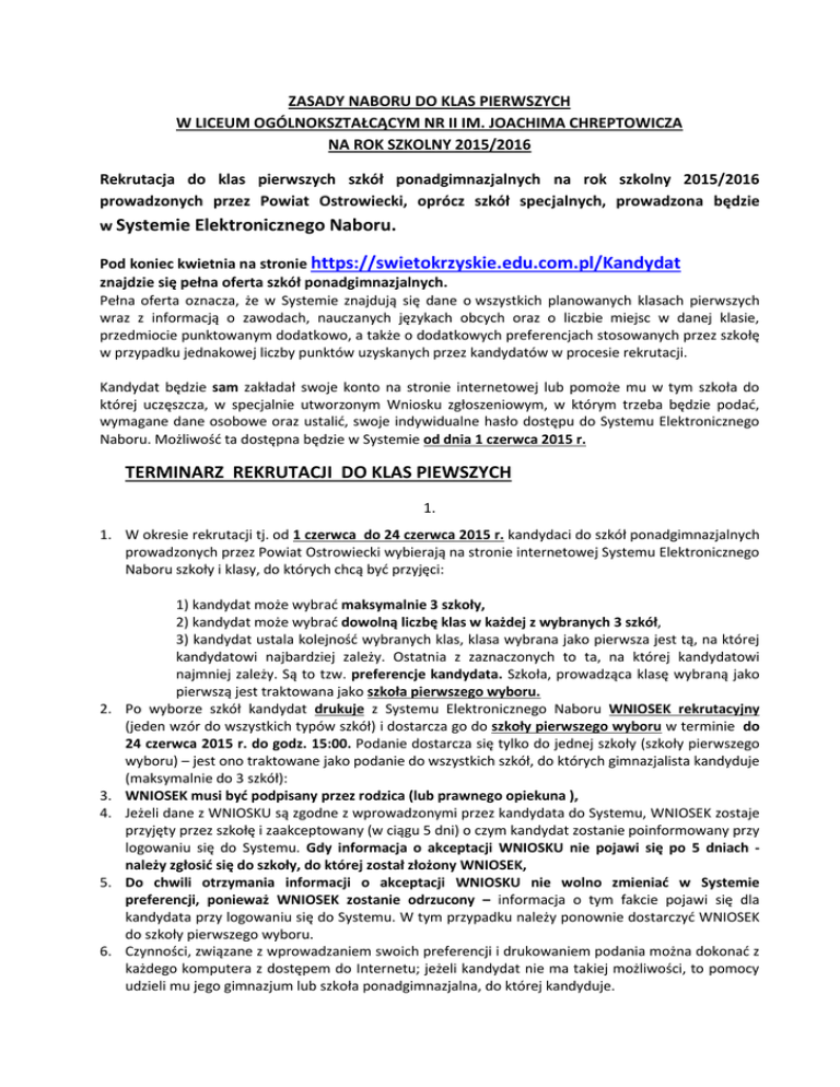 ZASADY NABORU DO KLAS PIERWSZYCH W LICEUM OGÓLNOKSZTAŁCĄCYM NR II IM. JOACHIMA CHREPTOWICZA NA ROK SZKOLNY 2015/2016 Rekrutacja do klas pierwszych szkół ponadgimnazjalnych na rok szkolny 2015/2016 prowadzonych przez Powiat Ostrowiecki, oprócz szkół specjalnych, prowadzona będzie w Systemie Elektronicznego Naboru. Pod koniec kwietnia na stronie https://swietokrzyskie.edu.com.pl/Kandydat znajdzie się pełna oferta szkół ponadgimnazjalnych. Pełna oferta oznacza, że w Systemie znajdują się dane o wszystkich planowanych klasach pierwszych wraz z informacją o zawodach, nauczanych językach obcych oraz o liczbie miejsc w danej klasie, przedmiocie punktowanym dodatkowo, a także o dodatkowych preferencjach stosowanych przez szkołę w przypadku jednakowej liczby punktów uzyskanych przez kandydatów w procesie rekrutacji. Kandydat będzie sam zakładał swoje konto na stronie internetowej lub pomoże mu w tym szkoła do której uczęszcza, w specjalnie utworzonym Wniosku zgłoszeniowym, w którym trzeba będzie podać, wymagane dane osobowe oraz ustalić, swoje indywidualne hasło dostępu do Systemu Elektronicznego Naboru. Możliwość ta dostępna będzie w Systemie od dnia 1 czerwca 2015 r. TERMINARZ REKRUTACJI DO KLAS PIEWSZYCH 1. 1. W okresie rekrutacji tj. od 1 czerwca do 24 czerwca 2015 r. kandydaci do szkół ponadgimnazjalnych prowadzonych przez Powiat Ostrowiecki wybierają na stronie internetowej Systemu Elektronicznego Naboru szkoły i klasy, do których chcą być przyjęci: 2. 3. 4. 5. 6. 1) kandydat może wybrać maksymalnie 3 szkoły, 2) kandydat może wybrać dowolną liczbę klas w każdej z wybranych 3 szkół, 3) kandydat ustala kolejność wybranych klas, klasa wybrana jako pierwsza jest tą, na której kandydatowi najbardziej zależy. Ostatnia z zaznaczonych to ta, na której kandydatowi najmniej zależy. Są to tzw. preferencje kandydata. Szkoła, prowadząca klasę wybraną jako pierwszą jest traktowana jako szkoła pierwszego wyboru. Po wyborze szkół kandydat drukuje z Systemu Elektronicznego Naboru WNIOSEK rekrutacyjny (jeden wzór do wszystkich typów szkół) i dostarcza go do szkoły pierwszego wyboru w terminie do 24 czerwca 2015 r. do godz. 15:00. Podanie dostarcza się tylko do jednej szkoły (szkoły pierwszego wyboru) – jest ono traktowane jako podanie do wszystkich szkół, do których gimnazjalista kandyduje (maksymalnie do 3 szkół): WNIOSEK musi być podpisany przez rodzica (lub prawnego opiekuna ), Jeżeli dane z WNIOSKU są zgodne z wprowadzonymi przez kandydata do Systemu, WNIOSEK zostaje przyjęty przez szkołę i zaakceptowany (w ciągu 5 dni) o czym kandydat zostanie poinformowany przy logowaniu się do Systemu. Gdy informacja o akceptacji WNIOSKU nie pojawi się po 5 dniach należy zgłosić się do szkoły, do której został złożony WNIOSEK, Do chwili otrzymania informacji o akceptacji WNIOSKU nie wolno zmieniać w Systemie preferencji, ponieważ WNIOSEK zostanie odrzucony – informacja o tym fakcie pojawi się dla kandydata przy logowaniu się do Systemu. W tym przypadku należy ponownie dostarczyć WNIOSEK do szkoły pierwszego wyboru. Czynności, związane z wprowadzaniem swoich preferencji i drukowaniem podania można dokonać z każdego komputera z dostępem do Internetu; jeżeli kandydat nie ma takiej możliwości, to pomocy udzieli mu jego gimnazjum lub szkoła ponadgimnazjalna, do której kandyduje. 2. Od 1 do 24 czerwca 2015 r. do godz. 15:00 kandydaci do szkół ponadgimnazjalnych prowadzonych przez Powiat Ostrowiecki mogą zmienić swoje preferencje w Systemie Elektronicznego Naboru. W tym przypadku kandydat musi ponownie wydrukować i złożyć podanie do szkoły pierwszego wyboru, która anuluje poprzedni wybór. 3. Po dniu 24 czerwca 2015 r. kandydaci nie mają dostępu do Systemu Elektronicznego Naboru w zakresie dotyczącym zmiany preferencji. 4. Od 1 czerwca 2015 r. kandydaci mogą po zalogowaniu się do Systemu sprawdzić, ilu jest chętnych do klas, do których dokonali wyboru. 5. Do 1 lipca 2015 r. do godz. 15:00 kandydaci: 1) wprowadzają do Systemu oceny jakie uzyskali na świadectwie ukończenia gimnazjum, liczbę punktów z egzaminu gimnazjalnego oraz inne osiągnięcia (wpisane na świadectwie), 2) którzy zostali zwolnieni z egzaminu gimnazjalnego mają przyznawane punkty za oceny ze świadectwa i inne osiągnięcia, a uzyskaną w ten sposób liczbę punktów mnożą przez 2, 3) doręczają do szkoły, do której złożyli podanie (szkoły pierwszego wyboru) tyle kopii świadectwa oraz tyle kopii zaświadczenia o wyniku egzaminu gimnazjalnego, ile szkół wybrali w systemie,(maksymalnie trzy) 4) kandydaci ubiegający się o przyjęcie do klasy pierwszej szkoły ponadgimnazjalnej prowadzących kształcenie zawodowe dostarczają także zaświadczenie lekarskie o braku przeciwwskazań zdrowotnych do kształcenia w określonym zawodzie, 5) szkoła ponadgimnazjalna weryfikuje prawidłowość wprowadzonych danych ze świadectwa i zaświadczenia o wyniku egzaminu gimnazjalnego, a następnie zatwierdza je w Systemie. 6. 3 lipca 2015 r. o godz. 12:00 następuje ogłoszenie wstępnych list kandydatów zakwalifikowanych do przyjęcia. Kandydat zostaje przez system przypisany tylko do jednej klasy w jednej szkole – do najwyższego określonego w preferencjach wyboru kandydata, do której kwalifikuje go uzyskana liczba punktów. Pozostałe niżej zaznaczone w preferencjach wybory nie są przez System rozpatrywane. 7. Od 3 lipca od godz. 13.00 do 7 lipca 2015 r. do godz. 15:00 kandydaci poświadczają wolę nauki w danej szkole doręczając oryginał świadectwa i oryginał zaświadczenia o wyniku egzaminu gimnazjalnego do szkoły, do której zostali przyjęci. NIE DORĘCZENIE ORYGINAŁÓW OZNACZA REZYGNACJĘ Z MIEJSCA I BRAK PRZYPISANIA DO JAKIEJKOLWIEK SZKOŁY. 8. W dniu 8 lipca 2015 r. do godz. 12:00 następuje ogłoszenie list przyjętych do szkół na podstawie oryginałów świadectw i oryginałów zaśw