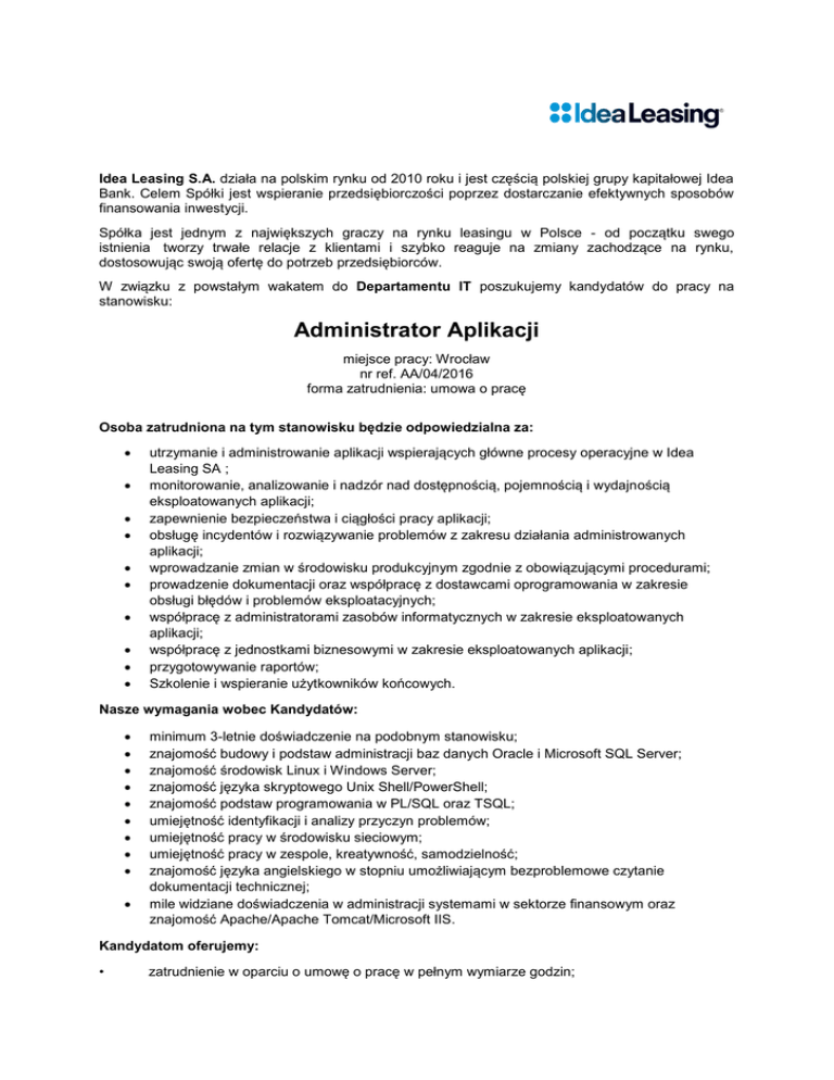 Idea Leasing S.A. działa na polskim rynku od 2010 roku i jest częścią polskiej grupy kapitałowej Idea Bank. Celem Spółki jest wspieranie przedsiębiorczości poprzez dostarczanie efektywnych sposobów finansowania inwestycji. Spółka jest jednym z największych graczy na rynku leasingu w Polsce - od początku swego istnienia tworzy trwałe relacje z klientami i szybko reaguje na zmiany zachodzące na rynku, dostosowując swoją ofertę do potrzeb przedsiębiorców. W związku z powstałym wakatem do Departamentu IT poszukujemy kandydatów do pracy na stanowisku: Administrator Aplikacji miejsce pracy: Wrocław nr ref. AA/04/2016 forma zatrudnienia: umowa o pracę Osoba zatrudniona na tym stanowisku będzie odpowiedzialna za: utrzymanie i administrowanie aplikacji wspierających główne procesy operacyjne w Idea Leasing SA ; monitorowanie, analizowanie i nadzór nad dostępnością, pojemnością i wydajnością eksploatowanych aplikacji; zapewnienie bezpieczeństwa i ciągłości pracy aplikacji; obsługę incydentów i rozwiązywanie problemów z zakresu działania administrowanych aplikacji; wprowadzanie zmian w środowisku produkcyjnym zgodnie z obowiązującymi procedurami; prowadzenie dokumentacji oraz współpracę z dostawcami oprogramowania w zakresie obsługi błędów i problemów eksploatacyjnych; współpracę z administratorami zasobów informatycznych w zakresie eksploatowanych aplikacji; współpracę z jednostkami biznesowymi w zakresie eksploatowanych aplikacji; przygotowywanie raportów; Szkolenie i wspieranie użytkowników końcowych. Nasze wymagania wobec Kandydatów: minimum 3-letnie doświadczenie na podobnym stanowisku; znajomość budowy i podstaw administracji baz danych Oracle i Microsoft SQL Server; znajomość środowisk Linux i Windows Server; znajomość języka skryptowego Unix Shell/PowerShell; znajomość podstaw programowania w PL/SQL oraz TSQL; umiejętność identyfikacji i analizy przyczyn problemów; umiejętność pracy w środowisku sieciowym; umiejętność pracy w zespole, kreatywność, samodzielność; znajomość języka angielskiego w stopniu umożliwiającym bezproblemowe czytanie dokumentacji technicznej; mile widziane doświadczenia w administracji systemami w sektorze finansowym oraz znajomość Apache/Apache Tomcat/Microsoft IIS. Kandydatom oferujemy: • zatrudnienie w oparciu o umowę o pracę w pełnym wymiarze godzin; • • • • pakiet socjalny (prywatną opiekę medyczną/Kartę Multisport); przyjazną atmosferę oraz komfortowe warunki pracy; indywidualne podejście do każdego pracownika; możliwość rozwoju zawodowego. Zainteresowane osoby prosimy o przesyłanie CV i listu motywacyjnego na adres: [email protected] . Uprzejmie informujemy, że skontaktujemy się jedynie z wybranymi osobami. „Zgodnie z art. 24 ust. 1 Ustawy z dnia 29 sierpnia 1997 roku o ochronie danych osobowych (DzU z 2014 r., poz. 1182) informujemy, że administratorem danych jest Idea Leasing S.A. z siedzibą przy ul. Strzegomskiej 42b, 53-611 Wrocław. Przedmiotowe dane przetwarzane są w celu niezbędnym do realizowanego procesu rekrutacyjnego oraz podjęcia działań przed zawarciem umowy i nie będą udostępniane innym odbiorcom danych. Obowiązek ich podania wynika z przepisów Ustawy z dnia 26 czerwca 1974 roku Kodeks pracy (DzU z 1998 r. Nr 21, poz. 94 ze zm.) oraz wydanych na jej podstawie aktów wykonawczych. Każda osoba ma prawo dostępu do treści swoich danych oraz do ich poprawiania.”