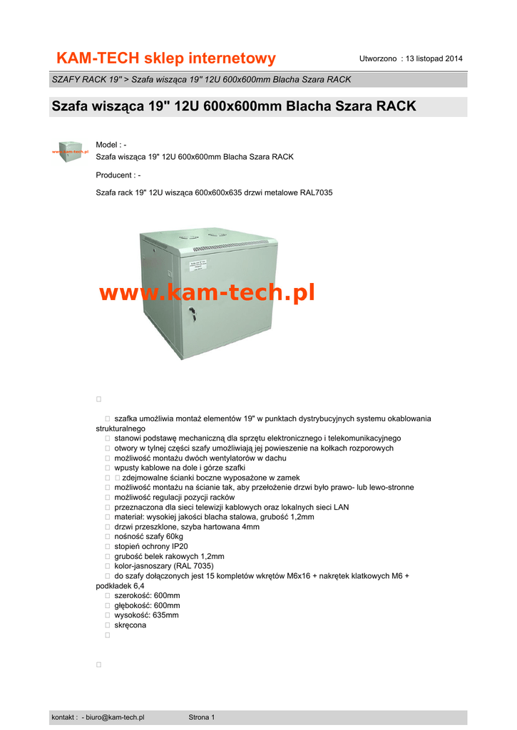 KAM-TECH sklep internetowy Utworzono : 13 listopad 2014 SZAFY RACK 19" > Szafa wisząca 19" 12U 600x600mm Blacha Szara RACK Szafa wisząca 19" 12U 600x600mm Blacha Szara RACK Model : Szafa wisząca 19" 12U 600x600mm Blacha Szara RACK Producent : Szafa rack 19" 12U wisząca 600x600x635 drzwi metalowe RAL7035 � � szafka umożliwia montaż elementów 19" w punktach dystrybucyjnych systemu okablowania strukturalnego � stanowi podstawę mechaniczną dla sprzętu elektronicznego i telekomunikacyjnego � otwory w tylnej części szafy umożliwiają jej powieszenie na kołkach rozporowych � możliwość montażu dwóch wentylatorów w dachu � wpusty kablowe na dole i górze szafki � �zdejmowalne ścianki boczne wyposażone w zamek � możliwość montażu na ścianie tak, aby przełożenie drzwi było prawo- lub lewo-stronne � możliwość regulacji pozycji racków � przeznaczona dla sieci telewizji kablowych oraz lokalnych sieci LAN � materiał: wysokiej jakości blacha stalowa, grubość 1,2mm � drzwi przeszklone, szyba hartowana 4mm � nośność szafy 60kg � stopień ochrony IP20 � grubość belek rakowych 1,2mm � kolor-jasnoszary (RAL 7035) � do szafy dołączonych jest 15 kompletów wkrętów M6x16 + nakrętek klatkowych M6 + podkładek 6,4 � szerokość: 600mm � głębokość: 600mm � wysokość: 635mm � skręcona � � kontakt : - [email protected] Strona 1 KAM-TECH sklep internetowy Utworzono : 13 listopad 2014 SZAFY RACK 19" > Szafa wisząca 19" 12U 600x600mm Blacha Szara RACK Szafa wisząca 19" 12U 600x600mm Blacha Szara RACK Cena : 756,45 zł Brutto ( 615,00 zł Netto) Dostępność: Produkt dostępny w naszym sklepie od 08 maj 2014 kontakt : - [email protected] Strona 2