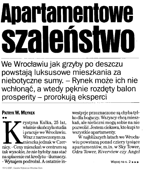 Apartamentowe szaleństwo We Wrocławiu jak grzyby po deszczu powstają luksusowe mieszkania za niebotyczne sumy. - Rynek może ich nie wchłonąć, a wtedy pęknie rozdęty balon prosperity - prorokują eksperci PATRYK W. MŁYNEK *• ystyna Kulka, 25 lat, vłaśnie skończyła studia pracuje we Wrocławiu, iVraz z narzeczonym za nieszkajednak w Czernicy. - Ceny mieszkań w centrum są takwysokie, żeniebyłobynasstać na spłacenie rat kredytu - tłumaczy. - Wynajem podrożał. A ostatnie in- E westycje przeznaczone są chyba tylko dla bogaczy. Wszyscy chcą mieszkań.alenieUcznimogąsobienanie pozwolić. Jestem ciekawa, kto kupi te wszystkie apartamenty. W najbliższych latach we Wroclawiu powstaną ponad cztery tysiące apartamentów, m.in. w Sky Tower, Odra Tower, Riverview czy Angel Więcej na s. 2 »•» » Apartamentowe szaleństwo Ciąg dalszy z s. l*** Wings na Przedmieściu Oławskim. Ich ceny oscylują wokół 15 tyś. zł za m kw. Zdarzają się również wyższe. - Ceny ustabilizowały się, ale na pewno nie spadną, a jeżeli już, to dopiero w 2009 roku - szacuje Aleksander Scheller, prezydent Polskiej Federacji Rynku Nieruchomości. - Tylko że spadek cen rozpocznie się z pułapu o połowę wyższego od cen obecnych. Wyprzedzamy Zachód - Na razie jest to świetny biznes dla deweloperów, bo każdy chce uderzyć w najdroższy segment - wyjaśnia Jacek Wróblewski, specjalista ds. rynku nieruchomości. - Koszty budowy takich obiektów są o 20-30 proc. wyższe, a można dostać za nie nawet o 50 proc. więcej. Eksperci przestrzegają jednak, że obecna sytuacja, nie tylko na Dolnym Śląsku, ale w całej Polsce, może być zwiastunem kryzysu, jaki miał miejsce w Stanach Zjednoczonych, Hiszpanii i we wschodnich Niem- czech. W tych krajach banki udzielały mnóstwa kredytów na preferencyjnych warunkach osobom, które później nie były w stanie ich spłacić. Ceny poleciały w dół, a spekulanci kupujący mieszkania i apartamenty, licząc na łatwy dochód, nie zarobili nic. - Kupowali całe piętra i nie wprowadzali się do nich, licząc na krociowe zyski w przyszłości - mówi Anthony F. Souza, prezydent Amerykańskiego Stowarzyszenia Doradców Rynku Nieruchomości. - Tuż przed kryzysem było ich u nas 35 proc., a zdrowa sytuacja na rynku jest taka, wktórej spekulanci stanowią nie więcej niż 10 proc. właścicieli. We Wrocławiu precyzyjne oszacowanie liczby spekulantówjest trudne. -W 2006 roku było ich od 10 do 30 proc. - ocenia Wróblewski. Uważa on, że spekulanci już kupili, co chcieli. - Na miejscu inwestorów bałbym się więc lokować kapitał w luksusowe kompleksy. Co nie oznacza, że Wrocław ich nie potrzebuje. Potrzebuje, ale obecnie oferta-jest skierowana do tzw. użytkownika końcowego lub inwestora, który nie oczekuje szyb- V1 Irlandzka firma Pathway Plaża między ul. Sikorskiego a Odrą wybuduje 134 apartamenty kiego zysku, lecz zadowoli się w miarę przyzwoitym czynszem. Grzegorz Roman, dyrektor Departamentu Architektury i Rozwoju Urzędu Miejskiego Wrocławia, tłumaczy, że centrum miastajest dla ludzi, którzy mają przyzwoity status i dobrze zarabiają; - Wszędzie w metropoliach GAZETA DOM REDAGUJE: zespół; ul. Czerska 8/10, 00-732 Warszawa, tel. O 22 555 49 98, faks:0225554627, email: [email protected] BIURO OGŁOSZEŃ- Wrocław, pl. Solny 2/3, tel. 071 371 73 55, faks 071 371 73 86 WYDAWCA: Agora SA, ul. Czerska 8/10. 00-732 Warszawa; DRUK: Agora SA; ISSN 1506-5855 |H Wydawca nie odpowiada za zawarta. w ogłoszeniu deklarację Eksperci od dawna powtarzają, że we Wrocławiu brakuje około 40 tyś. mieszkań. Popyt jest więc duży, ale nie wszyscy mają zdolnośćkredytową na zakup jakiegokolwiek loKoniunktura kum. - Nadzieja w rozwoju gospodarnie trwa wiecznie czym i rosnących wynagrodzeniach, Grzegorz Roman uważa, że dewelo- co na razie się sprawdza - mówi perzybudująluksus, bo wierzą, że jest Wróblewski. Jacek Furga ze Związku Banków na niego zapotrzebowanie. - A w przypadku Wrocławia większy popyt jest Polskich uważa, że kryzys nadejdzie na tańsze mieszkania. 'Ie ekskluzyw- wcześniej czy później: - Wszyscy myne lokale stanowią około 20 proc. ślą, że rentowność przyjdzie z czasem. mieszkań oddawanych do użytku rocz- Takie myślenie może okazać się złudnie we Wrocławiu. ne. Marek Kończak, rzeczoznawca maCzy nowe apartamenty zostaną jątkowy, przekonuje, że przy tak duwchłonięte przez rynek? - Na pewno te najlepiej zlokalizowa- żym popycie krach nam nie grozi: ne, unikatowe, w bardzo dobrym stan- - Zmniejszy się jedynie dynamika dardzie znajdą swoich nabywców sprzedaży apartamentów. Anthony F. Souza: - Kryzys może - twierdzi Wróblewski. - Część jednak tych inwestycjipretendujp do tytułu luk- wam grozić, ale nikt niejest w stanie susowych apartamentów, alejest źle zlo- przewidzieć, jaki będzie on miai rozkalizowana, nie znajdzie nabywców po miar i natężenie. Bo jeżeli wzrost bęwygórowanych cenach i deweloperzy dzie taki jak teraz, to za pięć lat ceny będą musieli je obniżyć. Staną się one będą u was wyższe niż w Kalifornii. Ja wtedy pospolitymi mieszkaniami. w to po prostu nie wierzę.O takjest. Te procesy zachodzą też u nas, i to na wielką skalę. Dla przykładu -już wyprzedziliśmy niektóre dzielnice Berlinajeżeli chodzi o ceny mieszkań.