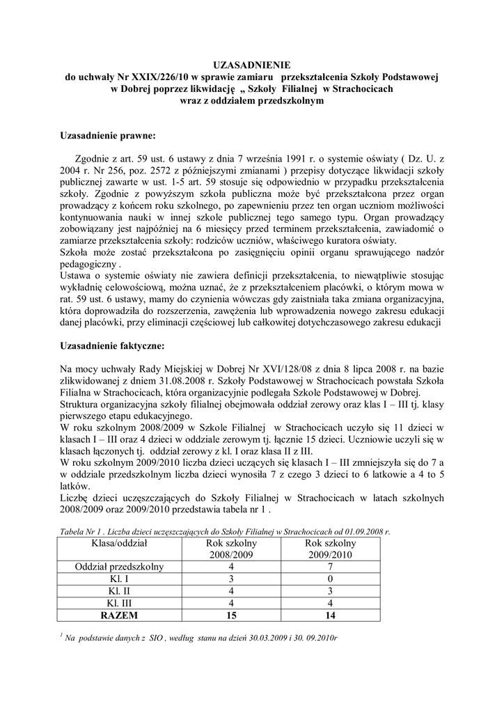 UZASADNIENIE do uchwały Nr XXIX/226/10 w sprawie zamiaru przekształcenia Szkoły Podstawowej w Dobrej poprzez likwidację „ Szkoły Filialnej w Strachocicach wraz z oddziałem przedszkolnym Uzasadnienie prawne: Zgodnie z art. 59 ust. 6 ustawy z dnia 7 września 1991 r. o systemie oświaty ( Dz. U. z 2004 r. Nr 256, poz. 2572 z późniejszymi zmianami ) przepisy dotyczące likwidacji szkoły publicznej zawarte w ust. 1-5 art. 59 stosuje się odpowiednio w przypadku przekształcenia szkoły. Zgodnie z powyższym szkoła publiczna może być przekształcona przez organ prowadzący z końcem roku szkolnego, po zapewnieniu przez ten organ uczniom możliwości kontynuowania nauki w innej szkole publicznej tego samego typu. Organ prowadzący zobowiązany jest najpóźniej na 6 miesięcy przed terminem przekształcenia, zawiadomić o zamiarze przekształcenia szkoły: rodziców uczniów, właściwego kuratora oświaty. Szkoła może zostać przekształcona po zasięgnięciu opinii organu sprawującego nadzór pedagogiczny . Ustawa o systemie oświaty nie zawiera definicji przekształcenia, to niewątpliwie stosując wykładnię celowościową, można uznać, że z przekształceniem placówki, o którym mowa w rat. 59 ust. 6 ustawy, mamy do czynienia wówczas gdy zaistniała taka zmiana organizacyjna, która doprowadziła do rozszerzenia, zawężenia lub wprowadzenia nowego zakresu edukacji danej placówki, przy eliminacji częściowej lub całkowitej dotychczasowego zakresu edukacji Uzasadnienie faktyczne: Na mocy uchwały Rady Miejskiej w Dobrej Nr XVI/128/08 z dnia 8 lipca 2008 r. na bazie zlikwidowanej z dniem 31.08.2008 r. Szkoły Podstawowej w Strachocicach powstała Szkoła Filialna w Strachocicach, która organizacyjnie podlegała Szkole Podstawowej w Dobrej. Struktura organizacyjna szkoły filialnej obejmowała oddział zerowy oraz klas I – III tj. klasy pierwszego etapu edukacyjnego. W roku szkolnym 2008/2009 w Szkole Filialnej w Strachocicach uczyło się 11 dzieci w klasach I – III oraz 4 dzieci w oddziale zerowym tj. łącznie 15 dzieci. Uczniowie uczyli się w klasach łączonych tj. oddział zerowy z kl. I oraz klasa II z III. W roku szkolnym 2009/2010 liczba dzieci uczących się klasach I – III zmniejszyła się do 7 a w oddziale przedszkolnym liczba dzieci wynosiła 7 z czego 3 dzieci to 6 latkowie a 4 to 5 latków. Liczbę dzieci uczęszczających do Szkoły Filialnej w Strachocicach w latach szkolnych 2008/2009 oraz 2009/2010 przedstawia tabela nr 1 . Tabela Nr 1 . Liczba dzieci uczęszczających do Szkoły Filialnej w Strachocicach od 01.09.2008 r. Klasa/oddział Oddział przedszkolny Kl. I Kl. II Kl. III RAZEM 1 Rok szkolny 2008/2009 4 3 4 4 15 Rok szkolny 2009/2010 7 0 3 4 14 Na podstawie danych z SIO , według stanu na dzień 30.03.2009 i 30. 09.2010r Według informacji uzyskanych z ewidencji ludności Urzędu Miejskiego w Dobrej liczba dzieci urodzonych w latach 2004 – 2009 w Gminie Dobra przedstawia się następująco: Tabela nr 2. Liczba dzieci urodzonych w gminie Dobra w latach 2004 – 2009 według stanu na dzień 05.02.2010 r. Rok szkolny 2004 2005 2006 2007 2008 2009 46 60 44 56 60 61 3 1 4 5 5 3 18 15 10 20 18 17 64 75 54 76 78 78 Miejscowość Obwód Szkoły Podstawowej w Dobrej w tym Szkoły Filialnej w Strachocicach Obwód Szkoły Podstawowej w Piekarach Razem Dane zamieszczone w tabelach potwierdzają spadek liczby urodzeń, a w konsekwencji zmniejszenie liczby uczniów w poszczególnych klasach wszystkich istniejących szkół na terenie gminy w tym również Szkoły Filialnej w Strachocicach. W tej sytuacji funkcjonowanie Szkoły Filialnej w Strachocicach staje się nieracjonalne. Proponuje się likwidację tej filii od 1 września 2010r. Po likwidacji szkoły filialnej uczniowie klas I – III byliby dowożeni autobusem szkolnym do Dobrej / maksymalna odległość 10,5 km /, którym dowożeni są już uczniowie od klas IV i następnych. Dzieci 3-6 – letnie uczęszczałyby nadal do oddziału przedszkolnego, który organizacyjnie zostałby podporządkowany Przedszkolu Samorządowemu w Dobrej . Szkoła Podstawowa w Dobrej posiada wykwalifikowaną kadrę pedagogiczną, pracownię komputerową z dostępem do internetu, bibliotekę, świetlicę , stołówkę , niepełnowymiarową salę gimnastyczna i boisko sportowe. Za likwidacją szkoły filialnej w Strachocicach przemawiają głównie względy demograficzne oraz bliskie sąsiedztwo dobrze wyposażonej szkoły z wykwalifikowaną kadrą a także fakt, że dzieci nie będą się uczyć w klasach łączonych. W Szkole Filialnej w Strachocicach wykonuję pracę 3 nauczycieli z czego jeden to Kierownik Filii uczący już również w szkole macierzystej w Dobrej a drugi to nauczyciel oddziału przedszkolnego, który pozostałby w budynku szkoły. Oznacza to, że kadra ze zlikwidowanej szkoły filialnej otrzymała by możliwość pracy w Szkole Podstawowej w Zespole Szkół Publicznych w Dobrej ( 2 osoby ) lub w Przedszkolu Samorządowym w Dobrej z miejscem jej wykonywania w Strachocicach w jego oddziale zamiejscowym. Przyjęcie dzieci ze Strachocic do klas I-III w Dobrej nie pogorszy warunków nauczania, ani też konieczności tworzenia dodatkowych oddziałów. Wobec powyższego podjęcie uchwały jest uzasadnione.