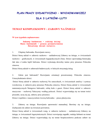 PLAN PRACY DYDAKTYCZNO – WYCHOWAWCZEJ DLA 3 LATKÓW-LUTY TEMAT KOMPLEKSOWY : ZABAWY NA ŚNIEGU W tym tygodniu zaplanowano: Zabawy badawcze – robimy śnieg Nasz bałwanek – praca przestrzenna Światowy dzień nutelli 1. Ulepimy bałwanka. Rozwijanie mowy. Dzieci biorą udział w zabawie ruchowo – naśladowczej Zabawy na śniegu, w ćwiczeniach ruchowo – graficznych, w ćwiczeniach logopedycznych Zima. Dzieci opowiadają historyjkę Jak tata z Lenka lepili bałwana. Dzieci wykonują dowolny taniec przy piosence Poleczka zimowa. Dzieci biorą udział w zabawach badawczych, w których otrzymają śnieg. 2. Gdzie jest bałwanek? Rozwijanie orientacji przestrzennej. Poleczka zimowa. Umuzykalnianie dzieci. Dzieci biorą udział w zabawie ruchowej Na saneczkach, w ćwiczeniach analizy i syntezy wzrokowej, w zabawie przy piosence Poleczka zimowa. Dzieci biorą udział w ćwiczeniach matematycznych Śniegowe bałwanki, robią kule z gazet. Dzieci biorą udział w zabawie muzyczno – ruchowej Tańczymy według poleceń. Dzieci wypowiadają się na temat treści piosenki, uczą się jej, zabawy przy piosence. Dzieci wspólnie z nauczycielem tworzą bałwanka – praca plastyczna. 3. Zabawy na śniegu. Rozwijanie sprawności manualnej. Bawimy się na śniegu. Zachęcanie do zabaw na świeżym powietrzu. Dzieci biorą udział w ćwiczeniach warg, w zabawie ruchowo – naśladowczej Zabawy na śniegu, w ćwiczeniach logorytmicznych. Dzieci rozwiązują zagadki, malują farbami na temat Zabawy na śniegu. Dzieci wypowiadają się na temat bezpieczeństwa podczas zabaw na śniegu. Zabawy na śniegu na placu przedszkolnym. Dzieci biorą udział w zabawach zorganizowanych z okazji dnia nutelli. W TYM TYGODNIU ZAPLANOWANO KÓŁKO ZAINTERESOWAŃ MALI ODKRYWCY – POZNAJEMY ŚWIAT BADAMY POWSTANIE ŚNIEGU Dzieci będą tworzyły śnieg z pieluchy. TEMAT KOMPLEKSOWY : TAK MIJA NAM CZAS W tym tygodniu zaplanowano: Kółko Inspiracje plastyczne Dzień i noc – tworzymy plakat Poczytaj mi mamo, poczytaj mi tato Tworzymy zegar – odmierzacz czasu wycieczka do zegarmistrza 1. Co robimy rano. Rozwijanie mowy. Dzieci biorą udział w zabawie ruchowo – naśladowczej Co robimy rano?, uczą się rymowanki, w zabawie orientacyjno – porządkowej Na krzesełku, za krzesełkiem. Dzieci opowiadają historyjkę obrazkową Co robi Lenka rano?. Dzieci biorą udział w zabawie bieżnej Zamieniamy się miejscami. Dzieci biorą udział w spacerze. Dzieci wykonują pracę na konkurs plastyczny. 2. Noc i dzień. Dostrzeganie cykliczności dnia i nocy. Dzieci biorą udział w zabawie bieżnej Zamieniamy się miejscami, w zabawie ruchowo – naśladowczej Co robimy w dzień?, co robimy w nocy?. Dzieci biorą udział w zabawie dydaktycznej Dzień i noc. Dzieci rysują słońce i księżyc, które wykorzystują do plakatu Dzień i noc. Dzieci mówią rymowankę i wykonują określone ruchy. 3. Ta Dorotka. Umuzykalnianie dzieci. Dzieci biorą udział w zabawie przy piosence Ta Dorotka, rozmawiają na temat piosenki, uczą się jej. Dzieci biorą udział w zabawie Obrazki, w zabawie bieżnej Zamieniamy się miejscami, w zabawie woreczkami, w zabawie orientacyjno – porządkowej Jak misie i laleczki. Dzieci słuchają bajki czytanej przez zaproszonego gościa. 4. Jestem duży, byłem mały. Rozwijanie sprawności manualnej. Dzieci biorą udział w zabawie Który kolor do środka?, w zabawie orientacyjno – porządkowej Jak misie i laleczki. Dzieci rysują siebie jako osobę dorosłą Małe dzieci, duże dzieci. Dzieci słuchają wiersza D. Gellner Jestem duży, rozmowa na temat wiersza, ilustracja ruchowa wiersza. Dzieci wspólnie z nauczycielem tworzą zegar – odmierzacz czasu. 5. Kolorowe sny. Rozwijanie mowy. Dzieci wypowiadają się na temat Dlaczego spać jest fajnie? Po wysłuchaniu opowiadania O. Masiuk. Dzieci biorą udział w zabawie Budzimy Jasia – ćwiczenia słownikowe i działanie praktyczne. Dzieci biorą udział w zabawie Kto o czym śni – graficzne zgadywanki . Mój sen– rysowanie kredkami pastelowymi na różowych chmurkach tego, co śniło się dzieciom lub tego, co chciałyby, żeby im się przyśniło. Dzieci biorą udział w wycieczce do zegarmistrza. W TYM TYGODNIU ZAPLANOWANO KÓŁKO ZAINTERESOWAŃ INSPIRACJE PLASTYCZNE Zimowy przyjaciel zwierząt WOJEWÓDZKI KONKURS PLASTYCZNY Dzieci mają za zadanie wykonać pracę na konkurs plastyczny zorganizowany Ogród zoologiczny w Zamościu. TEMAT KOMPLEKSOWY : KARNAWAŁ W tym tygodniu zaplanowano: Dekorujemy salę na bal Walentynki Bal karnawałowy Dzień poczty polskiej Dzień kota 1. Karnawałowe przebieranki. Rozwijanie twórczości dzieci. Dzieci biorą udział w zabawie rozwijającej spostrzegawczość Maski, w zabawie dydaktycznej Karnawałowe przebieranki dobieranie obrazków w pary, składanie obrazka z dwóch części. Dzieci słuchają wiersza Karnawał Z. Dmitrocy, rozmowa na temat jego treści. Dzieci robią maski karnawałowe. Dzieci biorą udział w dekorowaniu sali na bal karnawałowy. 2. Walentynki. Rozwijanie umiejętności okazywania uczuć. Dzieci biorą udział w zabawie „Czerwone serduszko” – rozmowa na temat Walentynek. Słuchanie ciekawostek na temat Walentynek. Rozmowa na podstawie wiersza Mała Walentynka. Dzieci biorą udział w walentynkowej zgaduj-zgadula. Zabawy przy muzyce. Wykonanie serduszka walentynkowego. 3. Bal karnawałowy. Zapoznanie dzieci z tradycją zabawy karnawałowej i zachęcenie do jej kultywowania. Integracja dzieci podczas wspólnej zabawy. Dzieci biorą udział w zabawie Zaczarowane pudełko, Płatki śniegu. Tańce, piosenki, zabawy i konkursy prowadzone przez nauczycieli, tańce przebierańców, tańce z balonami, z kartkami, z butelkami. Dzieci rozwiązują bajkowe zagadki. Dzieci wykonują balowe stworki. 4. Karnawałowe stroje. Rozwijanie wyobraźni dzieci. Dzieci oglądają ilustracje strojów karnawałowych i wypowiadają się na ich temat. Dzieci zamieniają się w projektantów i proje