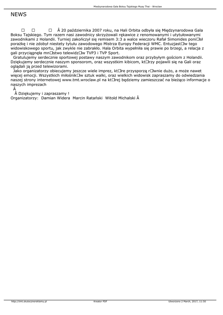 Miedzynarodowa Gala Boksu Tajskiego Muay Thai - Wroclaw NEWS  20 października 2007 roku, na Hali Orbita odbyła się Międzynarodowa Gala Boksu Tajskiego. Tym razem nasi zawodnicy skrzyżowali rękawice z renomowanymi i utytułowanymi zawodnikami z Holandii. Turniej zakończył się remisem 3:3 a walce wieczoru Rafał Simonides poniÃłsł porażkę i nie zdobył niestety tytułu zawodowego Mistrza Europy Federacji WMC. EntuzjastÃłw tego widowiskowego sportu, jak zwykle nie zabrakło. Hala Orbita wypełniła się prawie po brzegi, a relacja z gali przyciągnęła mnÃłstwo telewidzÃłw TVP3 i TVP Sport. Gratulujemy serdecznie sportowej postawy naszym zawodnikom oraz przybyłym gościom z Holandii. Dziękujemy serdecznie naszym sponsorom, oraz wszystkim kibicom, ktÃłrzy pojawili się na Gali oraz oglądali ją przed telewizorami. Jako organizatorzy obiecujemy jeszcze wiele imprez, ktÃłre przysporzą rÃłwnie dużo, a może nawet więcej emocji. Wszystkich miłośnikÃłw sztuk walki, oraz wielkich widowisk zapraszamy do odwiedzania naszej strony internetowej www.tmt.wroclaw.pl na ktÃłrej będziemy zamieszczać na bieżąco informacje o naszych imprezach   Dziękujemy i zapraszamy ! Organizatorzy: Damian Widera Marcin Ratański Witold Michalski  http://tmt.skutecznereklamy.pl Kreator PDF Utworzono 2 March, 2017, 11:50