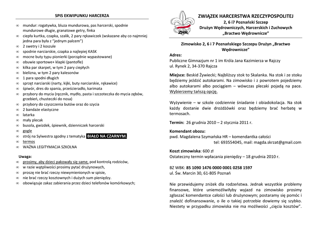 SPIS EKWIPUNKU HARCERZA • • • • • • • • • • • • • • • • • • • • • • • • • • mundur: rogatywka, bluza mundurowa, pas harcerski, spodnie mundurowe długie, granatowe getry, finka ciepła kurtka, czapka, szalik, 2 pary rękawiczek (wskazane aby co najmniej jedna para była z “jednym palcem”) 2 swetry i 2 koszule spodnie narciarskie, czapka a najlepiej KASK mocne buty typu pionierki (porządnie wypastowane) obuwie sportowe+ klapki (pantofle) kilka par skarpet, w tym 2 pary ciepłych bielizna, w tym 2 pary kalesonów 1 para spodni długich sprzęt narciarski (narty, kijki, buty narciarskie, rękawice) śpiwór, dres do spania, prześcieradło, karimata przybory do mycia (ręcznik, mydło, pasta i szczoteczka do mycia zębów, grzebień, chusteczki do nosa) przybory do czyszczenia butów oraz do szycia 2 bandaże elastyczne latarka mały plecak busola, gwizdek, śpiewnik, dzienniczek harcerski gogle strój na Sylwestra zgodny z tematyka .BIAŁO NA CZARNYM. termos WAŻNA LEGITYMACJA SZKOLNA Uwaga: prosimy, aby dzieci pakowały się same, pod kontrolą rodziców, w razie wątpliwości prosimy pytać drużynowych, proszę nie brać rzeczy niewymienionych w spisie, nie brać rzeczy kosztownych i dużych sum pieniędzy. obowiązuje zakaz zabierania przez dzieci telefonów komórkowych; ZWIĄZEK HARCERSTWA RZECZYPOSPOLITEJ 2, 6 i7 Poznański Szczep Drużyn Wędrowniczych, Harcerskich i Zuchowych „Bractwo Wędrownicze” Zimowisko 2, 6 i 7 Poznańskiego Szczepu Drużyn „Bractwo Wędrownicze” Adres: Publiczne Gimnazjum nr 1 im Króla Jana Kazimierza w Rajczy ul. Rynek 2, 34-370 Rajcza Miejsce: Beskid Żywiecki; Najbliższy stok to Skalanka. Na stok i ze stoku będziemy jeździć autokarami. Na zimowisko i z powrotem pojedziemy albo autokarami albo pociągiem – wówczas plecaki pojadą na pace. Wybierzemy tańszą opcję. Wyżywienie – w szkole codziennie śniadanie i obiadokolacja. Na stok każdy dostanie dwie drożdżówki oraz będziemy brać herbatę w termosach. Termin: 26 grudnia 2010 – 2 stycznia 2011 r. Komendant obozu: pwd. Magdalena Szymańska HR – komendantka całości tel: 693554045, mail: [email protected] Koszt zimowiska: 600 zł Ostateczny termin wpłacania pieniędzy – 18 grudnia 2010 r. BZ WBK: 85 1090 1476 0000 0001 0258 1597 ul. Św. Marcin 30, 61-805 Poznań Nie przewidujemy zniżek dla rodzeństwa. Jednak wszystkie problemy finansowe, które uniemożliwiłyby wyjazd na zimowisko prosimy zgłaszać komendantce całości lub drużynowym; postaramy się pomóc i znaleźć dofinansowanie, o ile o takiej potrzebie dowiemy się szybko. Niestety w przypadku zimowiska nie ma możliwości „cięcia kosztów”. Cena zimowiska tworzą koszty przejazdów, karnetów na wyciągi, wyżywienia i noclegu. Ostateczny termin składania kart kwalifikacyjnych wraz z podpisanym regulaminem – 16 grudnia 2010. Jeśli karta nie będzie kompletnie wypełniona (dotyczy to zwłaszcza numerów pesel) oraz jeśli nie będzie dołączony podpisany regulamin, dziecko nie zostanie wpisane na listę uczestników. Dyżury: 1. czwartek, 9 grudnia godz. 17:15-18:15 KIK (ul. Klin 9), 2. poniedziałek 13 grudnia godz. 18:00-19:00 Akademia Muzyczna – przy portierni (ul. Św. Marcin, na przeciwko Krzyży Poznańskich). 3. czwartek, 16 grudnia godz. 18:00-19:00 KIK SPIS EKWIPUNKU HARCERKI • • • • • • • • • • • • • • • • • • • • • mundur: beret, bluza mundurowa, pas harcerski, spódnica mundurowa, granatowe getry, ciepła kurtka, czapka, szalik, 2 pary rękawiczek (wskazane aby co najmniej jedna para była z “jednym palcem”) 2 swetry i 2 koszule spodnie narciarskie, czapka a najlepiej KASK mocne buty typu pionierki (porządnie wypastowane) obuwie sportowe + klapki (pantofle) kilka par skarpet, w tym 2 pary bardzo ciepłe bielizna, w tym 2 pary rajstop (co najmniej jedna para czarna) 1 para spodni długich sprzęt narciarski (narty, kijki, buty narciarskie, rękawice) śpiwór, dres do spania, prześcieradło przybory do mycia (ręcznik, mydło, pasta i szczoteczka do mycia zębów, grzebień, chusteczki do nosa) przybory do czyszczenia butów oraz do szycia 2 bandaże elastyczne latarka mały plecak busola, gwizdek, śpiewnik, dzienniczek harcerski gogle strój na Sylwestra zgodny z tematyka .BIAŁO NA CZARNYM. termos WAŻNA LEGITYMACJA SZKOLNA Uwaga: • prosimy, aby dzieci pakowały się same, pod kontrolą rodziców, • w razie wątpliwości prosimy pytać drużynowych, • proszę nie brać rzeczy niewymienionych w spisie, • nie brać rzeczy kosztownych i dużych sum pieniędzy. • obowiązuje zakaz zabierania przez dzieci telefonów komórkowych;