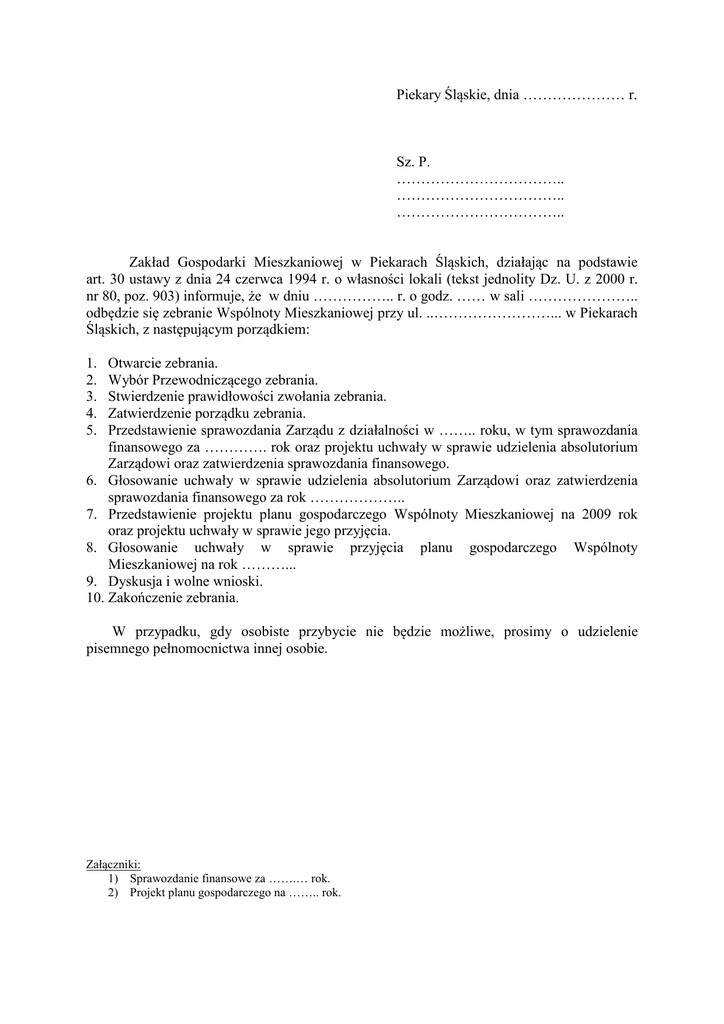 Piekary Śląskie, dnia ………………… r. Sz. P. …………………………….. …………………………….. …………………………….. Zakład Gospodarki Mieszkaniowej w Piekarach Śląskich, działając na podstawie art. 30 ustawy z dnia 24 czerwca 1994 r. o własności lokali (tekst jednolity Dz. U. z 2000 r. nr 80, poz. 903) informuje, że w dniu …………….. r. o godz. …… w sali ………………….. odbędzie się zebranie Wspólnoty Mieszkaniowej przy ul. ..……………………... w Piekarach Śląskich, z następującym porządkiem: 1. 2. 3. 4. 5. Otwarcie zebrania. Wybór Przewodniczącego zebrania. Stwierdzenie prawidłowości zwołania zebrania. Zatwierdzenie porządku zebrania. Przedstawienie sprawozdania Zarządu z działalności w …….. roku, w tym sprawozdania finansowego za …………. rok oraz projektu uchwały w sprawie udzielenia absolutorium Zarządowi oraz zatwierdzenia sprawozdania finansowego. 6. Głosowanie uchwały w sprawie udzielenia absolutorium Zarządowi oraz zatwierdzenia sprawozdania finansowego za rok ……………….. 7. Przedstawienie projektu planu gospodarczego Wspólnoty Mieszkaniowej na 2009 rok oraz projektu uchwały w sprawie jego przyjęcia. 8. Głosowanie uchwały w sprawie przyjęcia planu gospodarczego Wspólnoty Mieszkaniowej na rok ………... 9. Dyskusja i wolne wnioski. 10. Zakończenie zebrania. W przypadku, gdy osobiste przybycie nie będzie możliwe, prosimy o udzielenie pisemnego pełnomocnictwa innej osobie. Załączniki: 1) Sprawozdanie finansowe za …….… rok. 2) Projekt planu gospodarczego na …….. rok.