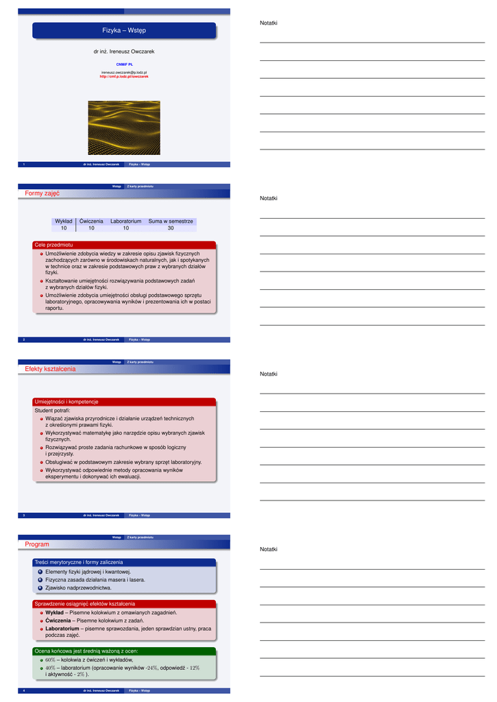 Notatki Fizyka – Wstep ˛ dr inż. Ireneusz Owczarek CNMiF PŁ [email protected] http://cmf.p.lodz.pl/iowczarek 1 dr inż. Ireneusz Owczarek Wstep ˛ Fizyka – Wstep ˛ Z karty przedmiotu Formy zajeć ˛ Wykład 10 Notatki Ćwiczenia 10 Laboratorium 10 Suma w semestrze 30 Cele przedmiotu Umożliwienie zdobycia wiedzy w zakresie opisu zjawisk fizycznych zachodzacych ˛ zarówno w środowiskach naturalnych, jak i spotykanych w technice oraz w zakresie podstawowych praw z wybranych działów fizyki. Kształtowanie umiejetności ˛ rozwiazywania ˛ podstawowych zadań z wybranych działów fizyki. Umożliwienie zdobycia umiejetności ˛ obsługi podstawowego sprz˛etu laboratoryjnego, opracowywania wyników i prezentowania ich w postaci raportu. 2 dr inż. Ireneusz Owczarek Wstep ˛ Fizyka – Wstep ˛ Z karty przedmiotu Efekty kształcenia Notatki Umiejetności ˛ i kompetencje Student potrafi: Wiazać ˛ zjawiska przyrodnicze i działanie urzadze ˛ ń technicznych z określonymi prawami fizyki. Wykorzystywać matematyk˛e jako narz˛edzie opisu wybranych zjawisk fizycznych. Rozwiazywać ˛ proste zadania rachunkowe w sposób logiczny i przejrzysty. Obsługiwać w podstawowym zakresie wybrany sprz˛et laboratoryjny. Wykorzystywać odpowiednie metody opracowania wyników eksperymentu i dokonywać ich ewaluacji. 3 dr inż. Ireneusz Owczarek Wstep ˛ Fizyka – Wstep ˛ Z karty przedmiotu Program Notatki Treści merytoryczne i formy zaliczenia 1 Elementy fizyki jadrowej ˛ i kwantowej. 2 Fizyczna zasada działania masera i lasera. 3 Zjawisko nadprzewodnictwa. Sprawdzenie osiagni ˛ eć ˛ efektów kształcenia Wykład – Pisemne kolokwium z omawianych zagadnień. Ćwiczenia – Pisemne kolokwium z zadań. Laboratorium – pisemne sprawozdania, jeden sprawdzian ustny, praca podczas zajeć. ˛ Ocena końcowa jest średnia˛ ważona˛ z ocen: 60% – kolokwia z ćwiczeń i wykładów, 40% – laboratorium (opracowanie wyników -24%, odpowiedź - 12% i aktywność - 2% ). 4 dr inż. Ireneusz Owczarek Fizyka – Wstep ˛ Wstep ˛ Z karty przedmiotu Literatura podstawowa Notatki Kania S. Wykłady z fizyki cz. 1 i 2. Wydawnictwo PŁ, Łódź 2012. Halliday D., Resnick R, Walker J. Podstawy Fizyki t. 1-5. PWN, Warszawa 2005. Orear J. Fizyka t. I i II. WNT, Warszawa 1994. Sawieliew I. W. Wykłady z fizyki t. I-III. PWN, Warszawa 1994. Strona internetowa prowadzona przez CMF PŁ http://cmf.p.lodz.pl/efizyka e-Fizyka. Podstawy fizyki. Kakol ˛ Z. Żukrowski J. http://home.agh.edu.pl/˜kakol/wyklady_pl.htm Wykłady z fizyki. 5 dr inż. Ireneusz Owczarek Wstep ˛ Fizyka – Wstep ˛ Jak uczyć sie˛ fizyki? Obciażenie ˛ praca˛ studenta Notatki Systematyczna nauka na długo przed egzaminem i regularne powtarzanie – to rzadko praktykowany sposób przygotowania do egzaminu. W jaki sposób uczyć sie˛ fizyki? zrezygnować z uczenia sie˛ fizyki na pamie˛ ć!!!, poprawić umiejetno ˛ ści matematyczne, jeśli sa˛ one niewystarczajace, ˛ uczyć sie˛ wzorów fizycznych poprzez analiz˛e zagadnienia. Ogólne zasady uczenia sie˛ fizyki 1 Systematyczność. 2 Operatywność. 3 Posługiwanie sie˛ wyobraźnia. ˛ Zadawajcie pytania! Możecie zadawać pytania w każdym momencie. 6 dr inż. Ireneusz Owczarek Fizyka a rozwój nauki i techniki Fizyka – Wstep ˛ Nowe materiały CIEKAWOŚĆ na Marsie! Notatki 6 sierpnia (2012) o godzinie 7:31 powierzchni Czerwonej Planety dotknał˛ najpoteżniejszy ˛ z badajacych ˛ ja˛ łazików (CURIOSITY). Wyposażony w 10 instrumentów badawczych, w tym: działko laserowe ze spektrometrem przeprowadzajacym, ˛ na odległość, analiz˛e składu chemicznego, wiertło do drażenia ˛ dziur w glebie, ramie˛ zbierajace ˛ próbki gleby i skał, nuklearny reaktor termoelektryczny (4,8 kg 238 94 P u). 7 dr inż. Ireneusz Owczarek Fizyka a rozwój nauki i techniki Fizyka – Wstep ˛ Nowe materiały Nobel (2009) za żonglowanie światłem Nagrodzono pionierów obecnego świata informacji i obrazu. Naukowców, którzy wynaleźli matryce˛ CCD (stosowana˛ w fotografii cyfrowej) i zrewolucjonizowali przesyłanie bitów za pomoca˛ szklanych autostrad. Charles K. Kao, George E. Smith i Willard S. Boyle 8 dr inż. Ireneusz Owczarek Fizyka – Wstep ˛ Notatki Fizyka a rozwój nauki i techniki Nowe materiały Nobel (2010) za cudowny materiał – Andre Geim, Konstantin Nowoselow Notatki Grafen – weglowy ˛ plaster o grubości atomu – posiada wielka˛ wytrzymałość, dzieki ˛ niezwykle silnym wiazaniom ˛ miedzy ˛ atomami wegla ˛ – świetnie przewodzi prad. ˛ Nadzieja elektroniki, motoryzacji, energetyki, medycyny. To materiał, który w elektronice zdetronizuje krzem: Bardzo dobry przewodnik ciepła – zmierzona przewodność cieplna wynosi od 4840 do 5300 W/mK (srebro – 429 W/mK), Posiada niewielka˛ rezystancje, ˛ Jest niemal całkowicie przezroczysty (pochłania tylko 2,3 % światła), Jest ponad 100 razy mocniejszy niż stal, a zarazem tak elastyczny, że można go bez szkody rozciagn ˛ ać ˛ o 20 %. 9 dr inż. Ireneusz Owczarek Fizyka a rozwój nauki i techniki Fizyka – Wstep ˛ Nowe materiały Grafen Notatki Dr Włodzimierz Strupiński z Instytutu Technologii Materiałów Elektronicznych (ITME) stworzył technologie˛ produkcji grafenu najwyższej jakości, a ITME znalazł sie˛ na liście najważniejszych ośrodków zajmujacych ˛ sie˛ grafenem, obok laboratoriów IBM, MIT, Samsunga. Inne właściwości Grafenu Grubość: 0,34 nm – milion razy cieńszy niż kartka papieru. Waga: jeden 1 km2 grafenu waży 757 g – lekki jak piórko. Twardość: porównywalna z twardościa˛ diamentu. Przewodność elektryczna: miliard razy wyższa niż przewodność domieszkowanego krzemu w chipach komputerowych. 10 dr inż. Ireneusz Owczarek Fizyka a rozwój nauki i techniki Fizyka – Wstep ˛ Nowe materiały Nobel za kwanty pod kontrola˛ (2012) Notatki Nagroda za ujarzmienie kwantowego mikroświata – bedzie ˛ można stworzyć bardziej precyzyjne zegary i k