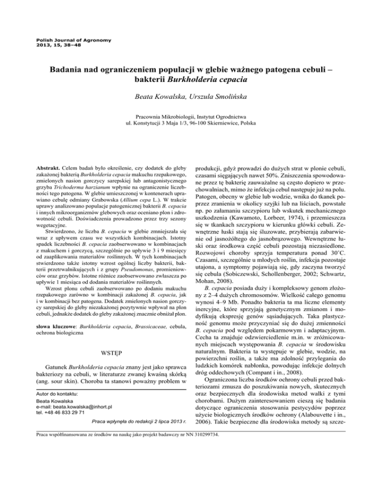 38 Polish Journal of Agronomy, No. 15, 2013 Polish Journal of Agronomy 2013, 15, 38–48 Badania nad ograniczeniem populacji w glebie ważnego patogena cebuli – bakterii Burkholderia cepacia Beata Kowalska, Urszula Smolińska Pracownia Mikrobiologii, Instytut Ogrodnictwa ul. Konstytucji 3 Maja 1/3, 96-100 Skierniewice, Polska Abstrakt. Celem badań było określenie, czy dodatek do gleby zakażonej bakterią Burkholderia cepacia makuchu rzepakowego, zmielonych nasion gorczycy sarepskiej lub antagonistycznego grzyba Trichoderma harzianum wpłynie na ograniczenie liczebności tego patogena. W glebie umieszczonej w kontenerach uprawiano cebulę odmiany Grabowska (Allium cepa L.). W trakcie uprawy analizowano populacje patogenicznej bakterii B. cepacia i innych mikroorganizmów glebowych oraz oceniano plon i zdrowotność cebuli. Doświadczenia prowadzono przez trzy sezony wegetacyjne. Stwierdzono, że liczba B. cepacia w glebie zmniejszała się wraz z upływem czasu we wszystkich kombinacjach. Istotny spadek liczebności B. cepacia zaobserwowano w kombinacjach z makuchem i gorczycą, szczególnie po upływie 3 i 9 miesięcy od zaaplikowania materiałów roślinnych. W tych kombinacjach stwierdzono także istotny wzrost ogólnej liczby bakterii, bakterii przetrwalnikujących i z grupy Pseudomonas, promieniowców oraz grzybów. Istotne różnice zaobserwowano zwłaszcza po upływie 1 miesiąca od dodania materiałów roślinnych. Wzrost plonu cebuli zaobserwowano po dodaniu makuchu rzepakowego zarówno w kombinacji zakażonej B. cepacia, jak i w kombinacji bez patogena. Dodatek zmielonych nasion gorczycy sarepskiej do gleby niezakażonej pozytywnie wpływał na plon cebuli, jednakże dodatek do gleby zakażonej znacznie obniżał plon. słowa kluczowe: Burkholderia cepacia, Brassicaceae, cebula, ochrona biologiczna WSTĘP Gatunek Burkholderia cepacia znany jest jako sprawca bakteriozy na cebuli, w literaturze zwanej kwaśną skórką (ang. sour skin). Choroba ta stanowi poważny problem w Autor do kontaktu: Beata Kowalska e-mail: [email protected] tel. +48 46 833 29 71 Praca wpłynęła do redakcji 2 lipca 2013 r. produkcji, gdyż prowadzi do dużych strat w plonie cebuli, czasami sięgających nawet 50%. Zniszczenia spowodowane przez tę bakterię zauważalne są często dopiero w przechowalniach, mimo że infekcja cebul następuje już na polu. Patogen, obecny w glebie lub wodzie, wnika do tkanek poprzez zranienia w okolicy szyjki lub na liściach, powstałe np. po załamaniu szczypioru lub wskutek mechanicznego uszkodzenia (Kawamoto, Lorbeer, 1974), i przemieszcza się w tkankach szczypioru w kierunku główki cebuli. Zewnętrzne łuski stają się śluzowate, przybierają zabarwienie od jasnożółtego do jasnobrązowego. Wewnętrzne łuski oraz środkowa część cebuli pozostają niezasiedlone. Rozwojowi choroby sprzyja temperatura ponad 30˚C. Czasami, szczególnie u młodych roślin, infekcja pozostaje utajona, a symptomy pojawiają się, gdy zaczyna tworzyć się cebula (Sobiczewski, Schollenberger, 2002; Schwartz, Mohan, 2008). B. cepacia posiada duży i kompleksowy genom złożony z 2–4 dużych chromosomów. Wielkość całego genomu wynosi 4–9 Mb. Ponadto bakteria ta ma liczne elementy inercyjne, które sprzyjają genetycznym zmianom i modyfikują ekspresję genów sąsiadujących. Taka plastyczność genomu może przyczyniać się do dużej zmienności B. cepacia pod względem pokarmowym i adaptacyjnym. Cecha ta znajduje odzwierciedlenie m.in. w zróżnicowanych miejscach występowania B. cepacia w środowisku naturalnym. Bakteria ta występuje w glebie, wodzie, na powierzchni roślin, a także ma zdolność przylegania do ludzkich komórek nabłonka, powodując infekcje dolnych dróg oddechowych (Compant i in., 2008). Ograniczona liczba środków ochrony cebuli przed bakteriozami zmusza do poszukiwania nowych, skutecznych oraz bezpiecznych dla środowiska metod walki z tymi chorobami. Dużym zainteresowaniem cieszą się badania dotyczące ograniczenia stosowania pestycydów poprzez użycie biologicznych środków ochrony (Alabouvette i in., 2006). Takie bezpieczne dla środowiska metody są szcze- Praca współfinansowana ze środków na naukę jako projekt badawczy nr NN 310299734. B. Kowalska, U. Smolińska – Badania nad ograniczeniem populacji bakterii Burkholderia cepacia w glebie gólnie istotne w rozwijających się ekologicznych i integrowanych metodach uprawy warzyw. Obiecujące perspektywy daje możliwość wykorzystania do tego celu substancji pochodzenia roślinnego. Rośliny stanowią bogate źródło związków – metabolitów wtórnych – odznaczających się biologiczną aktywnością. Według danych licznych badaczy ogromna większość roślin wyższych wydziela do otaczającego środowiska związki, które oddziałują na organizmy żywe. Spośród licznych aktywnych biologicznie związków roślinnych, takich jak: fenole, aldehydy, alkohole, olejki eteryczne, kwasy i terpeny, wiele działa hamująco lub zabójczo na bakteryjne patogeny roślin (Cowan, 1999; Utama i in., 2002). W roślinach z rodziny Brassicaceae jako wtórne metabolity występują glukozynolany, wykazujące toksyczne działanie w stosunku do patogenów roślin (Rosa, Rodrigues, 1999; Laegdsmand i in., 2007; Friberg i in., 2009; Bjorkman i in., 2011; Bohinc i in., 2012; Morales-Rodriguez i in., 2012; Motisi i in., 2013). Są one zlokalizowane w wakuolach, we wszystkich tkankach rośliny. Składają się z glukozy, sulfonowanego oksymu i łańcucha bocznego o strukturze alifatycznej, aromatycznej lub indolowej. Budowa łańcucha bocznego determinuje rodzaj związku. Hydroliza tych związków następuje przy udziale enzymu myrozynazy, który uaktywnia się po uszkodzeniu tkanek roślinnych. W trakcie tego procesu powstaje szereg aktywnych biologicznie związków, np. izotiocyjaniany, nitryle, tiocyjaniany (Underhill, 1980; Brown, Morra, 1997; Morra, Kirkegaard, 2002; Horbowicz, 2003; 