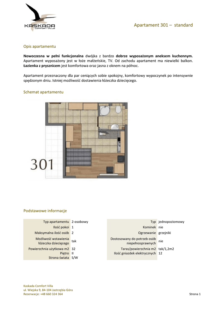 Apartament 301 – standard Opis apartamentu Nowoczesna w pełni funkcjonalna dwójka z bardzo dobrze wyposażonym aneksem kuchennym. Apartament wyposażony jest w łoże małżeńskie, TV. Od zachodu apartament ma niewielki balkon. Łazienka z prysznicem jest komfortowa oraz jasna z oknem na północ. Apartament przeznaczony dla par ceniących sobie spokojny, komfortowy wypoczynek po intensywnie spędzonym dniu. Istniej możliwość dostawienia łóżeczka dziecięcego. Schemat apartamentu Podstawowe informacje Typ apartamentu 2-osobowy Ilość pokoi 1 Maksymalna ilość osób 2 Możliwość wstawienia tak łóżeczka dziecięcego Powierzchnia użytkowa m2 32 Piętro II Strona świata S/W Kaskada Comfort Villa ul. Wiejska 9, 84-104 Jastrzębia Góra Rezerwacje: +48 660 324 364 Typ jednopoziomowy Kominek nie Ogrzewanie grzejniki Dostosowany do potrzeb osób nie niepełnosprawnych Taras/powierzchnia m2 tak/1,2m2 Ilość gniazdek elektrycznych 12 Strona 1 Apartament 301 – standard Podstawowe informacje Zestaw noży kuchennych Funkcjonalność Telewizor (cale)/ilość kanałów LCD 32/16 Odtwarzacz dvd tak Kabel HDMI tak / 6 sztuk Wyposażenie kuchni tak / 3 sztuki tak Zestaw łyżek do makaronu Pralka możliwość korzystania z pralni Zestaw drewnianych łyżek (3szt) tak Suszarka do włosów tak Durszlak tak Składana suszarka na bieliznę tak Półmisek tak Aneks kuchenny tak Kieliszki do wina tak / 6 sztuk Zmywarka/cm tak/45 Korkociąg tak Mikrofalówka tak Miska metalowa tak Lodówka/cm tak/ 80x60 Meble balkonowe tak Łóżko podwójne/ilość 1 Metalowy stojak pod garnki Korkowe podkładki pod garnki Szafki stojące/cm Łóżko pojedyncze/ilość 0 Łóżeczko dziecięce możliwość dostawienia Szafki wiszące/cm/ tak tak/ 3 sztuki tak/ łączna długość 140x57x86+71x58x86 tak/ łączna długość 179x63,5x32 Pokój dzienny Wyposażenie kuchni Czajnik elektryczny tak Zaparzacz do kawy tak Garnki (duży i mały) tak Patelnia tak Zastawa/ilość kpl (talerze, talerzyki, miski, tak/ po 6 sztuk kubki, filiżanki) Sztućce (łyżki, łyżeczki, noże, widelce) tak/ po 6 sztuk Płyta indukcyjna/ceramiczna/i tak/ dwa palniki lość palników Toster tak Opiekacz/gofrownica tak Blender tak Zlewozmywak tak Tarka tak Serwetnik tak Deska do krojenia tak Kaskada Comfort Villa ul. Wiejska 9, 84-104 Jastrzębia Góra Rezerwacje: +48 660 324 364 Kanapa rozkładana 2osobowa/cm nie Fotel nie Szafa/cm tak/ 122x255x60 Szuflada z półką przylegająca do szafy tak/ 90x60x60 Pawlacz nad półką nie Wieszaki/szt. tak/ 10 Ława/cm nie Stół/cm jadalniany tak/ 80x80x75,5 Krzesła do stołu/szt. tak/ 2 sztuki Komoda/cm nie Półki nie Okno balkonowe/cm tak/ 170x223 Okno/cm nie Rolety tak/ wewnętrzne Typ podłogi Kafelki/panele podłogowe Strona 2 Apartament 301 – standard Łazienka Część sypialna Prysznic tak/ kabina: 80x80 Wanna nie Bidet nie Umywalka/cm łóżko dwuosobowe/cm tak/ 140x200 Szuflady przy łóżku tak/ 50x33x20 tak/ 66x47 Pojedyncze łóżko/cm nie Lustro/cm tak/ 75x80 Szafa/cm nie Półki tak/ 75x23x23 Biurko tak/ 130x60x76 Szuflady nie Szafka tak/ 78x50x30 Szuflada z półką przylegająca do biurka nie Ręczniki tak Wieszaki na ręczniki tak / 4 szt. Krzesło tak Okno/cm tak/ 90x130 Komoda/cm nie Zestaw kubeczki+mydelniczka Pościel tak nie Okno balkonowe/cm tak/ 170x223 Śmietnik tak Okno/cm nie Szczotka do toalety tak Rolety tak/ wewnętrzne Grzejnik tak Typ podłogi Panele podłogowe Cena w sezonie od 05.07 do 25.08 cena około-sezonowa od 01.06 do 05.07 i od 25.08 do 30.09 Cena poza sezonem* od 30.09 do 31.05 260 pln 220 pln 200 pln Cena obejmuje: Pobyt w apartamencie 2 osób Dzieci do 3 roku życia przebywają bez dodatkowych opłat. Usługi dodatkowe, takie jak: wypożyczenie rowerów, zajęcia animacyjne dla dzieci (w sezonie letnim), Korzystanie z grilla, Siłowni, Sali zabaw dla dzieci, gier PlayStation oraz XBox z kinectem, korzystanie z pralki, udogodnienia dla dzieci, internet oraz parking Kaskada Comfort Villa ul. Wiejska 9, 84-104 Jastrzębia Góra Rezerwacje: +48 660 324 364 Strona 3