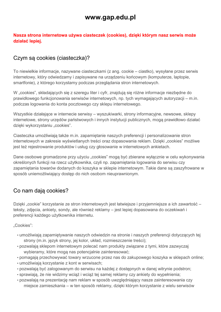www.gap.edu.pl Nasza strona internetowa używa ciasteczek (cookies), dzięki którym nasz serwis może działać lepiej. Czym są cookies (ciasteczka)? To niewielkie informacje, nazywane ciasteczkami (z ang. cookie – ciastko), wysyłane przez serwis internetowy, który odwiedzamy i zapisywane na urządzeniu końcowym (komputerze, laptopie, smartfonie), z którego korzystamy podczas przeglądania stron internetowych. W „cookies”, składających się z szeregu liter i cyfr, znajdują się różne informacje niezbędne do prawidłowego funkcjonowania serwisów internetowych, np. tych wymagających autoryzacji – m.in. podczas logowania do konta pocztowego czy sklepu internetowego. Wszystkie działające w internecie serwisy – wyszukiwarki, strony informacyjne, newsowe, sklepy internetowe, strony urzędów państwowych i innych instytucji publicznych, mogą prawidłowo działać dzięki wykorzystaniu „cookies”. Ciasteczka umożliwiają także m.in. zapamiętanie naszych preferencji i personalizowanie stron internetowych w zakresie wyświetlanych treści oraz dopasowania reklam. Dzięki „cookies” możliwe jest też rejestrowanie produktów i usług czy głosowanie w internetowych ankietach. Dane osobowe gromadzone przy użyciu „cookies” mogą być zbierane wyłącznie w celu wykonywania określonych funkcji na rzecz użytkownika, czyli np. zapamiętania logowania do serwisu czy zapamiętania towarów dodanych do koszyka w sklepie internetowym. Takie dane są zaszyfrowane w sposób uniemożliwiający dostęp do nich osobom nieuprawnionym. Co nam dają cookies? Dzięki „cookie” korzystanie ze stron internetowych jest łatwiejsze i przyjemniejsze a ich zawartość – teksty, zdjęcia, ankiety, sondy, ale również reklamy – jest lepiej dopasowana do oczekiwań i preferencji każdego użytkownika internetu. „Cookies”: • umożliwiają zapamiętywanie naszych odwiedzin na stronie i naszych preferencji dotyczących tej strony (m.in. język strony, jej kolor, układ, rozmieszczenie treści); • pozwalają sklepom internetowym polecać nam produkty związane z tymi, które zazwyczaj wybieramy, które mogą nas potencjalnie zainteresować; • pomagają przechowywać towary wrzucone przez nas do zakupowego koszyka w sklepach online; • umożliwiają korzystanie z kont w serwisach; • pozwalają być zalogowanym do serwisu na każdej z dostępnych w danej witrynie podstron; • sprawiają, że nie widzimy wciąż i wciąż tej samej reklamy czy ankiety do wypełnienia; • pozwalają na prezentację nam reklam w sposób uwzględniający nasze zainteresowania czy miejsce zamieszkania – w ten sposób reklamy, dzięki którym korzystanie z wielu serwisów internetowych może być bezpłatne, mogą informować nas o potencjalnie interesujących nas produktach i usługach; • pozwalają tworzyć anonimowe statystyki odwiedzalności serwisów. Dzięki „cookies” właściciele i wydawcy serwisów internetowych są w stanie ocenić realne zainteresowanie swoimi serwisami, mogą lepiej poznać oczekiwania i preferencje użytkowników, zrozumieć sposób w jaki użytkownicy korzystają z ich serwisów oraz, korzystając z najnowszych rozwiązań technologicznych, mogą stale udoskonalać swoje serwisy internetowe czyniąc je jeszcze przyjaźniejszymi i lepiej dostosowanymi do naszych potrzeb. Co powinniśmy wiedzieć o „cookies”? Nie służą identyfikacji użytkowników i na ich podstawie w żaden sposób nie jest ustalana czyjakolwiek tożsamość; • „cookies” identyfikują dane komputera i przeglądarki używanych do przeglądania stron internetowych – pozwalają np. dowiedzieć się czy dany komputer już odwiedzał stronę; • dane pozyskane z „cookies” nie są w żaden sposób łączone z danymi osobowymi użytkowników pozyskanymi np. podczas rejestracji w serwisach; • nie są szkodliwe ani dla nas ani dla naszych komputerów, czy smartfonów – nie wpływają na sposób ich działania; • nie powodują zmian konfiguracyjnych w urządzeniach końcowych, ani w oprogramowaniu zainstalowanym na tych urządzeniach; • domyślne parametry „ciasteczek” pozwalają na odczytanie informacji w nich zawartych jedynie serwerowi, który je utworzył; • na podstawie naszych zachowań na odwiedzanych stronach internetowych przekazują do serwerów informacje, dzięki którym wyświetlana strona jest lepiej dopasowana do indywidualnych preferencji. Podstawowe rodzaje ciasteczek „Cookies” sesyjne – są to tymczasowe informacje przechowywane w pamięci przeglądarki do momentu zakończenia sesji przeglądarki, czyli do momentu jej zamknięcia. Te cookies są obowiązkowe, aby niektóre aplikacje lub funkcjonalności działały poprawnie. „Cookies” stałe – dzięki nim korzystanie z często odwiedzanych stron jest łatwiejsze (np. zapewniają optymalną nawigację, zapamiętują wybraną rozdzielczość, układ treści etc.). Te informacje pozostają pamięci przeglądarki przez dłuższy okres. Czas ten zależy od wyboru, którego można dokonać w ustawieniach przeglądarki. Ten rodzaj cookies zezwala na przekazywanie informacji na serwer za każdym razem, gdy odwiedzana jest dana strona. Stałe cookies są również nazywane jako tzw. śledzące „cookie” (ang. tracking cookies). „Cookies” podmiotów zewnętrznych – (ang. third parties cookies) – to informacje pochodzące np. z serwerów reklamowych, serwerów firm i dostawców usług (np. wyszukiwania albo map umieszczanych na stronie) współpracujących z właścicielem danej strony internetowej. Ten rodzaj cookie pozwala dostosowywać reklamy – dzięki którym korzystanie ze stron internetowych może być bezpłatne – do preferencji i zwyczajów ich użytkowników. Pozwalają również ocenić skuteczność działań reklamowych (np. dzięki zliczaniu, ile osób kliknęło w daną reklamę i przeszło na stronę internetową reklamodawcy). Na podstawie informacji pozyskan