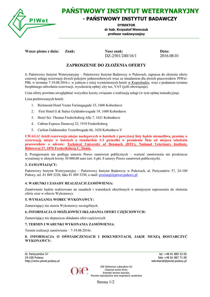PAŃSTWOWY INSTYTUT WETERYNARYJNY - PAŃSTWOWY INSTYTUT BADAWCZY DYREKTOR dr hab. Krzysztof Niemczuk profesor nadzwyczajny Wasze pismo z dnia: Znak: Nasz znak: Data: DZ-2501/240/16/1 2016.08.01 ZAPROSZENIE DO ZŁOŻENIA OFERTY 1. Państwowy Instytut Weterynaryjny – Państwowy Instytut Badawczy w Puławach, zaprasza do złożenia oferty cenowej usługę rezerwacji dwóch pokojów jednoosobowych wraz ze śniadaniem dla dwóch pracowników PIWetPIB, w terminie 7-19.08.2016 r. w jednym z niżej wymienionych hoteli w Kopenhadze, wraz z podaniem terminu bezpłatnego odwołania rezerwacji, wysokością opłaty city tax, VAT (jeśli obowiązuje). Cena oferty powinna uwzględniać wszystkie koszty związane z realizacją usługi (w tym opłatę transakcyjną). Lista preferowanych hoteli: 1. Richmond Hotel Vester Farimagsgade 33, 1606 Kobenhavn 2. First Hotel G & Suites Gyldenlovesgade 19, 1600 Kobenhavn 3. Hotel Sct. Thomas Frederiksberg Alle 7, 1621 Kobenhavn 4. Cabinn Express Danasvej 32, 1910 Frederiksberg 5. Carlton Guldsmeden Vesterbrogade 66, 1620 Kobenhavn V UWAGA! Jeżeli rezerwacja miejsc noclegowych w hotelach z powyższej listy będzie niemożliwa, prosimy o rezerwację miejsc w hotelach o standardzie 2-3 gwiazdki w promieniu 5km od miejsca szkolenia pracowników o adresie: Technical University of Denmark (DTU), National Veterinary Institute, Bülowsvej 27, 1870 Frederiksberg C, Dania. 2. Postępowanie nie podlega ustawie Prawo zamówień publicznych – wartość zamówienia nie przekracza wyrażonej w złotych kwoty 30 000,00 euro (art. 4 pkt. 8 ustawy Prawo zamówień publicznych). 3. ZAMAWIAJĄCY: Państwowy Instytut Weterynaryjny – Państwowy Instytut Badawczy w Puławach, al. Partyzantów 57, 24-100 Puławy, tel. 81 889 3228, faks 81 889 3350, e-mail: [email protected] 4. WARUNKI I ZASADY REALIZACJI ZAMÓWIENIA: Zamówienie będzie realizowane na zasadach i warunkach określonych w niniejszym zaproszeniu do złożenia oferty oraz w ofercie Wykonawcy. 5. WYMAGANIA WOBEC WYKONAWCY: Zamawiający nie stawia Wykonawcy szczególnych. 6. INFORMACJA O MOŻLIOWŚCI SKŁADANIA OFERT CZĘŚCIOWYCH: Zamawiający nie dopuszcza składania ofert częściowych 7. TERMIN I WARUNKI WYKONANIA ZAMÓWIENIA: Termin realizacji zamówienia – 7-19.08.2016r. 8. INFORMACJA O OŚWIADCZENIACH I DOKUMENTACH, JAKIE MUSZĄ DOSTARCZYĆ WYKONAWCY: Al. Partyzantów 57 24-100 Puławy http://www.piwet.pulawy.pl tel. +48 81 889 32 65 faks +48 81 887 71 00 [email protected] OIE Reference Laboratory for Classical swine fever, Enzootic bovine leucosis, Porcine reproductive and respiratory syndrome Strona 1/2 Wykonawcy muszą dostarczyć ofertę cenową, wysłaną za pośrednictwem poczty elektronicznej lub faksem. Zamawiający po wyborze najkorzystniejszej oferty, skontaktuje się z wybranym Wykonawcą w celu zawarcia umowy. 9. OPIS KRYTERIÓW, KTÓRYMI ZAMAWIAJĄCY BĘDZIE SIĘ KIEROWAŁ PRZY WYBORZE OFERTY WRAZ Z PODANIEM ZNACZENIA TYCH KRYTERIÓW ORAZ SPOSOBU OCENY OFERT: 1) Oceny ofert dokonają upoważnione do tego osoby. 2) Kryteria wyboru: Cena – 100% wagi oceny 10. INFORMACJA O SPOSOBIE POROZUMIEWANIA SIĘ ZAMAWIAJĄCEGO Z WYKONAWCAMI ORAZ PRZEKAZYWANIA OŚWIADCZEŃ I DOKUMENTÓW: Wykonawca może przekazywać Zamawiającemu informacje, oświadczenia, pytania oraz dokumenty: w postaci elektronicznej na adres wskazany w zaproszeniu do negocjacji, faksem (81 889 3350, 81 886 2595), pocztą, przesyłką kurierską, osobiście w Kancelarii Ogólnej, mieszczącej się w siedzibie głównej Zamawiającego. Zamawiający będzie kontaktował się z Wykonawcą w postaci elektronicznej lub faksem. Jeżeli zaś wskazane sposoby komunikacji będą niemożliwe, Zamawiający będzie przesyłał informacje, zawiadomienia i oświadczenia pod adres, wskazany w ofercie. 11. WSKAZANIE OSÓB UPRAWNIONYCH DO POROZUMIEWANIA SIĘ Z WYKONAWCAMI: Karolina Koc – [email protected], [email protected] tel. 81 889 3228, faks 81 886 2595, 81 889 3350. 12. MIEJSCE, SPOSÓB I TERMIN SKŁADANIA OFERT: Ofertę należy przesłać faksem na nr faksu wskazany w zaproszeniu do złożenia oferty lub za pośrednictwem poczty elektronicznej na adres wskazany powyżej. Ofertę należy złożyć do dnia 03.08.2016r. do godziny 10:00. Strona 2/2