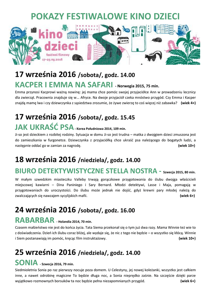 POKAZY FESTIWALOWE KINO DZIECI 17 września 2016 /sobota/, godz. 14.00 KACPER I EMMA NA SAFARI - Norwegia 2015, 75 min. Emma przynosi Kacprowi ważną nowinę: jej mama chce pomóc swojej przyjaciółce Ann w prowadzeniu lecznicy dla zwierząt. Pracownia znajduje się w... Afryce. Na dwoje przyjaciół czeka mnóstwo przygód. Czy Emma i Kacper znajdą mamę lwa i czy dziewczynka z sąsiedztwa zrozumie, że żywe zwierzę to coś więcej niż zabawka? (wiek 4+) 17 września 2016 /sobota/, godz. 15.45 JAK UKRAŚĆ PSA - Korea Południowa 2014, 109 min. Ji-so jest dzieckiem z rozbitej rodziny. Sytuacja w domu Ji-so jest trudna – matka z dwojgiem dzieci zmuszona jest do zamieszkania w furgonetce. Dziewczynka z przyjaciółką chce ukraść psa należącego do bogatych ludzi, a następnie oddać go w zamian za nagrodę. (wiek 10+) 18 września 2016 /niedziela/, godz. 14.00 BIURO DETEKTYWISTYCZNE STELLA NOSTRA - Szwecja 2015, 80 min. W małym szwedzkim miasteczku Valleby trwają gorączkowe przygotowania do ślubu dwojga właścicieli miejscowej kawiarni – Dina Paniniego i Sary Bernard. Młodzi detektywi, Lasse i Maja, pomagają w przygotowaniach do uroczystości. Do ślubu może jednak nie dojść, gdyż krewni pary młodej należą do zwalczających się nawzajem sycylijskich mafii. (wiek 6+) 24 września 2016 /sobota/, godz. 16.00 RABARBAR - Holandia 2014, 70 min. Czasem małżeństwo nie jest do końca życia. Tata Siema przekonał się o tym już dwa razy. Mama Winnie też wie to z doświadczenia. Dzień ich ślubu coraz bliżej, ale wydaje się, że nic z tego nie będzie – o wszystko się kłócą. Winnie i Siem postanawiają im pomóc, kręcąc film instruktażowy. (wiek 10+) 25 września 2016 /niedziela/, godz. 14.00 SONIA - Szwecja 2016, 79 min. Siedmioletnia Sonia po raz pierwszy nocuje poza domem. U Celestyny, jej nowej koleżanki, wszystko jest całkiem inne, a nawet odrobinę magiczne To będzie długa noc, a Sonia nieprędko zaśnie. Na szczęście dzięki parze wyjątkowo rozmownych borsuków ta noc będzie pełna niezapomnianych przygód. (wiek 6+)