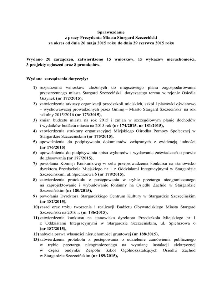 Sprawozdanie z pracy Prezydenta Miasta Stargard Szczeciński za okres od dnia 26 maja 2015 roku do dnia 29 czerwca 2015 roku Wydano 20 zarządzeń, zatwierdzono 15 wniosków, 15 wykazów nieruchomości, 3 projekty ogłoszeń oraz 8 protokołów. Wydane zarządzenia dotyczyły: 1) rozpatrzenia wniosków złożonych do miejscowego planu zagospodarowania przestrzennego miasta Stargard Szczeciński dotyczącego terenu w rejonie Osiedla Giżynek (nr 172/2015), 2) zatwierdzenia arkuszy organizacji przedszkoli miejskich, szkół i placówki oświatowo – wychowawczej prowadzonych przez Gminę – Miasto Stargard Szczeciński na rok szkolny 2015/2016 (nr 173/2015), 3) zmian budżetu miasta na rok 2015 i zmian w szczegółowym planie dochodów i wydatków budżetu miasta na 2015 rok (nr 174/2015, nr 181/2015), 4) zatwierdzenia struktury organizacyjnej Miejskiego Ośrodka Pomocy Społecznej w Stargardzie Szczecińskim (nr 175/2015), 5) upoważnienia do podpisywania dokumentów związanych z ewidencją ludności (nr 176/2015) 6) upoważnienia do podpisywania spisu wyborców i wydawania zaświadczeń o prawie do głosowania (nr 177/2015), 7) powołania Komisji Konkursowej w celu przeprowadzenia konkursu na stanowisko dyrektora Przedszkola Miejskiego nr 1 z Oddziałami Integracyjnymi w Stargardzie Szczecińskim, ul. Spichrzowa 6 (nr 178/2015), 8) zatwierdzenia protokołu z postępowania w trybie przetargu nieograniczonego na zaprojektowanie i wybudowanie fontanny na Osiedlu Zachód w Stargardzie Szczecińskim (nr 180/2015), 9) powołania Dyrektora Stargardzkiego Centrum Kultury w Stargardzie Szczecińskim (nr 182/2015), 10) zasad oraz trybu tworzenia i realizacji Budżetu Obywatelskiego Miasta Stargard Szczeciński na 2016 r. (nr 186/2015), 11) zatwierdzenia konkursu na stanowisko dyrektora Przedszkola Miejskiego nr 1 z Oddziałami Integracyjnymi w Stargardzie Szczecińskim, ul. Spichrzowa 6 (nr 187/2015), 12) nabycia prawa własności nieruchomości gruntowej (nr 188/2015), 13) zatwierdzenia protokołu z postepowania o udzielenie zamówienia publicznego w trybie przetargu nieograniczonego na wymianę instalacji elektrycznej w części budynku Zespołu Szkół Ogólnokształcących Osiedlu Zachód w Stargardzie Szczecińskim (nr 189/2015), 14) zatwierdzenia protokołu z postępowania o udzielenie zamówienia publicznego w trybie przetargu nieograniczonego na budowę oświetlenia fragmentu ulicy Niepodległości, Witkiewicza i Norwida w Stargardzie Szczecińskim (nr 190/2015), 15) zatwierdzenia protokołu z postępowania o udzielenie zamówienia publicznego w trybie przetargu nieograniczonego na budowę boiska wielofunkcyjnego na terenie Gimnazjum Nr 1 w Stargardzie Szczecińskim (nr 191/2015), 16) określenia sposobu wykonania uchwał Rady Miejskiej z dnia 26 maja 2015 roku (nr 179/2015, nr 183/2015, nr 184/2015, nr 185/2015). Zatwierdzone wnioski dotyczyły: 1) zatwierdzenia sposobu postępowania przy udzieleniu zamówienia publicznego na wykonanie zieleńca zlokalizowanego wzdłuż alejek w Parku Zamkowym w Stargardzie Szczecińskim, 2) zatwierdzenia wysokości stawek czynszu w 2015 r. na dotychczasowym poziomie, w lokalach wchodzących w skład mieszkaniowego zasobu Miasta w 2015 r., 3) zatwierdzenia zmiany miejscowego planu zagospodarowania przestrzennego w obrębie w ewidencyjnym Strachocin, gmina Stargard Szczeciński, 4) zatwierdzenia sposobu postepowania przy udzieleniu zamówienia publicznego na wykonanie robót związanych z wymianą trzech agregatów chłodniczych w komorach do przechowywania zwłok w domu pogrzebowym na terenie nowego Cmentarza Komunalnego przy ul. Spokojnej w Stargardzie Szczecińskim, 5) zatwierdzenia trybu udzielenia zamówienia i wyrażenia zgody na zlecenie firmie: „DROGBUD” Sp. z o.o. z siedzibą przy ul. Lotników 51 w Stargardzie Szczecińskim opracowania dokumentacji projektowo – kosztorysowej dla potrzeb realizacji zadania: „Budowa ul. Fabrycznej w Stargardzie Szczecińskim”, 6) zatwierdzenia treści ogłoszenia oraz specyfikacji istotnych warunków zamówienia przetargu nieograniczonego na budowę oświetlenia fragmentu ulicy Niepodległości, Witkiewicza i Norwida w Stargardzie Szczecińskim, 7) zatwierdzenia treści ogłoszenia oraz specyfikacji istotnych warunków zamówienia przetargu nieograniczonego na budowę boiska wielofunkcyjnego na terenie Gimnazjum Nr 1 w Stargardzie Szczecińskim, 8) zatwierdzenia treści ogłoszenia oraz specyfikacji istotnych warunków zamówienia przetargu nieograniczonego na wyminę instalacji elektrycznych w części budynku Zespołu Szkół Ogólnokształcących na Osiedlu Zachód w Stargardzie Szczecińskim, 9) zatwierdzenia treści ogłoszenia oraz specyfikacji istotnych warunków zamówienia przetargu nieograniczonego na budowę placu zabaw wraz z siłownią zewnętrzną na Osiedlu Pyrzyckim w Stargardzie Szczecińskim, 10) zatwierdzenia treści ogłoszenia oraz specyfikacji istotnych warunków zamówienia przetargu nieograniczonego na budowę zespołu rekreacyjno – sportowego przy ulicy Struga w Stargardzie Szczecińskim w ramach projektu – Struga przyjazne pokoleniom – etap I, 11) wyrażenia zgody na przeprowadzenie procedury wyłożenia do publicznego wglądu projektu „Miejscowego planu zagospodarowania przestrzennego miasta Stargard Szczeciński dla trasy przebiegu napowietrznej linii elektroenergetycznej wysokiego napięcia 110 kV relacji Morzyczyn – Drawski Młyn” oraz zmiany: „Miejscowego planu zagospodarowania przestrzennego miasta Stargardu Szczecińskiego dotyczące terenu w rejonie ulic: Jana Matejki, Wojciecha Kossaka, Podmiejskiej, Podleśnej” i zmiany miejscowego planu zagospodarowania przestrzennego miasta Stargardu Szczecińskiego dotyczącego terenu w rejonie „Parku Przemysłowego”, 12) wyrażenia zgody na przeprowadzenie procedury uzgadniania i opiniowania projektu miejscowego planu zagospodarowania przestrzennego miasta Stargard Szczeciński dotyczącego terenu położonego