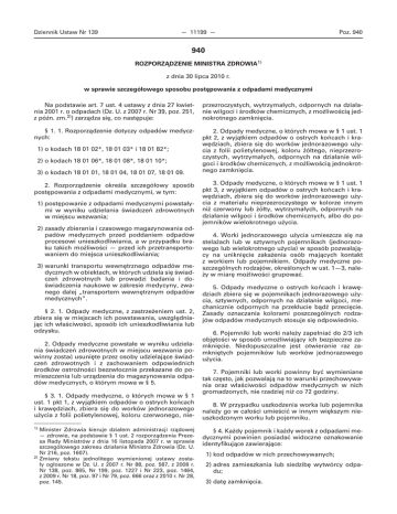Dziennik Ustaw Nr 139 — 11199 — Poz. 940 940 ROZPORZĄDZENIE MINISTRA ZDROWIA1) z dnia 30 lipca 2010 r. w sprawie szczegółowego sposobu postępowania z odpadami medycznymi Na podstawie art. 7 ust. 4 ustawy z dnia 27 kwietnia 2001 r. o odpadach (Dz. U. z 2007 r. Nr 39, poz. 251, z późn. zm.2)) zarządza się, co następuje: przezroczystych, wytrzymałych, odpornych na działanie wilgoci i środków chemicznych, z możliwością jednokrotnego zamknięcia. § 1. 1. Rozporządzenie dotyczy odpadów medycznych: 2. Odpady medyczne, o których mowa w § 1 ust. 1 pkt 2, z wyjątkiem odpadów o ostrych końcach i krawędziach, zbiera się do worków jednorazowego użycia z folii polietylenowej, koloru żółtego, nieprzezroczystych, wytrzymałych, odpornych na działanie wilgoci i środków chemicznych, z możliwością jednokrotnego zamknięcia. 1) o kodach 18 01 02*, 18 01 03* i 18 01 82*; 2) o kodach 18 01 06*, 18 01 08*, 18 01 10*; 3) o kodach 18 01 01, 18 01 04, 18 01 07, 18 01 09. 2. Rozporządzenie określa szczegółowy sposób postępowania z odpadami medycznymi, w tym: 1) postępowanie z odpadami medycznymi powstałymi w wyniku udzielania świadczeń zdrowotnych w miejscu wezwania; 2) zasady zbierania i czasowego magazynowania odpadów medycznych przed poddaniem odpadów procesowi unieszkodliwiania, a w przypadku braku takich możliwości — przed ich przetransportowaniem do miejsca unieszkodliwiania; 3) warunki transportu wewnętrznego odpadów medycznych w obiektach, w których udziela się świadczeń zdrowotnych lub prowadzi badania i doświadczenia naukowe w zakresie medycyny, zwanego dalej „transportem wewnętrznym odpadów medycznych”. § 2. 1. Odpady medyczne, z zastrzeżeniem ust. 2, zbiera się w miejscach ich powstawania, uwzględniając ich właściwości, sposób ich unieszkodliwiania lub odzysku. 2. Odpady medyczne powstałe w wyniku udzielania świadczeń zdrowotnych w miejscu wezwania powinny zostać usunięte przez osoby udzielające świadczeń zdrowotnych i z zachowaniem odpowiednich środków ostrożności bezzwłocznie przekazane do pomieszczenia lub urządzenia do magazynowania odpadów medycznych, o którym mowa w § 5. § 3. 1. Odpady medyczne, o których mowa w § 1 ust. 1 pkt 1, z wyjątkiem odpadów o ostrych końcach i krawędziach, zbiera się do worków jednorazowego użycia z folii polietylenowej, koloru czerwonego, nie1) Minister Zdrowia kieruje działem administracji rządowej — zdrowie, na podstawie § 1 ust. 2 rozporządzenia Prezesa Rady Ministrów z dnia 16 listopada 2007 r. w sprawie szczegółowego zakresu działania Ministra Zdrowia (Dz. U. Nr 216, poz. 1607). 2) Zmiany tekstu jednolitego wymienionej ustawy zostały ogłoszone w Dz. U. z 2007 r. Nr 88, poz. 587, z 2008 r. Nr 138, poz. 865, Nr 199, poz. 1227 i Nr 223, poz. 1464, z 2009 r. Nr 18, poz. 97 i Nr 79, poz. 666 oraz z 2010 r. Nr 28, poz. 145. 3. Odpady medyczne, o których mowa w § 1 ust. 1 pkt 3, z wyjątkiem odpadów o ostrych końcach i krawędziach, zbiera się do worków jednorazowego użycia z materiału nieprzezroczystego w kolorze innym niż czerwony lub żółty, wytrzymałych, odpornych na działanie wilgoci i środków chemicznych, albo do pojemników wielokrotnego użycia. 4. Worki jednorazowego użycia umieszcza się na stelażach lub w sztywnych pojemnikach (jednorazowego lub wielokrotnego użycia) w sposób pozwalający na uniknięcie zakażenia osób mających kontakt z workiem lub pojemnikiem. Odpady medyczne poszczególnych rodzajów, określonych w ust. 1—3, należy w miarę możliwości grupować. 5. Odpady medyczne o ostrych końcach i krawędziach zbiera się w pojemnikach jednorazowego użycia, sztywnych, odpornych na działanie wilgoci, mechanicznie odpornych na przekłucie bądź przecięcie. Zasady oznaczania kolorami poszczególnych rodzajów odpadów medycznych stosuje się odpowiednio. 6. Pojemniki lub worki należy zapełniać do 2/3 ich objętości w sposób umożliwiający ich bezpieczne zamknięcie. Niedopuszczalne jest otwieranie raz zamkniętych pojemników lub worków jednorazowego użycia. 7. Pojemniki lub worki powinny być wymieniane tak często, jak pozwalają na to warunki przechowywania oraz właściwości odpadów medycznych w nich gromadzonych, nie rzadziej niż co 72 godziny. 8. W przypadku uszkodzenia worka lub pojemnika należy go w całości umieścić w innym większym nieuszkodzonym worku lub pojemniku. § 4. Każdy pojemnik i każdy worek z odpadami medycznymi powinien posiadać widoczne oznakowanie identyfikujące zawierające: 1) kod odpadów w nich przechowywanych; 2) adres zamieszkania lub siedzibę wytwórcy odpadu; 3) datę zamknięcia. Dziennik Ustaw Nr 139 — 11200 — § 5. 1. Dopuszczalne jest magazynowanie odpadów medycznych, o których mowa w § 1 ust. 1 pkt 1 i 2, w odpowiednio przystosowanych do tego celu pomieszczeniach albo stacjonarnych lub przenośnych urządzeniach chłodniczych, przeznaczonych wyłącznie do magazynowania odpadów medycznych. Przenośne urządzenie chłodnicze jest przeznaczone do magazynowania niewielkiej ilości odpadów. 2. Pomieszczenie do magazynowania odpadów medycznych powinno: 1) posiadać niezależne wejście; 2) być zabezpieczone przed dostępem osób nieupoważnionych; 3) posiadać ściany i podłogi wykonane z materiałów gładkich, łatwo zmywalnych i umożliwiających dezynfekcję; 4) być zabezpieczone przed dostępem owadów, gryzoni oraz innych zwierząt; 5) posiadać drzwi wejściowe bez progu, których szerokość i wysokość powinna gwarantować swobodny dostęp; 6) posiadać wydzielone boksy i miejsca w zależności od rodzajów magazynowanych odpadów medycznych, zgodne z zasadami ich sortowania w miejscach powstawania; 7) posiadać wentylację zapewniającą podciśnienie, z zapewnieniem filtracji odprowadzanego powietrza. Dopuszcza się zastosowanie wentylacji grawitacyjnej pod warunkiem magazynowania odpadów w szczelnie zamkniętych pojemnikach lub kont