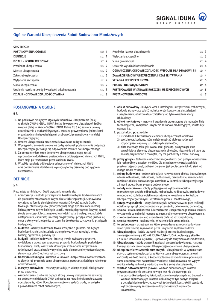 Ogólne Warunki Ubezpieczenia Robót Budowlano-Montażowych SPIS TREŚCI: POSTANOWIENIA OGÓLNE str. 1 Przedmiot i zakres ubezpieczenia str. 3 DEFINICJE str. 1 Wyłączenia szczególne str. 3 DZIAŁ I - SZKODY RZECZOWE str. 2 Suma gwarancyjna str. 4 Przedmiot ubezpieczenia str. 2 Ustalenie wysokości odszkodowania str. 4 Miejsce ubezpieczenia str. 2 OGRANICZENIA ODPOWIEDZIALNOŚCI WSPÓLNE DLA DZIAŁÓW I i II str. 4 Zakres ubezpieczenia str. 2 ZAWARCIE UMOWY UBEZPIECZENIA I CZAS JEJ TRWANIA str. 4 Wyłączenia szczególne str. 2 SKŁADKA UBEZPIECZENIOWA str. 5 Suma ubezpieczenia str. 2 PRAWA I OBOWIĄZKI STRON str. 5 Ustalenie rozmiaru szkody i wysokości odszkodowania str. 3 POSTĘPOWANIE W SPRAWIE ROSZCZEŃ UBEZPIECZENIOWYCH str. 6 DZIAŁ II - ODPOWIEDZIALNOŚĆ CYWILNA str. 3 POSTANOWIENIA KOŃCOWE str. 7 POSTANOWIENIA OGÓLNE § 1. 1.Na podstawie niniejszych Ogólnych Warunków Ubezpieczenia (dalej w skrócie OWU) SIGNAL IDUNA Polska Towarzystwo Ubezpieczeń Spółka Akcyjna (dalej w skrócie SIGNAL IDUNA Polska TU S.A.) zawiera umowy ubezpieczenia z osobami fizycznymi, osobami prawnymi oraz jednostkami organizacyjnymi nieposiadającymi osobowości prawnej (zwanymi dalej Ubezpieczającymi). 2. Umowa ubezpieczenia może zostać zawarta na cudzy rachunek. 3.W przypadku zawarcia umowy na cudzy rachunek postanowienia dotyczące Ubezpieczającego stosuje się odpowiednio również do Ubezpieczonego. 4.Za porozumieniem stron do umowy ubezpieczenia mogą zostać wprowadzone dodatkowe postanowienia odbiegające od niniejszych OWU, które mają pierwszeństwo przed zapisami OWU. 5.Wszelkie regulacje odbiegające od postanowień niniejszych OWU oraz porozumienia dodatkowe wymagają formy pisemnej pod rygorem nieważności. DEFINICJE SIM 0024/??.11 § 2. Przez użyte w niniejszych OWU wyrażenia rozumie się: 1. amortyzacja - metoda przypisywania kosztów nabycia środków trwałych do produktów stosowana w całym okresie ich eksploatacji. Stanowi ona wyrażoną w formie pieniężnej równowartość (kwotę) zużycia środka trwałego. Stawki odpisów (amortyzacyjne) mogą być określane metodą liniową (równe raty w kolejnych latach), metodą degresywną (przy tej samej stopie amortyzacji, lecz zawsze od wartości środka trwałego netto, każda następna rata jest niższa) i metodą progresywną - przyspieszoną (skraca się okres dokonywania odpisów w stosunku do okresów użytkowania przyjętych tradycyjnie), 2. budowle - obiekty budowlane trwale związane z gruntem, nie będące budynkami, takie jak: instalacje przemysłowe, wiaty, rurociągi, wieże, kominy, ogrodzenia, parkany itp., 3. budynki - obiekty budowlane, które są trwale związane z gruntem, wydzielone z przestrzeni za pomocą przegród budowlanych, posiadające fundamenty i dach, wraz z wbudowanymi instalacjami, urządzeniami technicznymi oraz zainstalowanymi na stałe elementami wykończeniowymi, stanowiące całość techniczną i użytkową, 4.franszyza redukcyjna - ustalona w umowie ubezpieczenia kwota wyrażona w złotych lub procencie sumy ubezpieczenia, potrącana z każdego należnego odszkodowania, 5.maszyny budowlane - maszyny posiadające własny napęd i obsługiwane przez operatora, 6.osoba trzecia - osoba nie będąca stroną umowy ubezpieczenia zawartej na podstawie niniejszych OWU, ani osoba na rzecz której zostało zawarte ubezpieczenie, której Ubezpieczony może wyrządzić szkodę, w związku z prowadzeniem robót budowlanych, 7.obiekt budowlany - budynek wraz z instalacjami i urządzeniami technicznymi, budowla stanowiąca całość techniczno-użytkową wraz z instalacjami i urządzeniami, obiekt małej architektury lub tylko określone etapy ich budowy, 8.obiekt montażowy - maszyny i urządzenia przeznaczone do montażu, linie technologiczne, kompletne urządzenia zakładów produkcyjnych, konstrukcje stalowe itp., 9.pozostałości po szkodzie: 1)uszkodzone lub zniszczone elementy ubezpieczanych obiektów, 2)części nieuszkodzone, które należy rozebrać i/lub usunąć przed rozpoczęciem naprawy uszkodzonych elementów, 3)obce materiały, takie jak: woda, muł, glina itp. pokrywające i/lub wypełniające elementy ubezpieczanych obiektów, niezależnie od tego czy zostały przyniesione z zewnątrz, czy też pochodziły z terenu budowy, 10.próby gorące - testowanie ubezpieczanego obiektu pod pełnym obciążeniem lub ruch próbny z użyciem mediów. Dla urządzeń wytwarzających lub przetwarzających prąd, próbami gorącymi jest podłączenie ich do sieci lub innego źródła zasilania, 11.roboty budowlane - roboty polegające na wykonaniu obiektu budowlanego, a także odbudowie, rozbudowie, nadbudowie, przebudowie, remoncie lub rozbiórce obiektu budowlanego, określone w kontrakcie Ubezpieczającego z innymi uczestnikami procesu budowlanego, 12.roboty montażowe - roboty polegające na wykonaniu obiektu montażowego, a także odbudowie, rozbudowie, nadbudowie, przebudowie, remoncie lub rozbiórce obiektu montażowego, określone w kontrakcie Ubezpieczającego z innymi uczestnikami procesu montażowego, 13.sprzęt, wyposażenie - wszystkie narzędzia wykorzystywane przy realizacji obiektu np: sprzęt przeciwpożarowy, przenośniki, betonownie, generatory, 14.szkoda - utrata, uszkodzenie lub zniszczenie ubezpieczonego mienia wskutek wystąpienia co najmniej jednego zdarzenia objętego umową ubezpieczenia, 15.szkoda osobowa - śmierć, uszkodzenie ciała lub rozstrój zdrowia, 16.szkoda rzeczowa - uszkodzenie, zniszczenie lub utrata mienia, 17.teren budowy - przestrzeń, na której prowadzone są roboty budowlane wraz z przestrzenią zajmowaną przez urządzenia zaplecza budowy, 18.Ubezpieczający - każdy uczestnik realizacji procesu budowlanego, zawierający umowę z SIGNAL IDUNA Polska TU S.A., opłacający składkę, i o ile nie umówiono się inaczej, uprawniony do otrzymania odszkodowania, 19.Ubezpieczony - każdy uczestnik realizacji procesu budowlanego, na rzecz którego została 