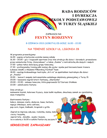 RADA RODZICÓW I DYREKCJA SZKOŁY PODSTAWOWEJ W TURZY ŚLĄSKIEJ ZAPRASZA NA FESTYN RODZINNY 8 CZERWCA 2013 (SOBOTA) OD GODZ. 16.00 – 22.00 NA TERENIE SZKOŁY UL. LIGONIA 2B W programie przewidujemy: 16.00 – popisy artystyczne uczniów naszej szkoły 16.30 – 20.00 – gry i rozgrywki sportowe oraz inne atrakcje dla dzieci i dorosłych, prowadzone przez animatorów firmy „Dzieciakowo”, a także „Zumba” z instruktorką dla dużych i małych 17.00 – pokaz tańca dziecięcej grupy tanecznej 17.30 – profesjonalny trening piłki nożnej dla ojców i synów pod kierownictwem trenera Łukasza Smołki z Akademii Piłkarskiej Football Team 18.00 – występ krakowskiego teatrzyku „Art-re” ze spektaklem teatralnym dla dzieci pt. „Pinokio” 19.00 - koncert zespołu instrumentalno-wokalnego młodzieży gimnazjalnej z Turzy Śl. 20.00 – losowanie nagród loterii fantowej „Skarbonka” 20.00 – 22.00 – zabawa taneczna, którą poprowadzi DJ Dariusz Stokłosa 22.00 – zakończenie festynu Inne atrakcje : malowanie buziek, kolorowe fryzury, duże bańki mydlane, dmuchany zamek ze zjeżdżalnią, duża trampolina Gastronomia festynu : kołacz, domowe ciasta, słodycze, kawa, herbata, napoje chłodzące, wata cukrowa, pop-corn, bigos, kiełbaski, krupnioki z grilla Zaproś na imprezę całą swą rodzinkę, mamę, babcię, ciocię i kuzynkę, zaproś tatę , dziadka , wujka i kuzyna, bo w sobotę o 16.00 w szkole Festyn się zaczyna !!! SERDECZNIE ZAPRASZAMY