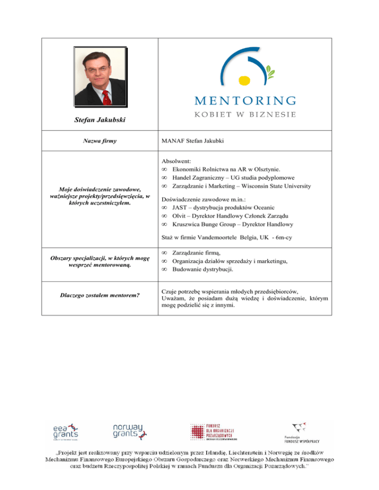 Stefan Jakubski Nazwa firmy MANAF Stefan Jakubki Absolwent: Moje doświadczenie zawodowe, waŜniejsze projekty/przedsięwzięcia, w których uczestniczyłem. • Ekonomiki Rolnictwa na AR w Olsztynie. • Handel Zagraniczny – UG studia podyplomowe • Zarządzanie i Marketing – Wisconsin State University Doświadczenie zawodowe m.in.: • JAST – dystrybucja produktów Oceanic • Olvit – Dyrektor Handlowy Członek Zarządu • Kruszwica Bunge Group – Dyrektor Handlowy StaŜ w firmie Vandemoortele Belgia, UK - 6m-cy Obszary specjalizacji, w których mogę wesprzeć mentorowaną. Dlaczego zostałem mentorem? • Zarządzanie firmą, • Organizacja działów sprzedaŜy i marketingu, • Budowanie dystrybucji. Czuje potrzebę wspierania młodych przedsiębiorców, UwaŜam, Ŝe posiadam duŜą wiedzę i doświadczenie, którym mogę podzielić się z innymi.