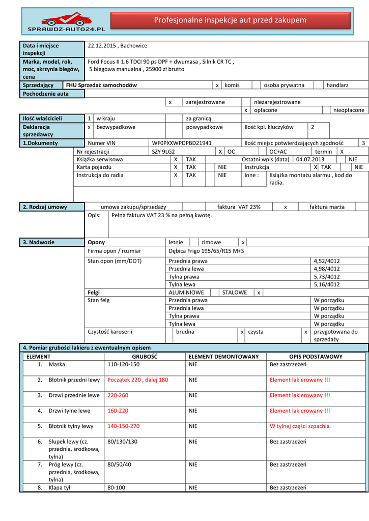Profesjonalne inspekcje aut przed zakupem Data i miejsce 22.12.2015 , Bachowice inspekcji Marka, model, rok, Ford Focus II 1.6 TDCI 90 ps DPF + dwumasa , Silnik CR TC , moc, skrzynia biegów, 5 biegowa manualna , 25900 zł brutto cena Sprzedający FHU Sprzedaż samochodów x komis Pochodzenie auta x zarejestrowane osoba prywatna x Ilość właścicieli Deklaracja sprzedawcy 1.Dokumenty 1 w kraju x bezwypadkowe Numer VIN Nr rejestracji Książka serwisowa Karta pojazdu Instrukcja do radia 2. Rodzaj umowy Opis: 3. Nadwozie za granicą powypadkowe WF0PXXWPDPBD21941 SZY 9LG2 X TAK X TAK X TAK X OC NIE NIE niezarejestrowane opłacone letnie zimowe x Dębica Frigo 195/65/R15 M+S Stan opon (mm/DOT) Przednia prawa Przednia lewa Tylna prawa Tylna lewa ALUMINIOWE Przednia prawa Przednia lewa Tylna prawa Tylna lewa brudna 4. Pomiar grubości lakieru z ewentualnym opisem ELEMENT GRUBOŚĆ 1. Maska 110-120-150 2 Ilość miejsc potwierdzających zgodność 3 OC+AC termin X Ostatni wpis (data) 04.07.2013 NIE Instrukcja X TAK NIE Inne : Książka montażu alarmu , kod do radia. Opony Firma opon / rozmiar Czystość karoserii nieopłacone Ilość kpl. kluczyków umowa zakupu/sprzedaży faktura VAT 23% Pełna faktura VAT 23 % na pełną kwotę. Felgi Stan felg handlarz x faktura marża 4,52/4012 4,98/4012 5,73/4012 5,16/4012 STALOWE x x czysta x W porządku W porządku W porządku W porządku przygotowana do sprzedaży ELEMENT DEMONTOWANY NIE OPIS PODSTAWOWY Bez zastrzeżeń 2. Błotnik przedni lewy Początek 220 , dalej 180 NIE Element lakierowany !!! 3. Drzwi przednie lewe 220-260 NIE Element lakierowany !!! 4. Drzwi tylne lewe 160-220 NIE Element lakierowany !!! 5. Błotnik tylny lewy 140-150-270 NIE W tylnej części szpachla 6. Słupek lewy (cz. przednia, środkowa, tylna) Próg lewy (cz. przednia, środkowa, tylna) Klapa tył 80/130/130 NIE Bez zastrzeżeń 80/50/40 NIE Bez zastrzeżeń 80-100 NIE Bez zastrzeżeń 7. 8. Profesjonalne inspekcje aut przed zakupem 9. Błotnik przedni prawy 10. Drzwi przednie prawe 11. Drzwi tylne prawe 90-100 NIE Mała rysa na błotniku 120-150 NIE Bez zastrzeżeń 180-400-600 TAK 12. Błotnik tylny prawy 13. Słupek prawy (cz. przednia, środkowa, tylna) 14. Próg prawy (cz. przednia, środkowa, tylna) 15. Dach (strona: lewa, prawa, środek) 16. Podłużnice przód (strona: lewa i prawa) 17. Podłoga tył ( strona : lewa i prawa) 18. Zderzak przedni 180-260 110/130/170-190 NIE NIE Element lakierowany w środkowej części , drzwi nie skręcone na zawiasie !! Element lakierowany !!! Bez zastrzeżeń 90/30/80 NIE Bez zastrzeżeń 120/130/120 NIE Bez zastrzeżeń 130/130 NIE Bez zastrzeżeń 20/60 NIE Bez zastrzeżeń XXX NIE 19. Zderzak tylny XXX NIE 20. Wnęka drzwi (przednie lewe) 21. Wnęka drzwi (przód prawe) 22. Wnęka drzwi (tył lewe) 23. Wnęka drzwi (tył prawe) 50/80 NIE Element z widocznymi odpryskami, otarciami – zalakierowany lakierem zaprawkowym. Element ponownie lakierowany – bród pod lakierem !!! Bez zastrzeżeń 70/80 NIE Bez zastrzeżeń 40/60 NIE Bez zastrzeżeń 60/80 NIE Bez zastrzeżeń SZCZEGÓŁOWY OPIS POWŁOKI BLACHARSKO – LAKIERNICZEJ / SZYBY Samochód do oględzin umyty . Lewa strona nosi ślady napraw blacharsko – lakierniczych począwszy od błotnika przedniego przód aż po tylny błotnik . Naprawa wykonana w miarę dobrze , widoczne brudy pod lakierem bezbarwnym. Tylny lewy błotnik posiada widoczne odcięcie bazy pod lakierem bezbarwnym. Prawa strona posiada lakierowane tylne prawe drzwi na wysokości połowy drzwi – drzwi nie dokręcone na zawiasach !!! Tylny zderzak lakierowany z widocznymi pyłkami pod bezbarwnym , na łączeniu tylnego zderzaka oraz błotnika tył prawa strona widoczne nie doprowadzenie do końca powłoki przez lakiernika. Przedni zderzak z widocznymi obtarciami, niektóre zamalowane lakierem zaprawkowym. Zderzak przedni nie gra z kolorem lakierowanego lewego boku. Auto po lekkiej polerce ręcznej . Nie spasowana przednia prawa lampa do zderzaka. Wszystkie szyby poza czołowa oryginalne znakowane logiem Ford’ Profesjonalne inspekcje aut przed zakupem 5. Komora silnika Wycieki Czystość NIE brudna x TAK x czysta Typ: x umyta do sprzedaży 1.Stary wyciek spod uszczelniacza półoś prawa strona 2. Stary wyciek spod uszczelki przewodu wspomagania kierownicy przy przekładni Poziom płynów oleju płynu chłodniczego płynu hamulcowego płynu wspomagania Inne uwagi Akumulator Inne uszkodzenia lub braki: 10,7 V / 9,4 V (pod obciążeniem) Akumulator do doładowania. 6. Wnętrze Odpalenie Kontrolki na desce rozdzielczej, błędy Stan licznika Stan wykładziny w kabinie Stan gałki zmiany biegów Stan foteli przednich Stan wykładziny w bagażniku Stan deski rozdzielczej Palone we wnętrzu Opis uszkodzeń oraz szczegółowy opis stanu w przypadku kiedy jest on zły(nie odpowiada deklarowanemu przebiegowi auta) Opis uszkodzeń, ewentualnego wyposażenia dodatkowego 7. Jazda próbna (jeśli jest możliwość) 8. Wizyta na stacji kontroli, podwozie niski niski niski niski Brak x x x x optymalny optymalny optymalny optymalny nadmiar nadmiar nadmiar nadmiar x płynne z problemami Brak zapalonych jakichkolwiek kontrolek. zły zły zły zły zły Tak Ogólna czystość brudno x dobry Stan kierownicy x dobry Stan pedałów x dobry Stan kanapy x dobry Stan podsufitki x dobry Stan boczków x Nie x czysto zły zły zły zły zły x x x x x wnętrz. prane dobry dobry dobry dobry dobry Brak. Zestaw głośnomówiący Nokia – działający . Alarm Logic montowany w serwisach ASO Forda. Jazda próbna wykonana , lekkie drgania na kierownicy spowodowane zardzewiałymi tarczami przednimi , słyszalny przegub prawa strona . Przyspieszanie w porządku. 1.Stary wyciek spod uszczelniacza półoś prawa strona 2. Stary wyciek spod uszczelki przewodu wspomagania kierownicy przy przekładni 3. Uszkodzony zaczep przewodów hamulcowych (urwane zapięcie) 4.Świst z okolic paska osprzętu lub paska rozrządu – do dalszej kontroli. Pro