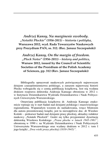Andrzej Kansy, Na marginesie swobody. „Notatki Płockie” (1956-2011) – historia i polityka, Warszawa 2012, wyd. Rada Towarzystw Naukowych przy Prezydium PAN, ss. 312. (Rec. Janusz Szczepański) Andrzej Kansy, On the margin of freedom. „Plock Notes” (1956-2011) – history and politics, Warsaw 2012, issued by the Council of Scientific Societies of the Presidium of the Polish Academy of Sciences, pp. 312 (Rev. Janusz Szczepański) Bibliografia opracowań naukowych poświęconych najnowszym dziejom czasopiśmiennictwa polskiego, a zarazem najnowszej historii Płocka wzbogaciła się o cenną publikację książkową. Jest nią wydana drukiem rozprawa doktorska Andrzeja Kansego obroniona w 2012 r. w Instytucie Dziennikarstwa Wydziału Dziennikarstwa i Nauk Politycznych Uniwersytetu Warszawskiego. Omawiana publikacja książkowa dr. Andrzeja Kansego znakomicie wpisuje się w nurt badań nad dziejami polskiego i mazowieckiego regionalizmu. Wspaniałym wzorem do naśladowania, wręcz Mistrzem dla autora prezentowanej książki, jest tu niewątpliwie doc. dr Wiesław Koński – prekursor badań nad dziejami prasy płockiej, aktualny redaktor naukowy „Notatek Płockich”. Godzi się tylko przypomnieć dysertację doktorską Wiesława Końskiego „Prasa płocka w latach 1945-1981”, obronioną w 1990 r. na Wydziale Dziennikarstwa i Nauk Politycznych Uniwersytetu Warszawskiego oraz wydany drukiem w 2012 r. tom I jego książki „Dwa wieki prasy płockiej (1810-1945)”. 455 „Rocznik Towarzystwa Naukowego Płockiego” 2014, nr 6 Ocena roli naukowych czasopism regionalnych, a do tych należy zaliczyć czasopismo Towarzystwa Naukowego Płockiego – „Notatki Płockie”, jest ważnym zadaniem nauk humanistycznych. Jest ona możliwa dzięki szerokiemu uwzględnieniu znaczenia regionu (a w tym przypadku – Mazowsza Płockiego – J. S.), przemian kulturowo-cywilizacyjnych, zachodzących na jego obszarze na tle wydarzeń społeczno-politycznych. Ukazujące się od blisko 60 lat „Notatki Płockie” są znakomitym odzwierciedleniem owych przemian w mazowieckim regionie. Stanowią one istotne źródło informacji zarówno o życiu społeczno-politycznym, gospodarczym i kulturalnym na Mazowszu Północnym, a zwłaszcza w Płocku okresu PRL (1956-1989), jak też lat III Rzeczypospolitej. Informują także o kierunkach i stanie badań nad historią i teraźniejszością mazowieckiego regionu z udziałem lokalnego środowiska inteligencji. Konstrukcja książki Andrzeja Kansego oparta jest na zasadzie chronologiczno-problemowej. Układ poszczególnych rozdziałów jest prawidłowy i czytelny, umożliwiający pełne zaprezentowanie różnorodnych aspektów funkcjonowania „Notatek Płockich”. W rozdziale I autor na kanwie dziejów najdłużej istniejącego na ziemiach polskich towarzystwa naukowego – Towarzystwa Naukowego Płockiego przybliża genezę jego organu, jakim są „Notatki Płockie”. Nawiązuje do politycznych uwikłań kolejnych prezesów TNP. Przypomina sylwetki Aleksandra Macieszy – członka Narodowej Demokracji oraz aresztowanego pod koniec 1949 r. przez władze komunistyczne – Bolesława Jędrzejewskiego. Należący do ZWZ, a następnie do AK prezes Jędrzejewski, za rzekomą współpracę z hitlerowskim okupantem otrzymał wyrok 15 lat więzienia. Został uwolniony na mocy amnestii w 1956 r. Wybrany w lutym 1950 r. nowy prezes TNP – adw. Roman Lutyński przed wojną związany był z PSL „Wyzwolenie”. W niesłychanie ciężkich czasach polskiego stalinizmu, w ramach pogłębiania stosunków polsko-radzieckich, stał się rzecznikiem utworzenia w Bibliotece TNP działu wiedzy o Polsce Ludowej, w którym skompletowano literaturę radziecką, na czele z dziełami klasyków marksizmu i leninizmu. Pełniący w latach 1957-1968 funkcję prezesa TNP – adw. Tadeusz Gierzyński należał do Stronnictwa Demokratycznego. Po jego śmierci, I wiceprezes i niekwestionowany lider intelektualny TNP – mec. Kazimierz Askanas nie mógł objąć stanowiska prezesa ze względu na 456 jego żydowskie pochodzenie. Został nim dotychczasowy II wiceprezes TNP – inż. Jakub Chojnacki, pełniący tę zaszczytną funkcję przez 34 lata, aż do kwietnia 2002 r. Kiedy ustępował ze względu na sędziwy wiek, zgodnie z jego wolą, nowy zarząd TNP wybrał na stanowisko prezesa TNP – dr. inż. Zbigniewa Kruszewskiego. Andrzej Kansy daje liczne przykłady świadczące o tym, iż działalnością TNP w latach 1945-2011 kierowali prezesi o charyzmatycznych predyspozycjach, podejmujący często wyzwania wbrew obowiązującym zasadom ustroju socjalistycznego. Należał nawet do nich, w pełni akceptowany przez władze partyjne Płocka i województwa płockiego prezes Chojnacki. Realizował on, np. ideę zawieszenia kopii romańskich „Drzwi Płockich” w Katedrze Płockiej, co na ogół nie podobało się władzom komunistycznym. Nawiązując do genezy „Notatek Płockich”, autor podkreśla, że były one początkowo wydawane jako Biuletyn Komisji Badań nad Powstaniem i Rozwojem Płocka. Ich pierwszy numer ukazał się drukiem 22 lipca 1956 r., w 12. rocznicę Manifestu Lipcowego PKWN. Andrzej Kansy nie daje jednoznacznej odpowiedzi na pytanie, kiedy „Notatki Płockie” stały się periodykiem Towarzystwa Naukowego Płockiego. Niewątpliwie powstanie czasopisma należy wiązać z atmosferą polityczną wydarzeń Polskiego Października 1956 r. Omawiając kolejne rozdziały, poświęcone m.in. formule wydawniczej (rozdział II), relacjom z władzami (rozdział III), redaktorom „Notatek Płockich” i ich wkładowi w rozwój czasopisma (rozdział IV), autor wprowadza klarowne cezury czasowe. Pierwszą z nich są lata 1956-1968, kiedy to na fali październikowej odnowy poszukiwano właściwego profilu czasopisma, a redaktorami „Notatek Płockich” byli: Tadeusz Gierzyński i Kazimierz Askanas. Kolejną cezurę stanowią lata 1968-1980, kiedy to funkcję redaktora „Not