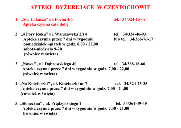APTEKI DYŻURUJĄCE W CZĘSTOCHOWIE 1. „Św. Łukasza” ul. Focha 4/6 Apteka czynna całą dobę tel. 34/324-15-09 2. „4 Pory Roku” ul. Warszawska 2/14 Apteka czynna przez 7 dni w tygodniu poniedziałek –piątek w godz. 8,00 - 22,00 sobota-niedziela 9-20 (również w święta) tel. 34/324-46-93 lub tel. 34/366-76-17 3. „Nasza” , ul. Dąbrowskiego 40 tel. 34/368-16-66 Apteka czynna przez 7 dni w tygodniu w godz. 7,00 - 22,00 (również w święta) 4. „Na Kościuszki” , ul. Kościuszki nr 7 tel. 34/324-25-35 Apteka czynna przez 7 dni w tygodniu w godz. 7,00 - 24,00 (również w święta) 5. „Słoneczna” , ul. Prądzyńskiego 1 tel. 34/361-49-49 Apteka czynna przez 7 dni w tygodniu w godz. 7,30 - 21,00 (również w święta)