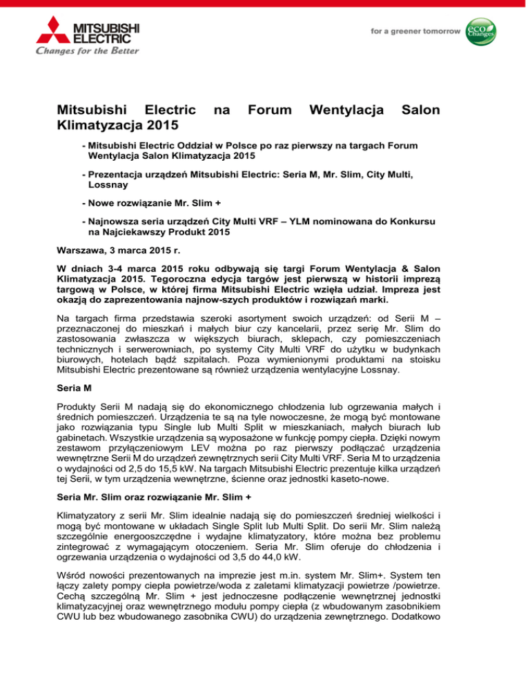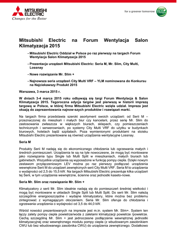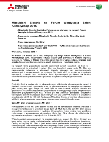 Mitsubishi Electric Klimatyzacja 2015 na Forum Wentylacja Salon - Mitsubishi Electric Oddział w Polsce po raz pierwszy na targach Forum Wentylacja Salon Klimatyzacja 2015 - Prezentacja urządzeń Mitsubishi Electric: Seria M, Mr. Slim, City Multi, Lossnay - Nowe rozwiązanie Mr. Slim + - Najnowsza seria urządzeń City Multi VRF – YLM nominowana do Konkursu na Najciekawszy Produkt 2015 Warszawa, 3 marca 2015 r. W dniach 3-4 marca 2015 roku odbywają się targi Forum Wentylacja & Salon Klimatyzacja 2015. Tegoroczna edycja targów jest pierwszą w historii imprezą targową w Polsce, w której firma Mitsubishi Electric wzięła udział. Impreza jest okazją do zaprezentowania najnow-szych produktów i rozwiązań marki. Na targach firma przedstawia szeroki asortyment swoich urządzeń: od Serii M – przeznaczonej do mieszkań i małych biur czy kancelarii, przez serię Mr. Slim do zastosowania zwłaszcza w większych biurach, sklepach, czy pomieszczeniach technicznych i serwerowniach, po systemy City Multi VRF do użytku w budynkach biurowych, hotelach bądź szpitalach. Poza wymienionymi produktami na stoisku Mitsubishi Electric prezentowane są również urządzenia wentylacyjne Lossnay. Seria M Produkty Serii M nadają się do ekonomicznego chłodzenia lub ogrzewania małych i średnich pomieszczeń. Urządzenia te są na tyle nowoczesne, że mogą być montowane jako rozwiązania typu Single lub Multi Split w mieszkaniach, małych biurach lub gabinetach. Wszystkie urządzenia są wyposażone w funkcję pompy ciepła. Dzięki nowym zestawom przyłączeniowym LEV można po raz pierwszy podłączać urządzenia wewnętrzne Serii M do urządzeń zewnętrznych serii City Multi VRF. Seria M to urządzenia o wydajności od 2,5 do 15,5 kW. Na targach Mitsubishi Electric prezentuje kilka urządzeń tej Serii, w tym urządzenia wewnętrzne, ścienne oraz jednostki kaseto-nowe. Seria Mr. Slim oraz rozwiązanie Mr. Slim + Klimatyzatory z serii Mr. Slim idealnie nadają się do pomieszczeń średniej wielkości i mogą być montowane w układach Single Split lub Multi Split. Do serii Mr. Slim należą szczególnie energooszczędne i wydajne klimatyzatory, które można bez problemu zintegrować z wymagającym otoczeniem. Seria Mr. Slim oferuje do chłodzenia i ogrzewania urządzenia o wydajności od 3,5 do 44,0 kW. Wśród nowości prezentowanych na imprezie jest m.in. system Mr. Slim+. System ten łączy zalety pompy ciepła powietrze/woda z zaletami klimatyzacji powietrze /powietrze. Cechą szczególną Mr. Slim + jest jednoczesne podłączenie wewnętrznej jednostki klimatyzacyjnej oraz wewnętrznego modułu pompy ciepła (z wbudowanym zasobnikiem CWU lub bez wbudowanego zasobnika CWU) do urządzenia zewnętrznego. Dodatkowo system ten jest niezwykle wydajny. W okresie letnim dzięki odzyskowi energii z klimatyzowanych pomieszczeń, możliwe jest ekonomiczne podgrzewanie CWU. Także w przejściowych porach roku nowy system Mitsubishi Electric pozwa-la na ograniczenie zużycia energii do przygotowania CWU. Odzysk ciepła możliwy jest bowiem w szerokim zakresie temperatur – aż do 7 °C (na zewnątrz). City Multi VRF Seria City Multi przeznaczona jest do dużych i wymagających budynków, w których konieczne są indywidualne rozwiązania techniki klimatyzacyjnej. Różnorodność modeli urządzeń wewnętrznych oraz duży zakres mocy urządzeń zewnętrznych gwarantują maksymalną elastyczność podczas planowania i wymiarowania. Seria City Multi charakteryzuje się szerokim zakresem wydajności urządzeń zewnętrznych: 11,2 / 12,5 do 140,0 / 156,5 kW w trybie chłodzenia/ grzania. Na szczególne wyróżnienie spośród przedstawianych przez Mitsubishi Electric produktów serii City Multi VRF zasługuje nowy typoszereg urządzeń zewnętrznych – YLM. Jednostki typoszeregu YLM zostały skonstruowane pod kątem efektywności sezonowej. Dzięki temu w trybie chłodzenia można ją zwiększyć aż o 47%, a w trybie grzania o 21%. Wynika to z zastosowania nowatorskiego płaskorurowego wymiennika z aluminium o większej powierzchni transferu ciepła i mniejszej stracie ciśnienia. Mitsubishi Electric jest pierwszym producentem na świecie, który stosuje system VRF z tą technologią. Nowością jest także wysokosprawna sprężarka, której charaktery-styka sprężania także zoptymalizowana została pod kątem wysokiej efektywności sezonowej. Urządzenie zewnętrzne posiada zmienną temperaturę odparowania czynnika chłodniczego. Oznacza to, że gdy temperatura pomieszczenia zbliży się do ustawionej wartości zadanej, następuje zwiększenie temperatury odparowania. Aby moc grzewcza dostępna była także podczas odszraniania, realizowane jest ono na zmianę w dwóch sekcjach, na które podzielony jest wymiennik („Comfort Heating”). Urządzenie YLM – zostało zgłoszone do odbywającego się podczas Targów Forum Wentylacja Salon Klimatyzacja 2015 Konkursu na Najciekawszy Produkt. Lossnay Urządzenia wentylujące Lossnay to idealne rozwiązanie do zapewniania wymaganej ilości świeże-go powietrza w klimatyzowanych pomieszczeniach. Posiadają funkcję odzyskiwania ciepła. Oferują one techniczne innowacje i interesujące rozwiązania, zwiększając komfort w nowoczesnych budynkach i redukując koszty energii. Podczas targów wśród prezentowanych produktów Mitsubishi Electric są także urządzenia Lossnay. VL-100EU5-E to nowe urządzenie ścienne o nowoczesnym wyglądzie i kolorze jasnej bieli, które wyróżnia się niskim poziomem hałasu. Cechuje je także wysoka sprawność do 80% podczas wymiany temperatury pomiędzy odprowadzanym powietrzem z pomieszczenia a doprowadzanym powietrzem świeżym. Drugi prezentowany pro-dukt Lossnay to nowe urządzenie kanałowe serii RVX. Rekuperatory te dzięki swoim kompaktowym wymiarom idealnie nadają się do instalacji w suficie podwieszanym. Urządzenia tej serii wyposażone są w nowoczesne wentylatory EC, które zapewniają wyjąt