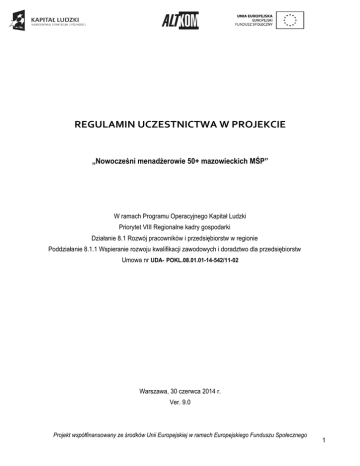 REGULAMIN UCZESTNICTWA W PROJEKCIE „Nowocześni menadżerowie 50+ mazowieckich MŚP” W ramach Programu Operacyjnego Kapitał Ludzki Priorytet VIII Regionalne kadry gospodarki Działanie 8.1 Rozwój pracowników i przedsiębiorstw w regionie Poddziałanie 8.1.1 Wspieranie rozwoju kwalifikacji zawodowych i doradztwo dla przedsiębiorstw Umowa nr UDA- POKL.08.01.01-14-542/11-02 Warszawa, 30 czerwca 2014 r. Ver. 9.0 Projekt współfinansowany ze środków Unii Europejskiej w ramach Europejskiego Funduszu Społecznego 1 §1 PRZEPISY OGÓLNE 1. Regulamin określa warunki rekrutacji i uczestnictwa Uczestników Projektu w ramach projektu „Nowocześni menadżerowie 50+ mazowieckich MŚP” realizowanego w ramach Programu Operacyjnego Kapitał Ludzki, Priorytet VIII Regionalne kadry gospodarki, Działanie 8.1 Rozwój pracowników i przedsiębiorstw w regionie, Poddziałanie 8.1.1 Wspieranie rozwoju kwalifikacji zawodowych i doradztwo dla przedsiębiorstw. 2. Projekt jest współfinansowany przez Unię Europejską w ramach Europejskiego Funduszu Społecznego. 3. Wszystkie decyzje podejmowane w oparciu o regulamin są zgodne z umową nr UDA-POKL.08.01.01-14-542/11-02 o dofinansowanie projektu „Nowocześni menadżerowie 50+ mazowieckich MŚP” z dnia 24 sierpnia 2012 roku, zawartą pomiędzy Altkom Akademia S.A., a Mazowiecką Jednostką Wdrażania Programów Unijnych. 4. Okres realizacji projektu: 01.11.2012 roku – 31.10.2014 roku. 5. Obszar realizacji projektu: województwo mazowieckie. §2 SŁOWNIK POJĘĆ Użyte w niniejszym Regulaminie pojęcia, oznaczają: 1. Beneficjent/Wnioskodawca / Akademia – Altkom Akademia S.A.; 2. Instytucja Pośrednicząca – Mazowiecka Jednostka Wdrażania Programów Unijnych; 3. Uczestnik Projektu – osoba zakwalifikowana zgodnie z zasadami określonymi w niniejszym regulaminie do udziału w Projekcie, bezpośrednio korzystająca z wdrażanych szkoleń; 4. Projekt – Projekt „Nowocześni menadżerowie 50+ mazowieckich MŚP”; 5. PO KL – Program Operacyjny Kapitał Ludzki; 6. Biuro Projektu – ul. Chłodna 51, 00-867 Warszawa 7. EFS – Europejski Fundusz Społeczny. §3 CEL PROJEKTU 1. Cel główny projektu to podniesienie kompetencji menadżerskich 270 pracowników 50+ (w tym 135 kobiet) ze 130 przedsiębiorstw województwa. Cel główny zostanie osiągnięty do 31.10.2014 r. w województwie mazowieckim przez spełnienie celów szczegółowych tj.: a. wzrost o 60 % wiedzy i umiejętności z zakresu zarządzania przez 135 menadżerów w wieku 50+, b. podniesienie o 60 % efektywności osobistej u 135 menadżerów w województwie mazowieckim, c. wzrost samooceny 270 menadżerów 50+ w wyniku rozwoju kwalifikacji zawodowych i określenia ścieżki rozwoju zawodowego. §4 GRUPA DOCELOWA 1. Projekt skierowany jest do do mikro, małych, średnich i dużych przedsiębiorstw posiadających jednostkę organizacyjną na terenie woj. mazowieckiego oraz ich pracowników (270 osób w tym 135 kobiet) mieszkających lub pracujących w woj. mazowieckim, którzy ukończyli 50 r.ż. i wykonują lub są przygotowywani do wykonywania funkcji na stanowisku menadżera. 2. Przedsiębiorstwa., których pracownicy wezmą udział w projekcie, nie korzystały dotąd ze wsparcia w zakresie projektów szkoleniowych w ramach Poddziałania 8.1.1 PO KL 3. W szkoleniach nie mogą brać udziału osoby zatrudnione na umowy cywilno prawne. Projekt współfinansowany ze środków Unii Europejskiej w ramach Europejskiego Funduszu Społecznego 2 §5 ZGŁOSZENIE UCZESTNICTWA 1. Wstępne zgłoszenie uczestnictwa w szkoleniach oferowanych przez Akademię odbywa się przez wypełnienie, podpisanie oraz przesłanie Karty zgłoszenia wraz z zapotrzebowaniem na szkolenia. Dokument stanowi zbiór podstawowych informacji dotyczących Przedsiębiorcy oraz szkoleń będących przedmiotem jego zainteresowania. 2. Karta Zgłoszenia powinna być dostarczona do Biura Projektu lub przesłana pocztą elektroniczną na adres [email protected]. W przypadku braku takiej możliwości dokumenty powinny zostać przesłane faksem na numer (22) 460 99 00 3. Przesłana Karta Zgłoszenia nie gwarantuje uczestnictwa w wybranym szkoleniu. 4. W przypadku przesłania poprawnie wypełnionej Karty Zgłoszenia i spełnieniu wymogów udziału w szkoleniach dokonywana jest analiza potrzeb szkoleniowych. 5. Na podstawie nadesłanych Kart Zgłoszenia stanowiących deklarację uczestnictwa Przedsiębiorcy w szkoleniu Akademia dokona wyboru zgłoszeń kierując się założeniami i celami projektu. 6. Akademia zastrzega sobie prawo zaproponowania innych warunków szkolenia, bądź odmowy przeprowadzenia szkolenia wskazanego w zapotrzebowaniu. 7. Informacja o kwalifikacji oraz warunkach przeprowadzania szkolenia zostanie przekazana Przedsiębiorcy pocztą elektroniczną na adres wskazany na Karcie Zgłoszenia lub, w przypadku braku powyższego, telefonicznie pod numer wskazany tamże. §6 REKRUTACJA 1. Proces rekrutacji przebiegać będzie zgodnie z zasadą równego traktowania płci odnoszącą się do równości szans, praw, korzyści. 2. Liczba osób do przeszkolenia: 270 w tym samozatrudnieni: 50 w tym zatrudnieni w mikroprzedsiębiorstwach: 10 w tym zatrudnieni w małych przedsiębiorstwach: 60 w tym zatrudnieni w średnich przedsiębiorstwach: 150 3. Liczba przedsiębiorstw objętych wsparciem Mikroprzedsiębiorstwa: 60 Małe przedsiębiorstwa: 40 Średnie przedsiębiorstwa: 30 4. Rekrutacja prowadzona będzie w trybie ciągłym (do czasu wykorzystania limitu miejsc) przy wsparciu działań informacyjnopromocyjnych. 5. Podstawową zasadą doboru będzie kolejność zgłoszeń, z odrębnymi listami dla kobiet (co najmniej 50% miejsc w Projekcie). 6. O przyjęciu Uczestnika do udziału w Projekcie decyduje spełnienie kryteriów formalnych określonych w dokumentach programowych POKL i wniosku o dofinasowanie Projektu. 7. Do wzięcia udziału w Projekcie wymagane jest podpisanie umowy szkoleniowej i innych wymaganych dok