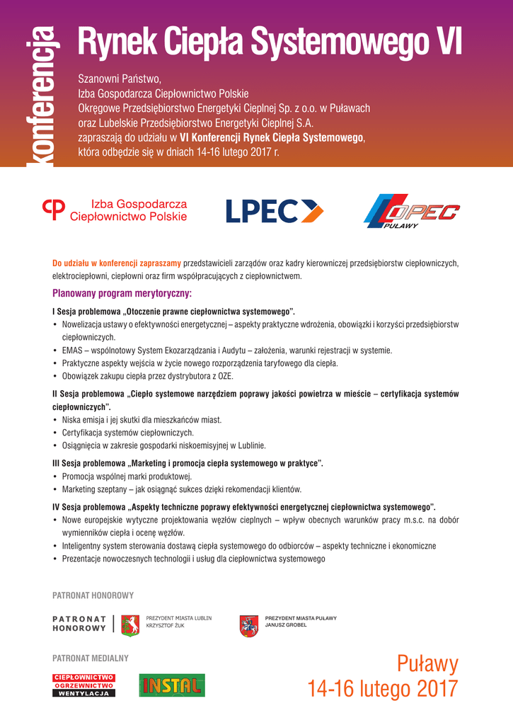 konferencja Rynek Ciepła Systemowego VI Szanowni Państwo, Izba Gospodarcza Ciepłownictwo Polskie Okręgowe Przedsiębiorstwo Energetyki Cieplnej Sp. z o.o. w Puławach oraz Lubelskie Przedsiębiorstwo Energetyki Cieplnej S.A. zapraszają do udziału w VI Konferencji Rynek Ciepła Systemowego, która odbędzie się w dniach 14-16 lutego 2017 r. Do udziału w konferencji zapraszamy przedstawicieli zarządów oraz kadry kierowniczej przedsiębiorstw ciepłowniczych, elektrociepłowni, ciepłowni oraz firm współpracujących z ciepłownictwem. Planowany program merytoryczny: I Sesja problemowa „Otoczenie prawne ciepłownictwa systemowego”. • Nowelizacja ustawy o efektywności energetycznej – aspekty praktyczne wdrożenia, obowiązki i korzyści przedsiębiorstw ciepłowniczych. • EMAS – wspólnotowy System Ekozarządzania i Audytu – założenia, warunki rejestracji w systemie. • Praktyczne aspekty wejścia w życie nowego rozporządzenia taryfowego dla ciepła. • Obowiązek zakupu ciepła przez dystrybutora z OZE. II Sesja problemowa „Ciepło systemowe narzędziem poprawy jakości powietrza w mieście – certyfikacja systemów ciepłowniczych”. • Niska emisja i jej skutki dla mieszkańców miast. • Certyfikacja systemów ciepłowniczych. • Osiągnięcia w zakresie gospodarki niskoemisyjnej w Lublinie. III Sesja problemowa „Marketing i promocja ciepła systemowego w praktyce”. • Promocja wspólnej marki produktowej. • Marketing szeptany – jak osiągnąć sukces dzięki rekomendacji klientów. IV Sesja problemowa „Aspekty techniczne poprawy efektywności energetycznej ciepłownictwa systemowego”. • Nowe europejskie wytyczne projektowania węzłów cieplnych – wpływ obecnych warunków pracy m.s.c. na dobór wymienników ciepła i ocenę węzłów. • Inteligentny system sterowania dostawą ciepła systemowego do odbiorców – aspekty techniczne i ekonomiczne • Prezentacje nowoczesnych technologii i usług dla ciepłownictwa systemowego PATRONAT HONOROWY PREZYDENT MIASTA PUŁAWY JANUSZ GROBEL PATRONAT MEDIALNY Puławy 14-16 lutego 2017 konferencja Rynek Ciepła Systemowego VI Szanowni Państwo, Izba Gospodarcza Ciepłownictwo Polskie Okręgowe Przedsiębiorstwo Energetyki Cieplnej Sp. z o.o. w Puławach oraz Lubelskie Przedsiębiorstwo Energetyki Cieplnej S.A. zapraszają do udziału w VI Konferencji Rynek Ciepła Systemowego, która odbędzie się w dniach 14-16 lutego 2017 r. Planowany program ramowy 14 luty 2017 r. – wtorek 14.00-18.00 Przyjazd i zakwaterowanie uczestników 18.00-19.30 Koncert w Domu Chemika 19.30-22.00 Kolacja 15 luty 2017 r. – środa 7.00-9.00 Śniadanie 9.00-11.00 I Sesja problemowa 11.00-11.30 Przerwa 11.30-12.30 II Sesja problemowa 12.30-13.30 III Sesja problemowa 13.30-14.30 Obiad 15.00-18.00 IV Sesja problemowa 19.00-24.00 Kolacja integracyjna w Pałacu Czartoryskich Puławy 14-16 lutego 2017 16 luty 2017 r. – czwartek 7.00-10.00 Śniadanie 10.00-13.00 Wycieczka do Kazimierz Dolnego 13.00-14.00 Obiad i wyjazd Informacje organizacyjne: Miejsce obrad: Hotel IUNG, Al. Królewska 17 w Puławach. Zakwaterowanie i wyżywienie: Hotel IUNG Al. Królewska 17, informacja o hotelu na stronie: www.iung.pulawy.pl Hotel Izabella ul. Lubelska 1, informacja o hotelu na stronie: www.izabella.pl Hotel Pół Ławy ul. Czartoryskich 6, informacja o hotelu na stronie: www.scsk.pl Program szczegółowy konferencji zostanie zamieszczony na stronie: www.igcp.org.pl Organizatorzy w oparciu o kartę zgłoszenia zapewniają uczestnikom konferencji: udział w konferencji, materiały konferencyjne, noclegi 14/15.02.2017 r. oraz 15/16.02.2017 r. wyżywienie od kolacji 14.02.2017 r. do obiadu 16.02.2017 r., udział w imprezach towarzyszących. Firmom współpracującym z ciepłownictwem proponujemy dodatkowo promocję w formie: • prezentacja (15 min.) oferty na forum konferencji, • reklama w materiałach konferencyjnych (1 str. A4 kolor), • dystrybucja materiałów reklamowych, • prezentacja oferty na ministoisku. Kartę zgłoszenia udziału w konferencji należy przesłać do 2.02.2017 r. w formie skanu e-mailem lub faksem do Centrum Szkoleniowego Izby Gospodarczej Ciepłownictwo Polskie, e-mail: [email protected], fax: 22 378 25 70. Zgłoszenia prezentacji/reklamy należy przesłać do 30.01.2017 r. W imieniu organizatorów serdecznie zapraszamy Jacek Szymczak Prezes Zarządu Jolanta Jańczak Prezes Zarządu Ryszard Jabłoński Prezes Zarządu Izba Gospodarcza Ciepłownictwo Polskie Lubelskie Przedsiębiorstwo Energetyki Cieplnej S.A. Okręgowe Przedsiębiorstwo Energetyki Cieplnej Sp. z o.o. w Puławach