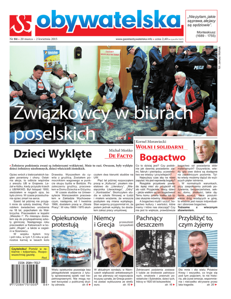„Nie pytam, jakie są prawa, ale jacy są sędziowie”. www.gazetaobywatelska.info • cena 2,40 (w tym 8% VAT) fot. Janusz Wolniak Nr 84 • 20 marca – 2 kwietnia 2015 Monteskiusz (1689 - 1755) Związkowcy w biurach poselskich str. 8 ► Dzieci Wyklęte Michał Mońko DĊ FĆĈęĔ Kornel Morawiecki WĔđēĎ Ď ĘĔđĎĉĆėēĎ Bogactwo ■ Żołnierze podziemia zwani są żołnierzami wyklętymi. Mnie to razi. Owszem, były wyklęte Co to dzisiaj jest? Czy podob- bogactwo od posiadania dóbr nie jak dawniej posiadanie: zie- materialnych? Oczywiście, wtedzieci żołnierzy niezłomnych, dzieci właścicieli ziemskich. Ojciec wrócił z biebrzańskich bagien poraniony i chory. Ostatnia akcja, to odbicie więźniów z aresztu UB w Grajewie. Leżał w łóżku, kiedy przyszło trzech z UB/NKWD. Był listopad 1950, siedziałem w nogach ojca, bo było zimno. W czasie przesłuchania ojciec zmarł na serce. Sześć lat później nie przyjęli mnie do szkoły średniej. Podrobiłem świadectwo urodzenia na 18 lat, pojechałem do Wałbrzycha. Pracowałem w kopalni „Mieszko I”. Po miesiącu dostałem się do przykopalnianej szkoły górniczej. Następnego roku pracowałem w Katowicach w kopalni „Wujek”, a także w cegielni w Sosnowcu. W wojsku byłem trzy i pół roku, w tym 1,5 roku w jednostce karnej w lasach koło Drawska. Wyszedłem do cywila z gruźlicą. Zostałem pomocnikiem wagowego w punkcie skupu bydła w Bełdzie. Po zaleczeniu gruźlicy, pracowałem w Domu Dziecka w Giżycku. W czasie studiów na Uniwersytecie Warszawskim pracowałem w Zakładzie Wychowawczym, następnie, od 1 kwietnia 1966, dostałem pracę w „Głosie Pracy”. W roku 1969 i 1970 skoń- czyłem dwa kierunki studiów na UW. Pięć lat później rozpocząłem pracę w „Kulturze”, pisałem nieetatowo do „Literatury”, „Miesięcznika Literackiego”, „Odry” i „Kontrastów”. Skończyłem studia w szkole filmowej w Łodzi i miałem wrażenie, że wreszcie pozbyłem się miana wyklętego. Stan wojenny przypomniał mi, że jestem jednak wyklęty, bo dostałem zakaz pracy umysłowej. Opiekunowie Niemcy protestują i Grecja przeszłość i przyszłość mi, fabryk i pieniędzy, uczestnictwo we władzy i przywilejach? Najwyższy czas aby na nowo zapytać: kto jest naprawdę bogaty? Rosyjskie przysłowie powiada: lepiej mieć stu przyjaciół niż sto rubli. Przyjaciele, bliscy, dzieci – jakże wielkim są oni bogactwem! Temu komu zmarła matka lub ojciec słusznie mówimy: zbiedniałeś. A bogactwo myśli i uczuć, bogactwo kultury i wartości, które mamy i które nas otaczają? Czy nie jest to większe, prawdziwsze dy, gdy owe dobra są dostępne na zasadniczym poziomie. Tylko wtedy możemy dążyć do wyższych pięter istnienia. W normalnych warunkach, przy zaspokojeniu potrzeb pożywienia, bezpieczeństwa, seksu, domu, bliskości, takie dążenie wzwyż, takie poszukiwanie dróg wiodących w górę, to właśnie jest nasze indywidualne i zbiorowe bogactwo. Pachnący deszczem Przybliżyć to, czym żyjemy Żołnierzami podziemia zostawali ludzie ze środowisk patriotycznych, wnukowie i prawnuki powstańców i Sybiraków, dzieci tych, którzy w 1920 bili bolszewików. str. 16 ► Dla mnie i dla wielu Polaków Kresy i wszystko, co kryje się pod tym pojęciem, to nie historia, ale żywe emocje, wspomnienia i nierzadko skrywane przez lata tragedie. str. 20 ► Tożsame z zbawieniem. wiecznym Czytelniku! Pomóż w reklamie i kolportażu. Rozpowszechniaj gazetę. Red. ISSN 2084-7017 9 772084 701005 Wielu opiekunów pozostaje bez jakiegokolwiek wsparcia z tytuły sprawowanej opieki nad niepełnosprawnymi. Nie mogą nawet korzystać z publicznej służstr. 6 ► 8 4 > by zdrowia. W aktualnym sondażu w Niemczech większość ankietowanych po raz pierwszy od rozpoczęcia kryzysu uznała, że Grecja powinna zostać wykluczona ze strefy euro. str. 10 ► Opinie i Akcenty 2 „Przed wszystkim” i „Jest” – cz. II ■ Krótka historia jednego przekładu Prologu z Ewangelii św. Jana Św. Jan Ewangelista, czyli Johanan ben Zebadia – jak wiemy – nie był Grekiem. Był synem Izraela. Nie ma żadnych na to dowodów – tak rozmyślam – że napisał swoją Ewangelię po grecku. mywać się nad tym fragmentem i przechodzę do następnego członu zdania: „Kai ho Logos en pros ton Theon” – „A Słowo było u Boga”. A teraz: „Kai Theos en ho Logos” – „A Bóg był Słowem”. Więc jak brzmi cały pierwszy werset: „Przed wszystkim było Równie dobrze mógł ją napisać w swoim Słowo, a Słowo było u Boga, a Bóg był ojczystym języku, po hebrajsku lub ara- Słowem”? mejsku. W takim wypadku grecki tekst, Szukanie dziury w całym który posiadamy, byłby przekładem z hebrajskiego lub aramejskiego. Greckie teksty czwartej Ewangelii, Apokalipsy i trzech Nie jestem zadowolony. Popełniłem jaListów roją się od hebraizmów i arame- kiś błąd, jakiś nieokreślony błąd, któizmów, co jest niezbitym dowodem, że au- rego nie mogę wyłowić. Ogarnia mnie tor podczas pisania myślał po hebrajsku zniechęcenie. Jest to dziwne uczucie, rodzaj czerwonego światła, któlub aramejsku. re zapala się we mnie, ilekroć napisaPrzede wszystkim łem coś, co nie jest zgodne z moim suMimo tych wszystkich zastrzeżeń i wątpliwości biorę do ręki długopis i próbuję tłumaczyć grecki tekst. Ilekroć dotychczas zamierzałem tłumaczyć coś z Pisma Św. rozpoczynałem od takich właśnie niby niezobowiązujących mnie prób a przebieg tej wstępnej pracy nad przekładem albo – określając ściślej –tego pierwszego i nieśmiałego przenikania w obcojęzyczny tekst postaram się tutaj w miarę możności podać ze stenograficzną dokładnością wraz z całym procesem skojarzeń. „En arche” – „Na początku”. „Na początku” nie ma nic wspólnego z pojęciem czasu. Według Filona z Aleksandrii: „Czas nie istniał przed światem, lecz raczej powstał wraz z ni