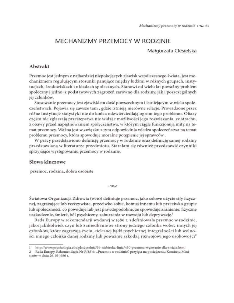 Mechanizmy przemocy w rodzinie • 61 MECHANIZMY PRZEMOCY W RODZINIE Małgorzata CIesielska Abstrakt Przemoc jest jednym z najbardziej niepokojących zjawisk współczesnego świata, jest mechanizmem regulującym stosunki panujące między ludźmi w różnych grupach, instytucjach, środowiskach i układach społecznych. Stanowi od wielu lat poważny problem społeczny i jedno z podstawowych zagrożeń zarówno dla rodziny, jak i poszczególnych jej członków. Stosowanie przemocy jest zjawiskiem dość powszechnym i istniejącym w wielu społeczeństwach. Pojawia się zawsze tam , gdzie istnieją nierówne relacje. Prowadzone przez różne instytucje statystyki nie do końca odzwierciedlają ogrom tego problemu. Ofiary często nie zgłaszają przestępstwa nie widząc możliwości jego rozwiązania, ze strachu, z obawy przed napiętnowaniem społeczeństwa, w którym ciągle funkcjonują mity na temat przemocy. Ważna jest w związku z tym odpowiednia wiedza społeczeństwa na temat problemu przemocy, która spowoduje moralne potępienie jej sprawców . W pracy przedstawiono definicję przemocy w rodzinie oraz definicję samej rodziny przedstawianą w literaturze przedmiotu. Starałam się również przedstawić czynniki sprzyjające występowaniu przemocy w rodzinie. Słowa kluczowe przemoc, rodzina, dobra osobiste • Światowa Organizacja Zdrowia (WHO) definiuje przemoc, jako celowe użycie siły fizycznej, zagrażające lub rzeczywiste, przeciwko sobie, komuś innemu lub przeciwko grupie lub społeczności, co powoduje lub jest prawdopodobne, że spowoduje zranienie, fizyczne uszkodzenie, śmierć, ból psychiczny, zaburzenia w rozwoju lub deprywację.1 Rada Europy w rekomendacji wydanej w 1986 r. zdefiniowała przemoc w rodzinie, jako: jakikolwiek czyn lub zaniedbanie ze strony jednego członka wobec innych jej członków, które zagrażają życiu, cielesnej bądź psychicznej integralności lub wolności innego członka danej rodziny lub poważnie szkodzą rozwojowi jego osobowości2 1 http://www.psychologia.edu.pl/czytelnia/59-niebieska-linia/450-przemoc-wyzwanie-dla-swiata.html 2 Rada Europy, Rekomendacja Nr R(85)4: „Przemoc w rodzinie”, przyjęta na posiedzeniu Komitetu Ministrów w dniu 26. 03 1986 r. 62 • Małgorzata ciesielska Irena Pospiszyl określa przemoc w rodzinie, jako: „wszelkie nieprzypadkowe akty godzące w osobistą wolność jednostki lub przyczyniające się do fizycznej i psychicznej szkody osoby, wykraczające poza społeczne zasady wzajemnych relacji”.3 Według Anety Styńskiej przemocą w rodzinie należy nazwać każde działanie, które przy użyciu przewagi sił jednej ze stron przeciw członkom własnej rodziny, celowo narusza ich prawa i dobra osobiste, powodując szkody i cierpienie.4 Według ustawy o przeciwdziałaniu przemocy w rodzinie przez przemocy w rodzinie należy przez to rozumieć jednorazowe albo powtarzające się umyślne działanie lub zaniechanie naruszające prawa lub dobra osobiste osób (członków rodziny, a także innych osób wspólnie zamieszkujących lub gospodarujących), w szczególności narażające te osoby na niebezpieczeństwo utraty życia, zdrowia, naruszające ich godność, nietykalność cielesną, wolność, w tym seksualną, powodujące szkody na ich zdrowiu fizycznym lub psychicznym, a także wywołujące cierpienia i krzywdy moralne u osób dotkniętych przemocą.5 Zgodnie z ustawową definicją przemocy przemocą jest nie tylko powtarzające się zachowanie, ale również pojedyncze. Może to być działanie lub zaniechanie jakiejś czynności, czyli niepodjęcie działania, niewykonanie jakiejś czynności. Zachowanie to musi być umyślne.6 Dobra osobiste wskazane w definicji to wartości niematerialne, przynależne każdemu człowiekowi. Zakres pojęcia „dobra osobiste” zawarty jest w art. 23 kodeksu cywilnego: „ Dobra osobiste człowieka, jak w szczególności zdrowie, wolność, cześć, swoboda sumienia, nazwisko lub pseudonim, wizerunek, tajemnica korespondencji, nietykalność mieszkania, twórczość naukowa, artystyczna, wynalazcza i racjonalizatorska, pozostają pod ochroną prawa cywilnego niezależnie od ochrony przewidzianej w innych przepisach.”7 Przemoc w rodzinie to zamierzone i wykorzystujące przewagę sił działanie przeciw członkowi rodziny, naruszające prawa i dobra osobiste, powodujące cierpienia i szkody. 8 Przemoc w rodzinie charakteryzuje się tym, że: 1. Jest intencjonalna. Przemoc jest zamierzonym działaniem człowieka i ma na celu kontrolowanie i podporządkowanie ofiary. 2. Siły są nierównomierne. W relacji jedna ze stron ma przewagę nad drugą. Ofiara jest słabsza a sprawca silniejszy. 3. Narusza prawa i dobra osobiste. Sprawca wykorzystuje przewagę siły narusza podstawowe prawa ofiary (np. prawo do nietykalności fizycznej, godności, szacunku itd.). 3 I. Pospiszyl, Razem przeciwko przemocy , Warszawa 1999, s.16. 4 A. Styńska, Zrozumieć przemoc. Poradnik dla doświadczających przemocy i ich bliskich, Psychorada.pl, 2009, str. 18. 5 Ustawa z dnia 29 lipca 2005r. o przeciwdziałaniu przemocy w rodzinie (Dz. U. z 2005r. Nr 180, poz.1493 z późn. zm.). 6 S. Spurek, Izolacja sprawcy od ofiary. Instrumenty przeciwdziałania przemocy w rodzinie, Warszawa 2013, s.26. 7 Ustawa z dnia 23 kwietnia 1964r. Kodeks Cywilny (Dz. U. z 1964 Nr 16, poz. 93 z późn. zm.). 8 S. Supurek, dz.cyt, s.25. Mechanizmy przemocy w rodzinie • 63 4. Powoduje cierpienie i ból. Sprawca naraża zdrowie i życie ofiary na poważne szkody. Doświadczanie bólu i cierpienia sprawia, że ofiara ma mniejszą zdolność do samoobrony.9 Rodzina jest przedmiotem badań wielu dyscyplin naukowych, dlatego też istnieje wielość definicji i różnorodność rozpatrywania dotyczących jej problemów. Rodzina wywiera ogromny wpływ na rozwój fizyczny, psychiczny, społeczny jej członków, w szczególności zaś dzieci. Rodzina dzięki oddziaływaniom przygotowuje je do samodzielnego ży