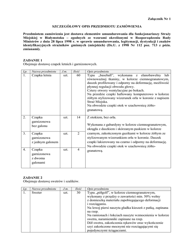 Załącznik Nr 1 SZCZEGÓŁOWY OPIS PRZEDMIOTU ZAMÓWIENIA Przedmiotem zamówienia jest dostawa elementów umundurowania dla funkcjonariuszy Straży Miejskiej w Białymstoku – zgodnych ze wzorami określonymi w Rozporządzeniu Rady Ministrów z dnia 28 lipca 1998 r. w sprawie umundurowania, legitymacji, dystynkcji i znaków identyfikacyjnych strażników gminnych (miejskich) (Dz.U. z 1998 Nr 112 poz. 713 z późn. zmianami). ZADANIE 1 Obejmuje dostawę czapek letnich i garnizonowych. J.m. Ilość Lp. Nazwa przedmiotu Opis przedmiotu 1. Czapka letnia szt. 60 Typu „baseball”, wykonana z elanobawełny lub równoważnej tkaniny, w kolorze ciemnogranatowym, daszek profilowany i odporny na deformację, możliwość płynnej regulacji obwodu głowy. Cztery otwory wentylacyjne po bokach. Na przedzie czapki haftowany komputerowo w kolorze żółtym stylizowany wizerunek orła w koronie z napisem Straż Miejska. Na obwodzie czapki otok w szachownicę żółtogranatową. 2. Czapka garnizonowa bez galonu szt. 14 Z otokiem, bez orła. 3. Czapka garnizonowa z jednym galonem szt. 2 4. Czapka garnizonowa z dwoma galonami szt. 4 Wykonana z gabardyny w kolorze ciemnogranatowym, okrągła z daszkiem i skórzanym paskiem w kolorze czarnym, zakończonym guzikami w kolorze żółtym ze stylizowanym wizerunkiem orła w koronie. Daszek czapki lakierowany na czarno i odporny na deformację. Na obwodzie czapki otok w szachownicę żółtogranatową. ZADANIE 2 Obejmuje dostawę swetrów i szalików. Lp. Nazwa przedmiotu J.m. Ilość 1. Sweter szt. 30 Opis przedmiotu Typu „półgolf”, w kolorze ciemnogranatowym, wykonany z przędzy o zawartości min. 50% wełny z domieszką materiału zapobiegającego deformacji i rozciąganiu. Na lewej piersi naszyta gładka kieszeń z patką, zapinana na rzep. Na ramionach i łokciach naszyte wzmocnienia w kolorze swetra, naramienniki zapinane na rzep. Dół swetra, zakończenia rękawów oraz wykończenie szyi zakończone mocnymi nie rozciągającymi się pojedynczymi ściągaczami. 2. Szalik zimowy szt. 40 W kolorze ciemnogranatowym, bez frędzli, wykonany z przędzy o zawartości min. 50% wełny z domieszką materiału zapobiegającego deformacji i rozciąganiu, o wymiarach nie krótszych niż: długość 100 cm, szerokość 25 cm. ZADANIE 3 Obejmuje dostawę kurtek i koszulobluz. J.m. Ilość Lp. Nazwa przedmiotu 1. Kurtka uniwersalna z kamizelką szt. 50 2. Kurtka zimowa ¾ szt. 50 3. Koszulobluza szt. 10 Opis przedmiotu Kurtka w kolorze ciemnogranatowym, wykonana z tkaniny nieprzemakalnej odpornej na użytkowanie w trudnych warunkach atmosferycznych. Do kurtki dopinana na zamek błyskawiczny kamizelka (bezrękawnik) z pagonami identycznymi jak kurtka i patką na odznakę indentyfikacyjną oraz ściągaczem na dole. Kamizelka posiada 2 duże kieszenie z kontrafałdą na wysokości piersi. Na zewnątrz kurtki naszyte dwie dolne kieszenie z patkami zapinanymi na rzepy (kieszenie dostępne z góry i z boku), jedna kieszeń wewnętrzna. Odpinany kołnierz futrzany. U góry na wysokości lewej piersi patka na odznakę identyfikacyjną zapinana na rzep (odznaka mocowana na wkręt). Kurtka zapinana na zamek błyskawiczny kryty listwą zapinaną na napy. Naramienniki zapinane na małe guziki w kolorze kurtki. U dołu kurtki i na rękawach wszyte ściągacze. Szerokie szlufki na pas główny rozmieszczone symetrycznie. Kurtka i kamizelka muszą posiadać ocieplenie stałe. Kurtka ¾ w kolorze ciemnogranatowym, wykonana z tkaniny nieprzemakalnej odpornej na użytkowanie w trudnych warunkach atmosferycznych. Do kurtki wszyta na stałe podpinka. Z przodu na zewnątrz kurtki cztery kieszenie (dwie górne gładkie naszywane, dwie dolne wpuszczane z patkami zapinanymi na napy, jedna kieszeń wewnętrzna. Kołnierz w postaci stójki. Bez kaptura. Nad lewą górną kieszenią patka na odznakę identyfikacyjną zapinana na rzep (odznaka mocowana na wkręt). Kurtka zapinana na zamek błyskawiczny kryty listwą zapinaną na napy. Naramienniki zapinane na małe guziki w kolorze kurtki. W kolorze ciemnogranatowym, wykonana z elanobawełny o składzie minimum 55% bawełny, zapinana pod szyję na guziki w kolorze tkaniny. Kołnierz ze wzmocnionymi końcówkami wszyty w stójkę zapinaną pod szyję. Na piersiach naszyte dwie nakładane kieszenie z fałdami i patkami, zapinanymi na guziki w kolorze tkaniny. Powyżej lewej górnej kieszeni patka z otworem wzmocnionym metalowym oczkiem na przymocowanie odznaki identyfikacyjnej. Rękawy wykończone mankietami zapinanymi na jeden guzik w kolorze koszuli, na ramionach naramienniki zapinane na guziki koloru koszuli. Tył koszulobluzy - karczek z kontrafałdą pośrodku. ZADANIE 4 Obejmuje dostawę koszul. J.m. Ilość Lp. Nazwa przedmiotu 1. Koszula wizytowa błękitna, długi rękaw szt. 30 2. Koszula wizytowa biała, długi rękaw szt. 120 3. Koszula mundurowa błękitna, krótki rękaw szt. 50 4. Koszula mundurowa biała, krótki rękaw szt. 200 Opis przedmiotu Kolor błękitny, długi rękaw, 1 kieszeń nie zapinana. Wykonana z tkaniny koszulowej o zawartości min. 55% bawełny, kołnierzyk zapinany na jeden mały guzik w kolorze koszuli, bez pagonów. Koszula z listwą przednią zapinana na małe guziki w kolorze koszuli. Kolor biały, długi rękaw, 1 kieszeń nie zapinana. Wykonana z tkaniny koszulowej o zawartości min. 55% bawełny, kołnierzyk zapinany na jeden mały guzik w kolorze koszuli, bez pagonów. Koszula z listwą przednią zapinana na małe guziki w kolorze koszuli. Kolor błękitny, krótki rękaw. Wykonana z tkaniny koszulowej o zawartości min. 55% bawełny, kołnierzyk zapinany na jeden mały guzik w kolorze koszuli. Na przodzie u góry koszuli naszyte kieszenie z patkami zapinanymi na małe guziki w kolorze koszuli, wszyte naramienniki w kolorze koszuli zapinane na guziki jw. Koszula z listwą przednią zapinana na guziki jw. Kolor biały, krótki rękaw Wykonana z tkaniny koszulowej o zawartości min. 55% bawełny, koł