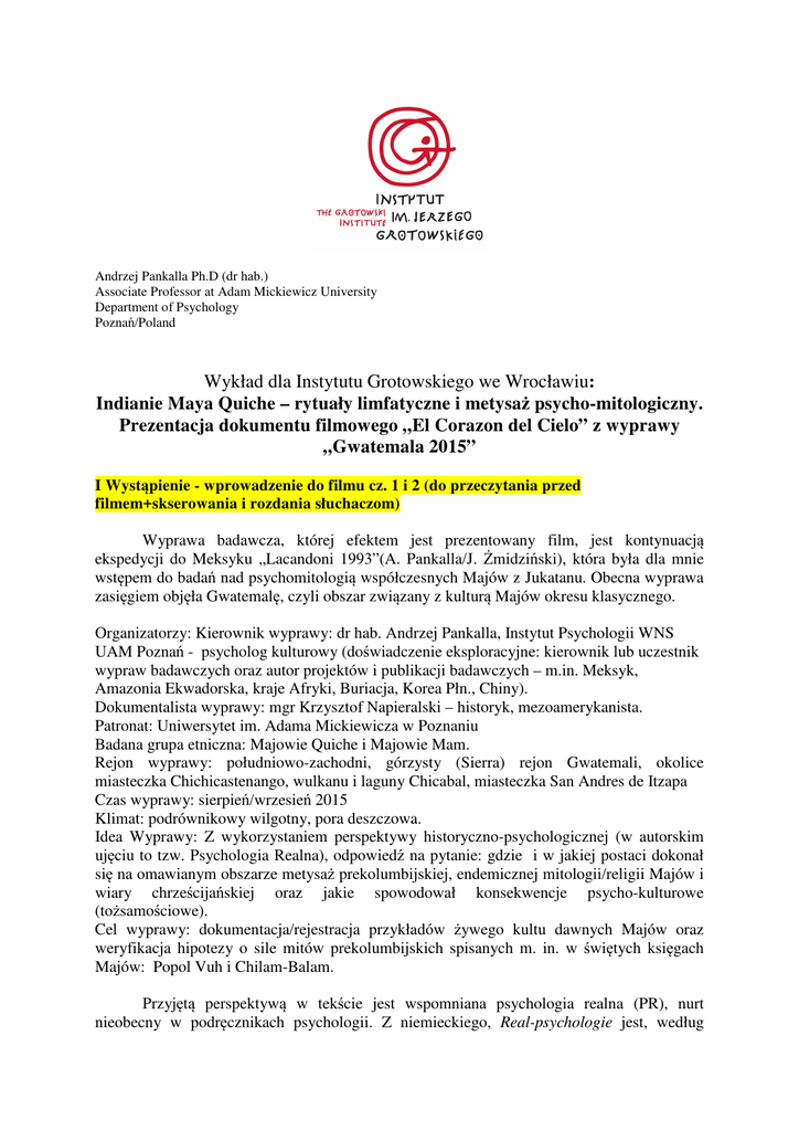 Andrzej Pankalla Ph.D (dr hab.) Associate Professor at Adam Mickiewicz University Department of Psychology Poznań/Poland Wykład dla Instytutu Grotowskiego we Wrocławiu: Indianie Maya Quiche – rytuały limfatyczne i metysaż psycho-mitologiczny. Prezentacja dokumentu filmowego „El Corazon del Cielo” z wyprawy „Gwatemala 2015” I Wystąpienie - wprowadzenie do filmu cz. 1 i 2 (do przeczytania przed filmem+skserowania i rozdania słuchaczom) Wyprawa badawcza, której efektem jest prezentowany film, jest kontynuacją ekspedycji do Meksyku „Lacandoni 1993”(A. Pankalla/J. Żmidziński), która była dla mnie wstępem do badań nad psychomitologią współczesnych Majów z Jukatanu. Obecna wyprawa zasięgiem objęła Gwatemalę, czyli obszar związany z kulturą Majów okresu klasycznego. Organizatorzy: Kierownik wyprawy: dr hab. Andrzej Pankalla, Instytut Psychologii WNS UAM Poznań - psycholog kulturowy (doświadczenie eksploracyjne: kierownik lub uczestnik wypraw badawczych oraz autor projektów i publikacji badawczych – m.in. Meksyk, Amazonia Ekwadorska, kraje Afryki, Buriacja, Korea Płn., Chiny). Dokumentalista wyprawy: mgr Krzysztof Napieralski – historyk, mezoamerykanista. Patronat: Uniwersytet im. Adama Mickiewicza w Poznaniu Badana grupa etniczna: Majowie Quiche i Majowie Mam. Rejon wyprawy: południowo-zachodni, górzysty (Sierra) rejon Gwatemali, okolice miasteczka Chichicastenango, wulkanu i laguny Chicabal, miasteczka San Andres de Itzapa Czas wyprawy: sierpień/wrzesień 2015 Klimat: podrównikowy wilgotny, pora deszczowa. Idea Wyprawy: Z wykorzystaniem perspektywy historyczno-psychologicznej (w autorskim ujęciu to tzw. Psychologia Realna), odpowiedź na pytanie: gdzie i w jakiej postaci dokonał się na omawianym obszarze metysaż prekolumbijskiej, endemicznej mitologii/religii Majów i wiary chrześcijańskiej oraz jakie spowodował konsekwencje psycho-kulturowe (tożsamościowe). Cel wyprawy: dokumentacja/rejestracja przykładów żywego kultu dawnych Majów oraz weryfikacja hipotezy o sile mitów prekolumbijskich spisanych m. in. w świętych księgach Majów: Popol Vuh i Chilam-Balam. Przyjętą perspektywą w tekście jest wspomniana psychologia realna (PR), nurt nieobecny w podręcznikach psychologii. Z niemieckiego, Real-psychologie jest, według Diltheya, „nauką o rzeczywistej psychice” (Kuderowicz, 1967, s. 176), będącą niezbędnym uzupełnieniem „studium form życia duchowego” poprzez opis „realności jego przebiegu i jego treści” (ibidem, s. 174) i ma swe korzeniu w romantyzmie: u niemieckiego filozofa Franza von Baadera oraz Novalisa vel Georga von Hardenberga. Taka rozumiejąca psychologia uzupełnia dokonania psychologii wyjaśniającej, wypełnia też lukę między tą ostatnią a naukami o kulturze. Dotyka realnych – tak jak są doświadczane przez jednostkę – przeżyć ludzkich odnoszących się do realnych faktów, czyli systemu wyobrażeń, „w którym to, co dane z zewnątrz, powiązane jest z biegiem mojego życia” (ibidem, s. 167). PR zajmuje się idąc za Hilmanem - analizą, opisem, interpretacją, a w efekcie rozumieniem realnie, wręcz namacalnie odczuwanych w życiu jednostki treści duszy, czyli całościami psychicznymi, wynikającymi z historii osoby ludzkiej i kontekstu historyczno-kulturowego epoki, w której dana osoba żyje. W prezentowanym ujęciu metysaż mitologiczny natomiast to przenikanie dwóch odmiennych mitologii i religii, w tym systemów wierzeń, symboli, a szerzej światopoglądów. To interakcja odmiennych panteonów bóstw i wiary w odmienne wartości życia doczesnego oraz życia po śmierci, to zderzenie politeizmu i animizmu z monoteizmem. Siła mitu jest ponadczasowa i wyjątkowo czytelna w Mezoameryce. Majowie nigdy i nigdzie nie przyjęli wiary katolickiej w pełni i w czystej formie. Po bolesnej konkwiście nastąpiła ich ucieczka w rejony niedostępne dla kolonizatorów. W ślad za cofającymi się ludami Majów podążali misjonarze, którzy jedynie częściowo skutecznie nawracali rdzenną ludność na katolicyzm. Kilkukrotnie Majowie organizowali powstania, do dziś zachowując w dużym stopniu autonomię i tożsamość psycho-kulturową, pielęgnując swe mity i odprawiając rytuały lub ich wersje zmodyfikowane o wierzenia katolickie. Film pokazuje aktualne miejsca żywego kultu w Gwatemali. Będą to przykłady metysażu religijno-mitologicznego obecnego w dwu typach żywego rytuału: 1.Samozwańczy, nieakceptowany przez Kościół katolicki kult świętej postaci Maximona (San Simona): mieszanka prekolumbijskich wierzeń w majańską boginię Mam (tytoń), deifikacji konkwistadora Gwatemali Pedro de Alvarado i wpływów katolickich: Judasza Iskarioty i San Simona, katolickiego duchownego niosącego pomoc Indianom W XVI wieku. 2. Quasi-szamańskiego leczenia, oczyszczania i ochrony przed złymi siłami u Indian Maja Quiche. Dokumentacja filmowa pokazuje jak wygląda rzeczywistość metysażu mitologicznego. Pogłębia to wiedzę psychologiczną na temat kształtowania się tożsamości religijnej (mit personalny/fantazmat w kontekście transformacji mitów kulturowych) oraz siły mitów, idei nigdy i nigdzie nie istniejących, ale zawsze prawdziwych i aktualnych, bowiem realnych psycho-kulturowo: tak dla całych jak społeczności, jak i psyche jednostek. Film być może pokaże jakie postaci przyjmuje (jak wygląda, a być może nawet dostrzeżecie Państwo jak przebiega?) w 2 wybranych, synkretycznych, współczesnych rytuałach - żywe przenikanie się, krzyżowanie, synestezja, by nie rzec korespondencja systemów mitologicznych i religijnych. I jak reagują na nią ludzie. I dwa pytania na koniec: Czy można tam mówić o specyficznym typie tożsamości religijnej, szerzej tożsamości jako takiej – wynikającej z korespondencji dusz i światów duchowych/kulturowych? Czy ujawniając te związki i zależności oraz fakt, z jaką łatwością koegzystują w rytuał