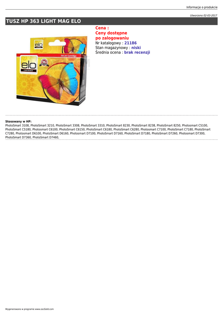 Informacje o produkcie Utworzono 02-03-2017 TUSZ HP 363 LIGHT MAG ELO Cena : Ceny dostępne po zalogowaniu Nr katalogowy : 21186 Stan magazynowy : niski Średnia ocena : brak recenzji Stosowany w HP: PhotoSmart 3108, PhotoSmart 3210, PhotoSmart 3308, PhotoSmart 3310, PhotoSmart 8230, PhotoSmart 8238, PhotoSmart 8250, Photosmart C5100, PhotoSmart C5180, Photosmart C6100, PhotoSmart C6150, PhotoSmart C6180, PhotoSmart C6280, Photosmart C7100, PhotoSmart C7180, PhotoSmart C7280, Photosmart D6100, PhotoSmart D6160, Photosmart D7100, PhotoSmart D7160, PhotoSmart D7180, PhotoSmart D7260, Photosmart D7300, PhotoSmart D7360, PhotoSmart D7460, Wygenerowano w programie www.oscGold.com