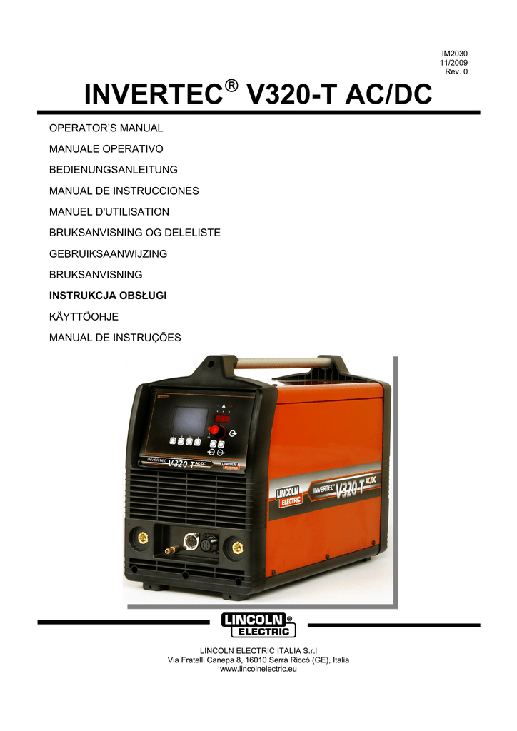 INVERTEC® V320-T AC/DC OPERATOR’S MANUAL MANUALE OPERATIVO BEDIENUNGSANLEITUNG MANUAL DE INSTRUCCIONES MANUEL D'UTILISATION BRUKSANVISNING OG DELELISTE GEBRUIKSAANWIJZING BRUKSANVISNING INSTRUKCJA OBSŁUGI KÄYTTÖOHJE MANUAL DE INSTRUÇÕES LINCOLN ELECTRIC ITALIA S.r.l Via Fratelli Canepa 8, 16010 Serrà Riccò (GE), Italia www.lincolnelectric.eu IM2030 11/2009 Rev. 0 Declaration of conformity Dichiarazione di conformità Konformitätserklärung Declaración de conformidad Déclaration de conformité Samsvars erklæring Verklaring van overeenstemming Försäkran om överensstämmelse Deklaracja zgodności Vakuutus yhteensopivuudesta Declaração de Conformidade LINCOLN ELECTRIC ITALIA S.r.l. Declares that the welding machine: Dichiara che Il generatore per saldatura tipo: Erklärt, daß die Bauart der Maschine: Declara que el equipo de soldadura: Déclare que le poste de soudage: Bekrefter at denne sveisemaskin: Verklaart dat de volgende lasmachine: Försäkrar att svetsomriktaren: Deklaruje, że spawalnicze źródło energii: Vakuuttaa, että hitsauskone: Declara que a máquina de soldar: INVERTEC® V320-T AC/DC conforms to the following directives: è conforme alle seguenti direttive: den folgenden Bestimmungen entspricht: es conforme con las siguientes directivas: est conforme aux directives suivantes: er i samsvar med følgende direktiver: overeenkomt conform de volgende richtlijnen: överensstämmer med följande direktiv: spełnia następujące wytyczne: täyttää seuraavat direktiivit: está em conformidade com as seguintes directivas: 2006/95/CEE, 2004/108/CEE and has been designed in compliance with the following standards: ed è stato progettato in conformità alle seguenti norme: und in Übereinstimmung mit den nachstehenden normen hergestellt wurde: y ha sido diseñado de acuerdo con las siguientes normas: et qu'il a été conçu en conformité avec les normes: og er produsert og testet iht. følgende standarder: en is ontworpen conform de volgende normen: och att den konstruerats i överensstämmelse med följande standarder: i że zostało zaprojektowane zgodnie z wymaganiami następujących norm: ja on suunniteltu seuraavien standardien mukaan: e foi concebida de acordo com as seguintes normas: EN 60974-1, EN 60974-10 (2009) Dario Gatti European Engineering Director Machines LINCOLN ELECTRIC ITALIA S.r.l., Via Fratelli Canepa 8, 16010 Serra Riccò (GE), Italia 12/05 II Português Suomi Polski Svenska Nederlandse Norsk Français Español Deutsch Italiano English 07/06 Do not dispose of electrical equipment together with normal waste! In observance of European Directive 2002/96/EC on Waste Electrical and Electronic Equipment (WEEE) and its implementation in accordance with national law, electrical equipment that has reached the end of its life must be collected separately and returned to an environmentally compatible recycling facility. As the owner of the equipment, you should get information on approved collection systems from our local representative. By applying this European Directive you will protect the environment and human health! Non gettare le apparecchiature elettriche tra i rifiuti domestici! In ottemperanza alla Direttiva Europea 2002/96/CE sui Rifiuti di Apparechiature Elettriche ed Elettroniche (RAEE) e la sua attuazione in conformità alle norme nazionali, le apparecchiature elettriche esauste devono essere raccolte separatamente e restituite ad una organizzazione di riciclaggio ecocompatibile. Come proprietario dell’apparecchiatura, Lei potrà ricevere informazioni circa il sistema approvato di raccolta, dal nostro rappresentante locale. Applicando questa Direttiva Europea Lei contribuirà a migliorare l’ambiente e la salute! Werfen Sie Elektrowerkzeuge nicht in den Hausmüll! Gemäss Europäischer Richtlinie 2002/96/EG über Elektro- und Elektronik- Altgeräte (Waste Electrical and Electronic Equipment, WEEE) und Umsetzung in nationales Recht müssen verbrauchte Elektrowerkzeuge getrennt gesammelt und einer umweltgerechten Wiederverwertung zugeführt werden. Als Eigentümer diese Werkzeuges sollten sie sich Informationen über ein lokales autorisiertes Sammel- bzw. Entsorgungssystem einholen. Mit der Anwendung dieser EU Direktive tragen sie wesentlich zur Schonung der Umwelt und ihrer Gesundheit bei! No tirar nunca los aparatos eléctricos junto con los residuos en general!. De conformidad a la Directiva Europea 2002/96/EC relativa a los Residuos de Equipos Eléctricos o Electrónicos (RAEE) y al acuerdo de la legislación nacional, los equipos eléctricos deberán ser recogidos y reciclados respetando el medioambiente. Como propietario del equipo, deberá informar de los sistemas y lugares apropiados para la recogida de los mismos. Aplicar esta Directiva Europea protegerá el medioambiente y su salud! Ne pas jeter les appareils électriques avec les déchets ordinaires! Conformément à la Directive Européenne 2002/96/EC relative aux Déchets d' Équipements Électriques ou Électroniques (DEEE), et à sa transposition dans la législation nationale, les appareils électriques doivent être collectés à part et être soumis à un recyclage respectueux de l’environnement. En tant que propriétaire de l’équipement, vous devriez vous informer sur les systèmes de collecte approuvés auprès nos représentants locaux. Appliquer cette Directive Européenne améliorera l’environnement et la santé! Kast ikke elektriske artikler sammen med vanlig søppel. I følge det europeiske direktivet for Elektronisk Søppel og Elektriske Artikler 2002/96/EC (Waste Electrical and Electronic Equipment, WEEE) skal alt avfall kildesorteres og leveres på godkjente plasser i følge loven. Godkjente retur plasser gis av lokale myndigheter. Ved å følge det europeiske direktivet bidrar du til å bevare naturen og den menskelige helse. Gooi elektrische apparatuur nooit bij gewoon afval! Met inachtneming van de Europese Richtlijn 2002/96/EC met betrekking tot Af