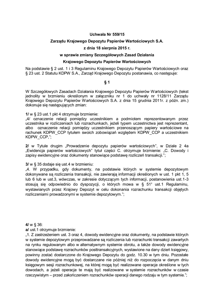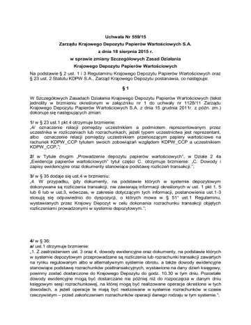 Uchwała Nr 559/15 Zarządu Krajowego Depozytu Papierów Wartościowych S.A. z dnia 18 sierpnia 2015 r. w sprawie zmiany Szczegółowych Zasad Działania Krajowego Depozytu Papierów Wartościowych Na podstawie § 2 ust. 1 i 3 Regulaminu Krajowego Depozytu Papierów Wartościowych oraz § 23 ust. 2 Statutu KDPW S.A., Zarząd Krajowego Depozytu postanawia, co następuje: §1 W Szczegółowych Zasadach Działania Krajowego Depozytu Papierów Wartościowych (tekst jednolity w brzmieniu określonym w załączniku nr 1 do uchwały nr 1128/11 Zarządu Krajowego Depozytu Papierów Wartościowych S.A. z dnia 15 grudnia 2011r. z późn. zm.) dokonuje się następujących zmian: 1/ w § 23 ust.1 pkt 4 otrzymuje brzmienie: „4/ oznaczenie relacji pomiędzy uczestnikiem a podmiotem reprezentowanym przez uczestnika w rozliczeniach lub rozrachunkach, jeżeli typem uczestnictwa jest reprezentant, albo oznaczenie relacji pomiędzy uczestnikiem przenoszącym papiery wartościowe na rachunek KDPW_CCP tytułem swoich zobowiązań względem KDPW_CCP a uczestnikiem KDPW_CCP,”; 2/ w Tytule drugim „Prowadzenie depozytu papierów wartościowych”, w Dziale 2 4a „Ewidencja papierów wartościowych” tytuł części C. otrzymuje brzmienie: „C. Dowody i zapisy ewidencyjne oraz dokumenty stanowiące podstawę rozliczeń transakcji.”; 3/ w § 35 dodaje się ust.4 w brzmieniu: „4. W przypadku, gdy dokumenty, na podstawie których w systemie depozytowym dokonywane są rozliczenia transakcji, nie zawierają informacji określonych w ust. 1 pkt 1, 5 lub 6 lub w ust.3, wówczas, w zakresie dotyczącym tych informacji, postanowienia ust.1-3 stosują się odpowiednio do dyspozycji, o których mowa w § 51¹ ust.1 Regulaminu, wystawianych przez Krajowy Depozyt w celu dokonania rozrachunku transakcji objętych rozliczeniami prowadzonymi w systemie depozytowym.”; 4/ w § 36: a/ ust.1 otrzymuje brzmienie: „1. Z zastrzeżeniem ust. 3 oraz 4, dowody ewidencyjne oraz dokumenty, na podstawie których w systemie depozytowym przeprowadzane są rozliczenia lub rozrachunki transakcji zawartych na rynku regulowanym albo w alternatywnym systemie obrotu, a także dowody ewidencyjne stanowiące podstawę rozrachunków posttransakcyjnych, wystawione na dany dzień księgowy, powinny zostać dostarczone do Krajowego Depozytu do godz. 10.30 w tym dniu. Pozostałe dowody ewidencyjne mogą być dostarczane nie później niż do rozpoczęcia w danym dniu księgowym sesji rozrachunkowej, na której mogą być realizowane operacje określone w tych dowodach, a jeżeli operacje te mają być realizowane w systemie rozrachunków w czasie rzeczywistym – przed zakończeniem rozrachunków operacji danego rodzaju w tym systemie.”; b/ ust.3 otrzymuje brzmienie: „3. Instrukcje rozrachunku oraz dokumenty stanowiące podstawę rozliczeń, dotyczące transakcji zawieranych na rynku regulowanym albo w alternatywnym systemie obrotu, dla których został wskazany termin rozrachunku T+0, mogą być dostarczane do Krajowego Depozytu w dniu wskazanym jako dzień księgowy, nie później niż do godziny rozpoczęcia ostatniej sesji rozrachunkowej, w ramach której dokonywane są tego rodzaju rozrachunki.”; 5/ po § 36 dodaje się § 36a w brzmieniu: „§ 36a 1. Dokument będący podstawą przeprowadzanego w systemie depozytowym rozliczenia transakcji, w przypadku której stronom transakcji nie jest ujawniana ich wzajemna tożsamość, zawiera oznaczenie podmiotowe indywidualne wskazujące na anonimową stronę transakcji, określone w załączniku nr 1. 2. Rozliczenie w systemie depozytowym transakcji zawartych w obrocie zorganizowanym przez podmioty niebędące uczestnikami następuje na podstawie dokumentów zawierających warunki tych transakcji, dostarczonych, odpowiednio, przez spółkę prowadzącą dany rynek regulowany albo przez podmiot organizujący dany alternatywny system obrotu, w zależności od miejsca ich zawarcia, i uzupełnionych o dane dotyczące numerów kont uczestników w typie uczestnictwa – reprezentant, posiadających w zakresie tych transakcji status uczestnika rozliczającego w systemie depozytowym, jeżeli dane te nie zostały wskazane w tych dokumentach.”; 6/ w § 47: a/ po ust.1a dodaje się ust.1b w brzmieniu: „1b. Postanowienia ust. 1 i 1a stosują się odpowiednio do dyspozycji, o których mowa w § 51¹ ust.1 Regulaminu, wystawianych przez Krajowy Depozyt w celu dokonania rozrachunku transakcji objętych rozliczeniami prowadzonymi w systemie depozytowym.”; b/ dodaje się ust.3 w brzmieniu: „3. Rozrachunek transakcji podlegającej rozliczeniu w systemie depozytowym, w przypadku której stronom transakcji nie jest ujawniana ich wzajemna tożsamość, jest przeprowadzany za pośrednictwem konta technicznego, zwanego kontem anonimowej strony transakcji.”; 7/ w § 53: a/ ust.5 otrzymuje brzmienie: „5. Rozrachunek transakcji odkupu papierów wartościowych zawieranych przez uczestników na rynku giełdowym albo w alternatywnym systemie obrotu organizowanym przez Giełdę Papierów Wartościowych w Warszawie S.A., w celu wykonania zobowiązań wynikających z innych transakcji, a także rozrachunek transakcji odkupu albo odsprzedaży papierów wartościowych zawieranych przez Krajowy Depozyt albo przez KDPW_CCP w ramach prowadzonych przez te podmioty systemów zabezpieczenia płynności rozliczania transakcji, na rynku giełdowym albo w alternatywnym systemie obrotu organizowanym przez Giełdę Papierów Wartościowych w Warszawie S.A., następują w terminie określonym przez strony tych transakcji.”; b/ ust.8 otrzymuje brzmienie: „8. Rozrachunek transakcji zawartych w trybie publicznej sprzedaży papierów wartościowych na rynku regulowanym giełdowym lub pozagiełdowym albo w alternatywnym systemie obrotu organizowanym przez Giełdę Papierów Wartościowych w Warszawie S.A., następuje w terminie określonym przez podmiot prowadzący właściwy system obrotu.”; 2 c/ ust.17 otrzymuje br