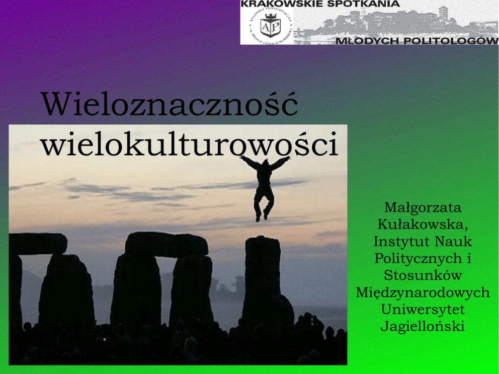 Wieloznaczność wielokulturowości Małgorzata Kułakowska, Instytut Nauk Politycznych i Stosunków Międzynarodowych Uniwersytet Jagielloński 1. Wielokulturowość czy multikulturalizm? Opis rzeczywistości; Filozofia; Ideologia; Projekt polityczny. Wielokulturowość jako opis rzeczywistości, czyli podejście deskryptywne W tym ujęciu wielokulturowość to: „współwystępowanie na tej samej przestrzeni (albo w bezpośrednim sąsiedztwie bez wyraźnego rozgraniczenia, albo w sytuacji aspiracji do zajęcia tej samej przestrzeni) dwóch lub więcej grup społecznych o odmiennych cechach dystynktywnych: wyglądzie zewnętrznym, języku, wyznaniu religijnym, układzie wartości itd., które przyczyniają się do wzajemnego postrzegania odmienności z różnymi tego skutkami” [Marian Golka]; Wielokulturowość czy multikulturalizm? „Wielokulturowość to fakt istnienia wielu kultur i świadomość takiego stanu rzeczy, a multikulturalizm to normatywna odpowiedź na wielokulturowość; [Michał Buchowski] Multikulturalizm jako filozofia czy ideologia? „Jako termin normatywny wielokulturowość oznacza aprobatę dywersyfikacji społecznej, wyrażonej w prawie gwarantującym odmiennym grupom kulturowym szacunek i uznanie, lub w aprobacie korzyści, jakie wypływają z różnorodności moralnej i kulturowej dla całego społeczeństwa” Andrew Heywood „Wielokulturowość (multiculturalism) to pogląd, że kultury mniejszościowe powinny mieć jak największą reprezentację w instytucjach prawnych, politycznych i edukacyjnych” [Roger Scruton] “jako multikulturalizm rozumieć zatem będę polityczną integrację (accommodation) społeczności imigranckich w krajach zachodniej Europy” [Tariq Modood] Wielokulturowość jako projekt polityczny czyli jak zarządzać wielokulturowością? Projekt community cohesion – czyli promowania spójności między-wspólnotowej „Spójna wspólnota to taka, w której: • ma miejsce wspólna wizja i poczucie przynależności odczuwalne we wszystkich społecznościach; •różnorodność środowisk i sytuacji życiowych jest doceniana i pozytywnie wartościowana; •jednostki z różnych środowisk i społeczności mają zapewnione podobne szanse życiowe; istnieją silne i pozytywne relacje pomiędzy osobami z różnych społeczności w miejscach pracy, w szkołach i w lokalnych środowiskach” [Guidance on community cohesion] Bibliografia: 1) Buchowski Michał, Antropologiczne kłopoty z multikulturalizmem, [w:] Czy klęska wielokulturowości?, Hanna Mamzer (red.), Wydawnictwo Fundacji Humaniora, Poznań 2008; 2) Guidance on Community Cohesion, Local Government Association 2002, uzyskany 15 marca 2008, http://www.communities.gov.uk/documents/communities/pdf/151411 3) Heywood Andrew, Politologia, Wydawnictwo Naukowe PWN, Warszawa 2006 4) Meer Nasar, Modood Tariq, The Multicultural State We're In: Muslims, 'Multiculture' and the 'Civic Re-balancing' of British Multiculturalism, “Political Studies”, October 2008; 5) Modood Tariq, Multiculturalism. A Civic Idea, Polity Press, Cambridge 2007 6) Scruton Roger, Słownik myśli politycznej, Zysk i S-ka, Poznań 2002; BARDZO DZIĘKUJĘ ZA UWAGĘ Wskazówki, uwagi, komentarze proszę przesyłać na adres [email protected]