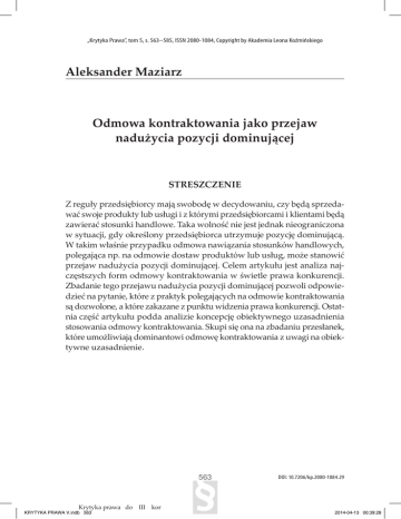 „Krytyka Prawa”, tom 5, s. 563–585, ISSN 2080-1084, Copyright by Akademia Leona Koźmińskiego Aleksander Maziarz Odmowa kontraktowania jako przejaw nadużycia pozycji dominującej Streszczenie Z reguły przedsiębiorcy mają swobodę w decydowaniu, czy będą sprzedawać swoje produkty lub usługi i z którymi przedsiębiorcami i klientami będą zawierać stosunki handlowe. Taka wolność nie jest jednak nieograniczona w sytuacji, gdy określony przedsiębiorca utrzymuje pozycję dominującą. W takim właśnie przypadku odmowa nawiązania stosunków handlowych, polegająca np. na odmowie dostaw produktów lub usług, może stanowić przejaw nadużycia pozycji dominującej. Celem artykułu jest analiza najczęstszych form odmowy kontraktowania w świetle prawa konkurencji. Zbadanie tego przejawu nadużycia pozycji dominującej pozwoli odpowiedzieć na pytanie, które z praktyk polegających na odmowie kontraktowania są dozwolone, a które zakazane z punktu widzenia prawa konkurencji. Ostatnia część artykułu podda analizie koncepcję obiektywnego uzasadnienia stosowania odmowy kontraktowania. Skupi się ona na zbadaniu przesłanek, które umożliwiają dominantowi odmowę kontraktowania z uwagi na obiektywne uzasadnienie. 563 Krytyka prawa do KRYTYKA PRAWA V.indb 563 III kor DOI: 10.7206/kp.2080-1084.29 2014-04-13 00:39:28 „Krytyka Prawa”, tom 5, s. 563–585, ISSN 2080-1084, Copyright by Akademia Leona Koźmińskiego Aleksander Maziarz Refusal to Deal as an Abuse of Dominant Position Abstract As a rule companies are free to decide where and when they will sell their products and with which companies or clients they are prepared to contract. Such freedom is not unlimited and a dominant company which refuses to deal may be accused of abusing its dominant position. The aim of the article is to analyse the most common forms of refusals to deal, with regard to the law on competition. The article will focus on practices which lead to the elimination of competition, discrimination against consumers and business partners and creating barriers of entry to the market. Examining such practices will answer the question as to which practices constitute a refusal to deal and abuse a dominant position. The last part of the article will focus on the issue of unbiased justification of refusal to deal. It will examine those conditions where the dominant undertaking can refuse to deal with its competitors or clients because of unbiased reasons. DOI: 10.7206/kp.2080-1084.29 KRYTYKA PRAWA V.indb 564 564 Krytyka prawa do III kor 2014-04-13 00:39:28 Odmowa kontraktowania jako przejaw nadużycia pozycji dominującej 1 Wprowadzenie Wolność gospodarcza oznacza nie tylko swobodę co do podjęcia i prowadzenia działalności gospodarczej, lecz również swobodę w nawiązywaniu relacji handlowych. Oznacza to, że przedsiębiorca sam decyduje, z którym klientem lub kontrahentem będzie zawierał umowy. Jednakże wolność wyboru klientów i kontrahentów nie jest nieograniczona. O ile przedsiębiorca nieutrzymujący pozycji dominującej na rynku może dowolnie dokonywać takiego wyboru, to już przedsiębiorca, który taką pozycję utrzymuje, musi mieć na uwadze, że jego działania mogą prowadzić do ograniczenia konkurencji. W tym ostatnim przypadku możliwym jest, że dominant, odmawiając dostaw produktów lub usług określonemu przedsiębiorcy, doprowadzi do wykluczenia go z rynku. Praktyka ta ma charakter wykluczający, prowadzi do wyeliminowania konkurentów z rynku, ograniczenia ich działalności oraz stworzenia barier dostępu do rynku. Stąd zachowania dominanta polegające na odmowie kontraktowania mogą wejść w zakres zakazu nadużywania pozycji dominującej. Możliwość stwierdzenia, że odmowa kontraktowania stanowi zachowanie niezgodne z prawem konkurencji, powoduje, że organ antymonopolowy może nałożyć na określonego przedsiębiorcę obowiązek dostaw. Jednakże już sama Komisja Europejska zauważyła, że nakładając taki obowiązek, nie zawsze będzie można ochronić mechanizm konkurencji. Przedsiębiorca zobligowany do dostaw może podjąć decyzję, że jego działalność objęta tym obowiązkiem nie przyniesie już mu zakładanych korzyści. Może więc on odstąpić od podejmowana działań, które wzmocniłyby konkurencję na określonym rynku – np. odstąpić od innowacji, czy znacząco obniżyć inwestycje na innowacje. W końcu sami konkurenci dominanta mogą stwierdzić, że skoro mają zapewnione dostawy określonego produktu po określonej przez organ antymonopolowej cenie, to też im nie będzie się opłacało inwestować w rozwój technologii1. Problemy te powodują, że ochrona przez działaniami dominantów polegającymi na odmowie kontraktowania musi być podejmowana bardzo rozważnie, ponieważ każda ingerencja organów Komisja Europejska, Dz. Urz. UE C45/18 z 2009 r., pkt 75. 1 565 Krytyka prawa do KRYTYKA PRAWA V.indb 565 III kor DOI: 10.7206/kp.2080-1084.29 2014-04-13 00:39:28 Krytyka Prawa antymonopolowych może wpłynąć na mechanizm konkurencji w długofalowej perspektywie. Odmowa kontraktowania może przejawiać się w wielu zachowaniach przedsiębiorców. Zwykle przybiera ona formę odmowy dostaw określonych produktów lub usług, odmowę dostępu do urządzeń kluczowych oraz odmowę udzielenia licencji2. Zbadanie odmowy kontraktowania będącej przejawem nadużycia pozycji dominującej jest istotne z tego powodu, że zarówno polski, jak i unijny prawodawca nie zdefiniowali, na czym praktyka ta może polegać. Jest to konsekwencją tego, że prawodawcy ci nie zdefiniowali, na czym polega samo nadużycie pozycji dominującej. Zamiast tego utworzyli otwarty katalog najczęściej występujących praktyk, które są przejawami nadużycia pozycji dominującej. W celu zbadania więc jednego z przejawów, jakim jest odmowa kontraktowania, niezbędne jest sięgnięcie do poglądów doktryny i orzecznictwa. Celem artykułu jest poddanie 