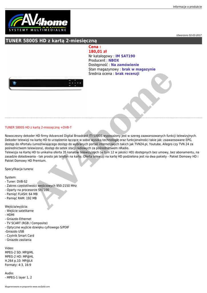 Informacje o produkcie Utworzono 02-03-2017 TUNER 5800S HD z kartą 2-miesięczną Cena : 180,01 zł TUNER 5800S HD z kartą 2-miesięczną +DVB-T om e Nr katalogowy : IM SAT190 Producent : NBOX Dostępność : Na zamówienie Stan magazynowy : brak w magazynie Średnia ocena : brak recenzji AV Specyfikacja tunera: 4h Nowoczesny dekoder HD firmy Advanced Digital Broadcast ITI-5800S wyposażony jest w szereg zaawansowanych funkcji telewizyjnych. Dekoder telewizji na kartę HD to urządzenie łączące w sobie wysoką technologię oraz funkcjonalności takie jak: zaawansowane EPG, dostęp do nPortalu (umożliwiającego dostęp do wybranych portali internetowych takich jak TVN24.pl, Youtube, Allegro czy TVN 24 za pośrednictwem telewizora), dostęp do setek stacji radiowych za pośrednictwem nRadio. Telewizja na Kartę HD to unikalna oferta 35 kanałów telewizyjnych (w tym 12 w jakości HD) dostępnych bez umowy, bez abonamentu, na zasadzie doładowania - tak prosto jak telefon na kartę. Oferta telewizji na kartę HD podzielona jest na dwa pakiety - Pakiet Domowy HD i Pakiet Domowy HD Premium. System: - Tuner: DVB-S2 - Zakres częstotliwości wejściowych 950-2150 MHz - Oparty na procesorze Sti7100 - Pamięć FLASH: 64 MB - Pamięć RAM: 192 MB Wejścia/wyjścia: - Wejście satelitarne - HDMI - Gniazdo Ethernet - TV SCART (RGB / Composite) - Optyczne wyjście dzwięku cyfrowego S/PDIF -Gniazdo USB - Czytnik Smart Card - Gniazdo zasilania Video: MPEG-2 SD: MP@ML MPEG-2 HD: MP@HL H.264 p.10: MP@L4 Formaty: 4:3, 16:9 Audio: - MPEG-1 layer 1, 2 Wygenerowano w programie www.oscGold.com - MPEG-1 layer 3 (MP3) - Dolby Digital przez S/PDIF Dostęp warunkowy: - Conax Oprogramowanie: - DVB MHP 1.1 - Loader do aktualizacji oprogramowania - Teletekst, napisy - Zestaw aplikacji zawierający m.in.: Okno informacyjne, Kontrolę rodzicielską, Przewodnik po programach e Akcesoria: - pilot z bateriami, - zasilacz zewnętrzny 198-264 VAC, 47-63 Hz - zestaw kabli - instrukcja użytkownika om Zgodność: - Całkowita zgodność z normą DVB, MHP - Jakość zgodna z normami UE, oznaczenie CE AV 4h Dane ogólne: - Wymiary: 320 x 225 x 48 mm - Cztery diody - Napięcie wejściowe: 12 V DC - Zużycie energii poniżej 19 W